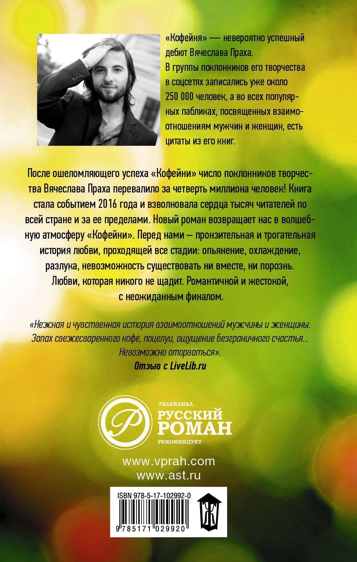 Вячеслав Прах, буквально взорвавший Сеть своим романом «Кофейня», выпустил долгожданное продолжение нашумевшей истории. И это продолжение имеет все шансы быть растасканным на цитаты, как это случилось с его первым романом. Ведь здесь с необычайной выразительной силой показаны все цвета, которые составляют палитру любви, от восторга до отчаяния. Главный герой теряет сперва дочь, а затем возлюбленную. Теперь ему остается лишь вновь и вновь прокручивать, словно старую кинопленку, свои воспоминания, пытаясь найти ответ, кто же тот загадочный убийца, который сломал его жизнь. Но за детективной канвой с неожиданным и трагическим финалом скрывается на самом деле удивительная, трогательная и лиричная история любви. Прах создает воздушный, наполненный призраками и миражами мир двух возлюбленных, мир, где любовь находится на самом кончике пальцев, а прикосновения могут таить в себе как великое блаженство, так и неминуемую гибель. Это роман для тех, кто хочет разобраться в природе чувств, понять, что же такое привязанность, ненависть, ревность, разочарование и надежда. И, пожалуй, лучшим описанием книги, является цитата из нее: "Как жаль, что некоторым птицам суждено разбиться о небо, так и не добравшись до теплых краев".| Издательство | Издательство "АСТ" |
