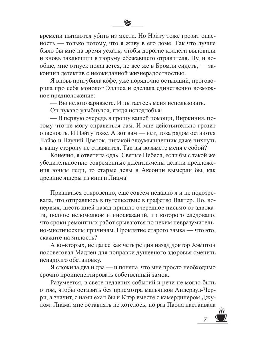 Семейный адвокат, мистер Панч, отправляет леди Виржинии тревожное письмо: ремонт замка приостановлен по «мистическим причинам». Рабочие слышат странные звуки, а кое-кто даже сходит с ума от пережитого ужаса… В ближайшей деревне поговаривают, что виноваты в этом призраки. Однако разве настоящую леди когда-то пугали суеверия? И вот уже она в компании домочадцев торопится в фамильный замок, дабы своими глазами убедиться, что злых духов там и в помине нет. А сопровождает её детектив Эллис - и у него тоже есть причины на некоторое время покинуть Бромли. Вперёд, быстрей - пока не началась метель, и дорогу не замело! Но леди Виржиния ещё не знает, что во владениях Валтеров судьба готовит для неё встречи со старыми врагами, с новыми друзьями... …и с собственным сердцем.| Издательство | Т8 RUGRAM |