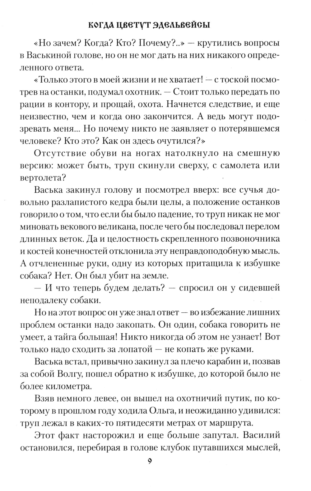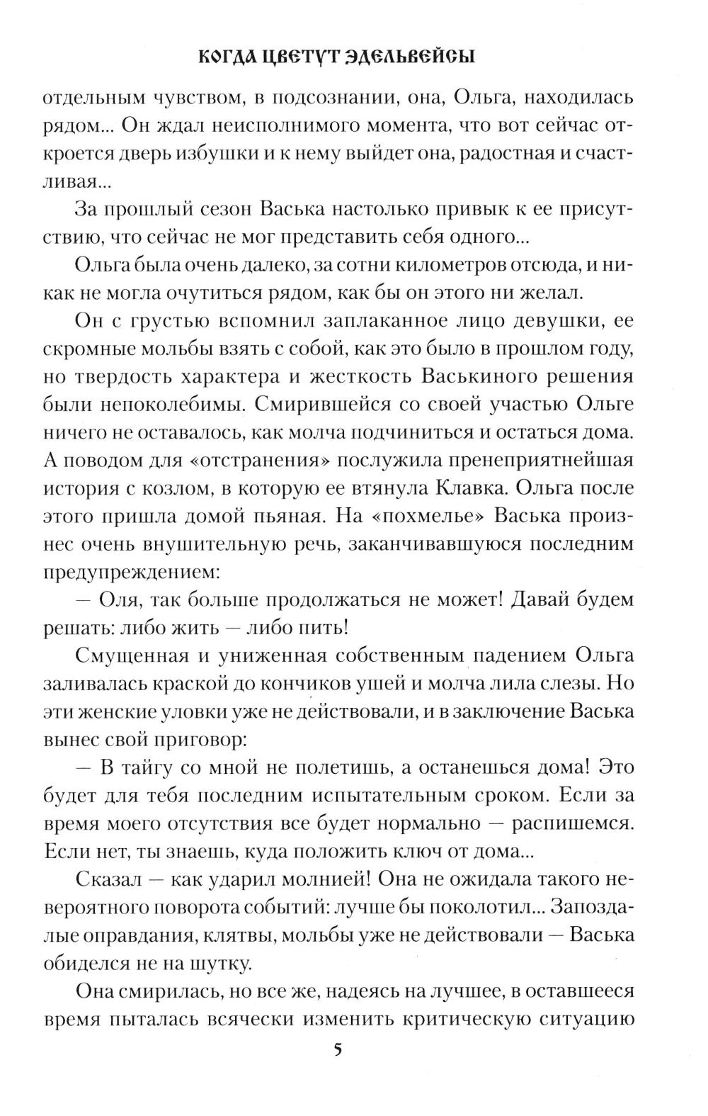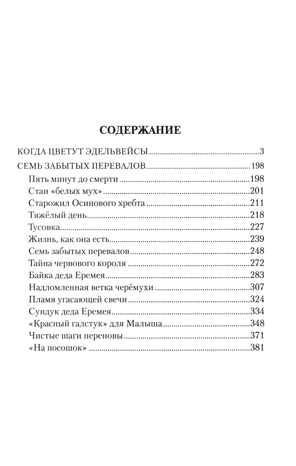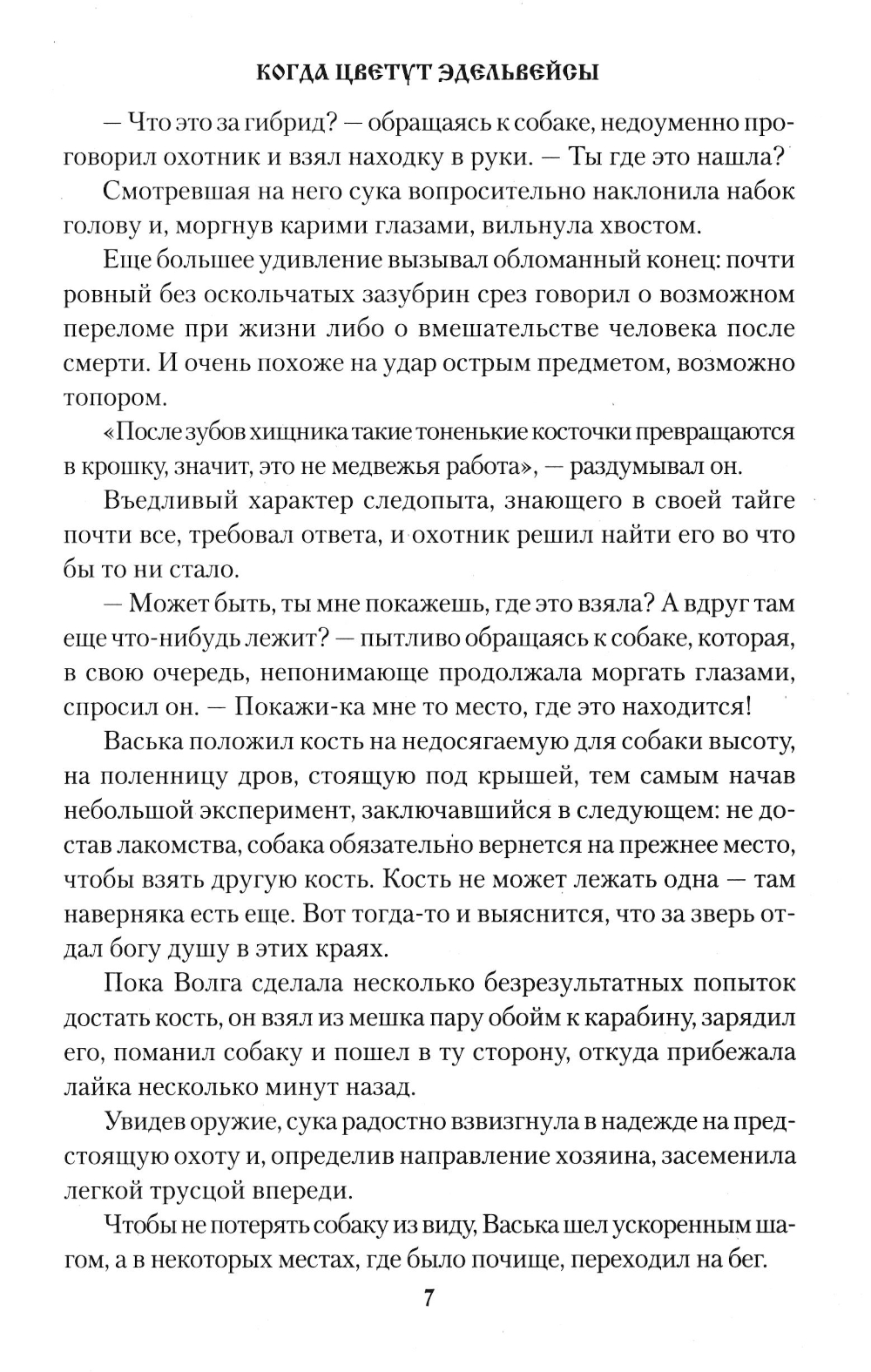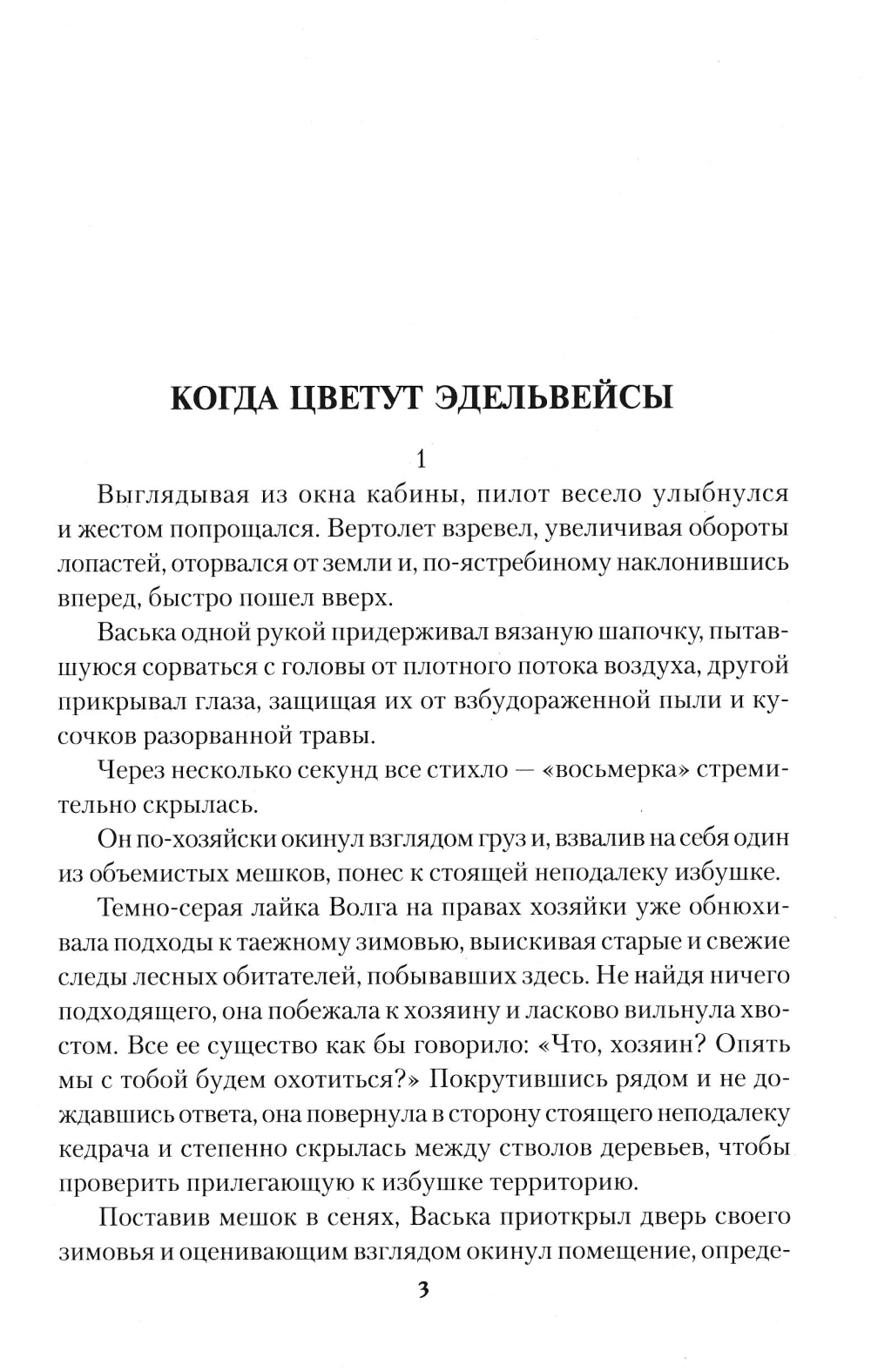 Повесть «Когда цветут эдельвейсы» реальная история профессионального охотника и его избранницы, городской девушки Ольги. Тайга принимает ее далеко не с распростертыми объятиями. Ей приходится постигать премудрости таежной жизни, пройти школу выживания и даже вступить в схватку с медведем. Сюжет повести «Семь забытых перевалов» взят из сибирской глубинки. Старый промысловик, фронтовик дед Еремей большой любитель охоты и тайги, но возраст и ушедшие силы отстранили его от любимого занятия. Некому деду Еремею передать свой опыт и промысловое хозяйство. Дети уехали жить в город. Неожиданным учеником деда в охотничьем деле становится соседский паренек Саша...| Издательство | Вече |