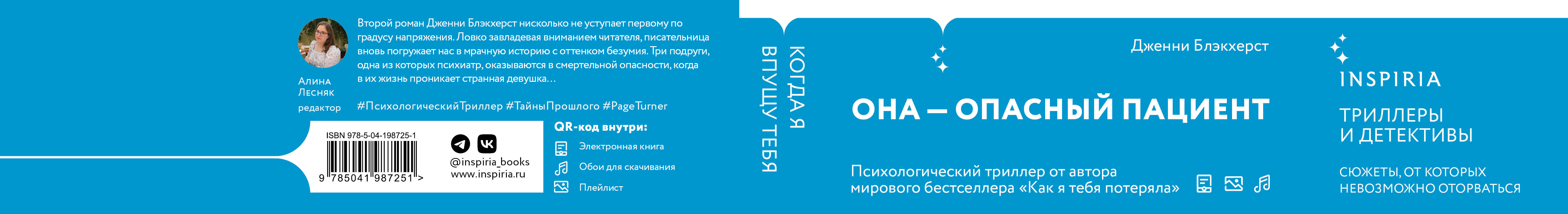 ЛЕДЕНЯЩИЙ ДУШУ ТРИЛЛЕР О ТЕМНОЙ СТОРОНЕ НАШЕГО ПОДСОЗНАНИЯ И ПСИХОТРАВМАХ, СПОСОБНЫХ ДОВЕСТИ ДО БЕЗУМНЫХ ПОСТУПКОВ. ПСИХОЛОГИЧЕСКИЙ РОМАН ОТ АВТОРА МИРОВОГО БЕСТСЕЛЛЕРА «КАК Я ТЕБЯ ПОТЕРЯЛА». Что произойдет, если отношения между психиатром и его пациентом станут не просто напряженными… а смертельно опасными? Карен буквально создана для того, чтобы решать чужие проблемы. Это ее работа как психиатра и ее долг как верной подруги. Но есть тайны, которые она скрывает… Джессика Гамильтон другая. Кажется, она нуждается в помощи, и поэтому обращается к Карен. Вот только девушке известно слишком много о своем докторе. Она знает то, чего не может знать ни один пациент. И рассказывает Карен истории, из которых сквозит неприкрытая угроза ее подругам. А потом эти истории начинают происходить в реальности… И когда однажды ночью Карен подбрасывают странное письмо, она понимает, что должна сделать выбор между врачебной тайной и защитой своих близких… «Я знаю, что вы делаете. Я знаю, что вы натворили». _________________________________________________________ «Блэкхерст дополняет эту захватывающую историю о глубинах и границах дружбы искусными поворотами и хитроумными ложными следами». - Publishers Weekly «Выдающийся и оригинальный триллер, в основе которого сложные отношения между тремя женщинами и взрывной финал». - Б. Э. Пэрис, автор мирового бестселлера «За закрытой дверью» «Притягательная, волнующая и в высшей степени приятная». - Шэрон Болтон, автор остросюжетного романа «Маленькая черная ложь» «Захватывающая, продуманная книга. Я влюбилась в нее, и мне не хотелось, чтобы она заканчивалась». - Клэр Дуглас, автор мирового бестселлера «Пара из дома № 9» «"Когда я впущу тебя" - не только напряженный, пугающий триллер, но и нечто большее: он о выборе, который делают женщины, об осуждении, которое они получают, - о том, как они становятся матерями, об их сексуальной жизни и психологии. Мне понравился этот фантастически ненадежный рассказчик и хорошо подобранные женские образы. Блестяще написано!» - Джиллиан Макаллистер, автор остросюжетных романов «Леденяще-поучительная история о женской дружбе, с героями, которые останутся в вашей памяти надолго после того, как вы перелистнете последнюю страницу». - Люси Доусон, автор остросюжетных романов| Издательство | ООО "Издательство "Эксмо" |