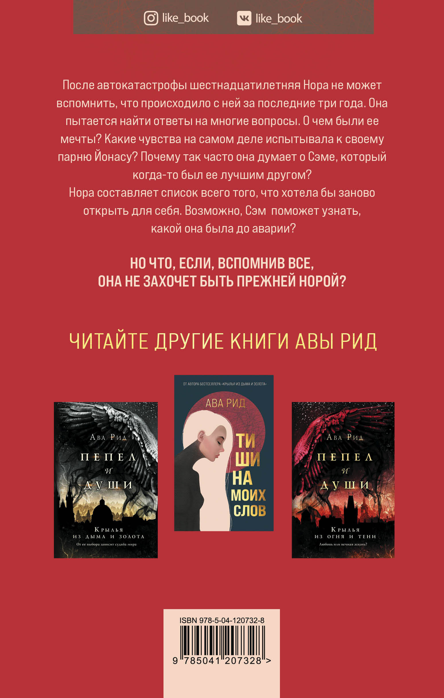 «Когда я закрываю глаза» - новый роман Авы Рид, автора бестселлеров «Крылья из дыма и золота» и «Крылья из огня и тени». Роман о настоящих чувствах, верности, дружбе, поисках себя, давлении со стороны сверстников и главное - любви к себе. После автокатастрофы шестнадцатилетняя Нора не может вспомнить, что происходило с ней за последние три года. Она пытается найти ответы на многие вопросы. О чем были ее мечты? Какие чувства на самом деле испытывала к своему парню Йонасу? Почему так часто она думает о Сэме, который когда-то был лучшим другом? Нора составляет список всего того, что хотела бы заново открыть для себя. Возможно, Сэм поможет узнать, какой она была до аварии? Но что, если, вспомнив все, она не захочет быть прежней Норой? Ава Рид - популярная немецкая YA-писательница и блогер. Она дважды выиграла приз читателей Lovelybooks, крупнейшего немецкого книжного сообщества. Суммарный тираж ее проданных книг в Германии составляет более 50 000 экземпляров.| Издательство | ООО "Издательство "Эксмо" |