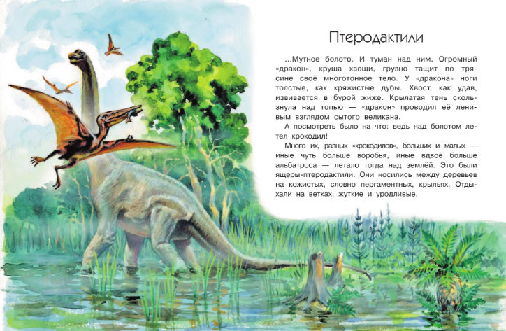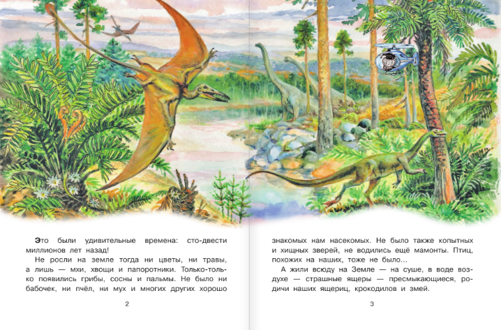 Времена: сто-двести миллионов лет назад! Не росли на земле тогда ни цветы, ни травы, а лишь - мхи, хвощи и папоротники. Только-только появились грибы, сосны и пальмы. Не было ни бабочек, ни пчёл, ни мух и многих других хорошо знакомых нам насекомых. Не было также копытных и хищных зверей, не водились ещё мамонты. Птиц, похожих на наших, тоже не было. А жили всюду на Земле - на суше, в воде и воздухе - страшные ящеры динозавры - пресмыкающиеся, родичи наших ящериц, крокодилов и змей.