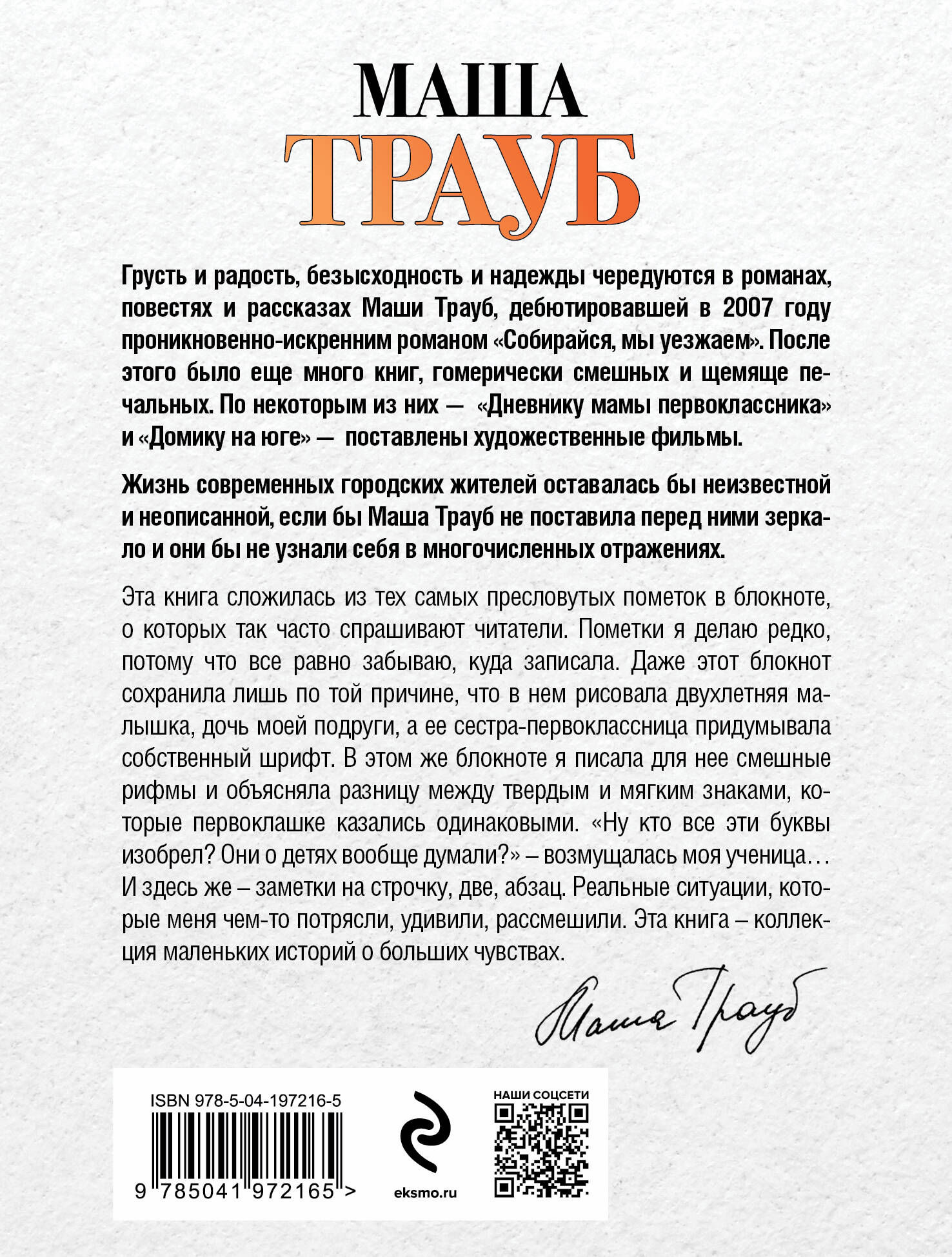 В этой книге вы найдете всё, за что цените Машу Трауб: легкий слог, мгновенный переход от комического к трагическому, героев, которые и похожи на ваших друзей и родных, и чем-то неуловимо отличаются от всех остальных людей. «Когда мама - это ты», которую сама автор определяет как «коллекцию маленьких историй о больших чувствах», густо заселена персонажами: вот маленькая девочка, которая не понимает разницу между твердым и мягким знаками, вот повариха из пионерлагеря, у которой сердце давно покрылось коростой; вот девочка из номенклатурной семьи, которую родители прислали в лагерь «для социализации», и ее подружка, которую те же родители выбрали на роль приживалки. Маша перемещает нас из эпохи в эпоху - от советских времен до нынешних, выводя на сцену одного героя за другим, заставляя нас сопереживать и возмущаться. И неизменно восхищаться талантом автора - непревзойденной рассказчицы, подмечающей в обычной жизни то, что скрыто для других.| Издательство | ООО "Издательство "Эксмо" |