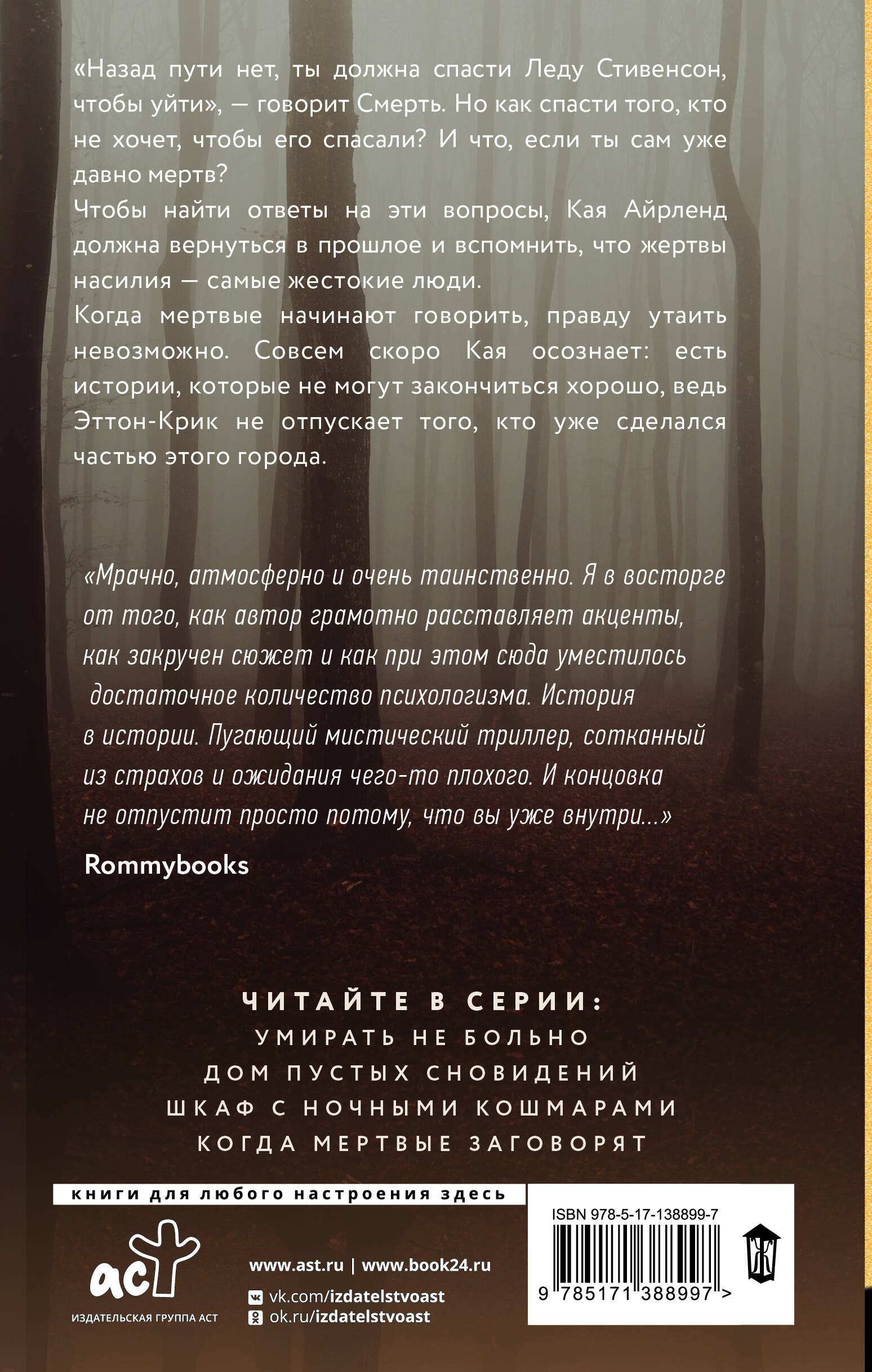 "Назад пути нет, ты должна спасти Леду Стивенсон, чтобы уйти", - говорит Смерть. Но как спасти того, кто не хочет, чтобы его спасали? И что, если ты сам уже давно мертв? Чтобы найти ответы на эти вопросы, Кая Айрленд должна вернуться в прошлое и вспомнить, что жертвы насилия - самые жестокие люди. Когда мертвые начинают говорить, правду утаить невозможно. Совсем скоро Кая осознает: есть истории, которые не могут закончиться хорошо, ведь Эттон-Крик не отпускает того, кто уже сделался частью этого города.| Издательство | АСТ |