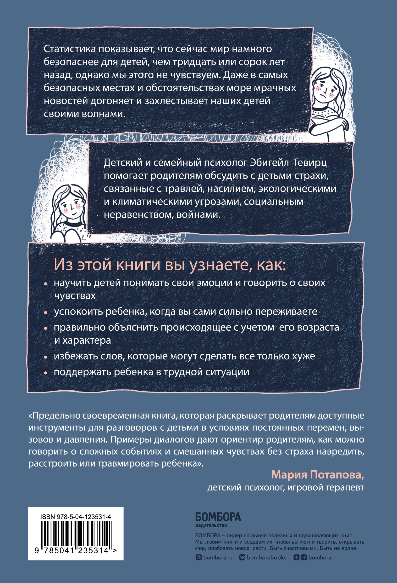 Мы хотим не только чтобы наши дети были в безопасности, но и чтобы они чувствовали себя в безопасности, ведь уберечь их от страхов бывает даже труднее, чем от реальной угрозы. И мы никогда не знаем, где и когда они могут услышать или увидеть то, что их напугает. Детский и семейный психолог Эбигейл Мориц помогает родителям обсудить с детьми страхи, связанные с травлей, насилием, экологическими и климатическими угрозами, социальным неравенством, войнами. Из этой книги вы узнаете, как: ● научить детей понимать свои эмоции и говорить о своих чувствах; ● успокоить ребенка, когда вы сами сильно переживаете; ● правильно объяснить происходящее с учетом его возраста и характера; ● избежать слов, которые могут сделать все только хуже; ● поддержать ребенка в трудной ситуации.