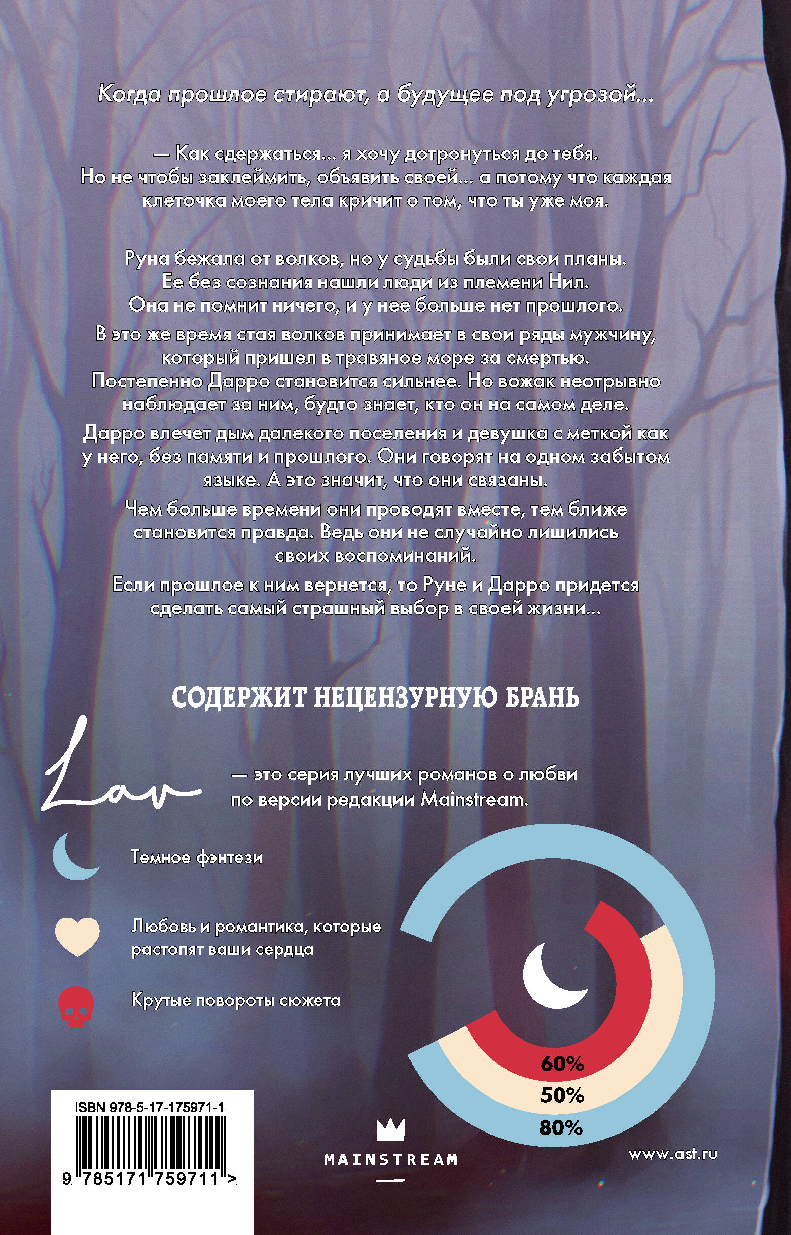 Когда прошлое стирают, а будущее под угрозой... - Как сдержаться... я хочу дотронуться до тебя. Но не чтобы заклеймить, объявить своей... а потому что каждая клеточка моего тела кричит о том, что ты уже моя. Руна бежала от волков, но у судьбы были свои планы. Ее без сознания нашли люди из племени Нил. Она не помнит ничего, и у нее больше нет прошлого. В это же время стая волков принимает в свои ряды мужчину, который пришел в травяное море за смертью. Постепенно Дарро становится сильнее. Но вожак неотрывно наблюдает за ним, будто знает, кто он на самом деле. Дарро влечет дым далекого поселения и девушка с меткой как у него, без памяти и прошлого. Они говорят на одном забытом языке. А это значит, что они связаны. Чем больше времени они проводят вместе, тем ближе становится правда. Ведь они не случайно лишились своих воспоминаний. Если прошлое к ним вернется, то Руне и Дарро придется сделать самый страшный выбор в своей жизни...| Издательство | Издательство "АСТ" |