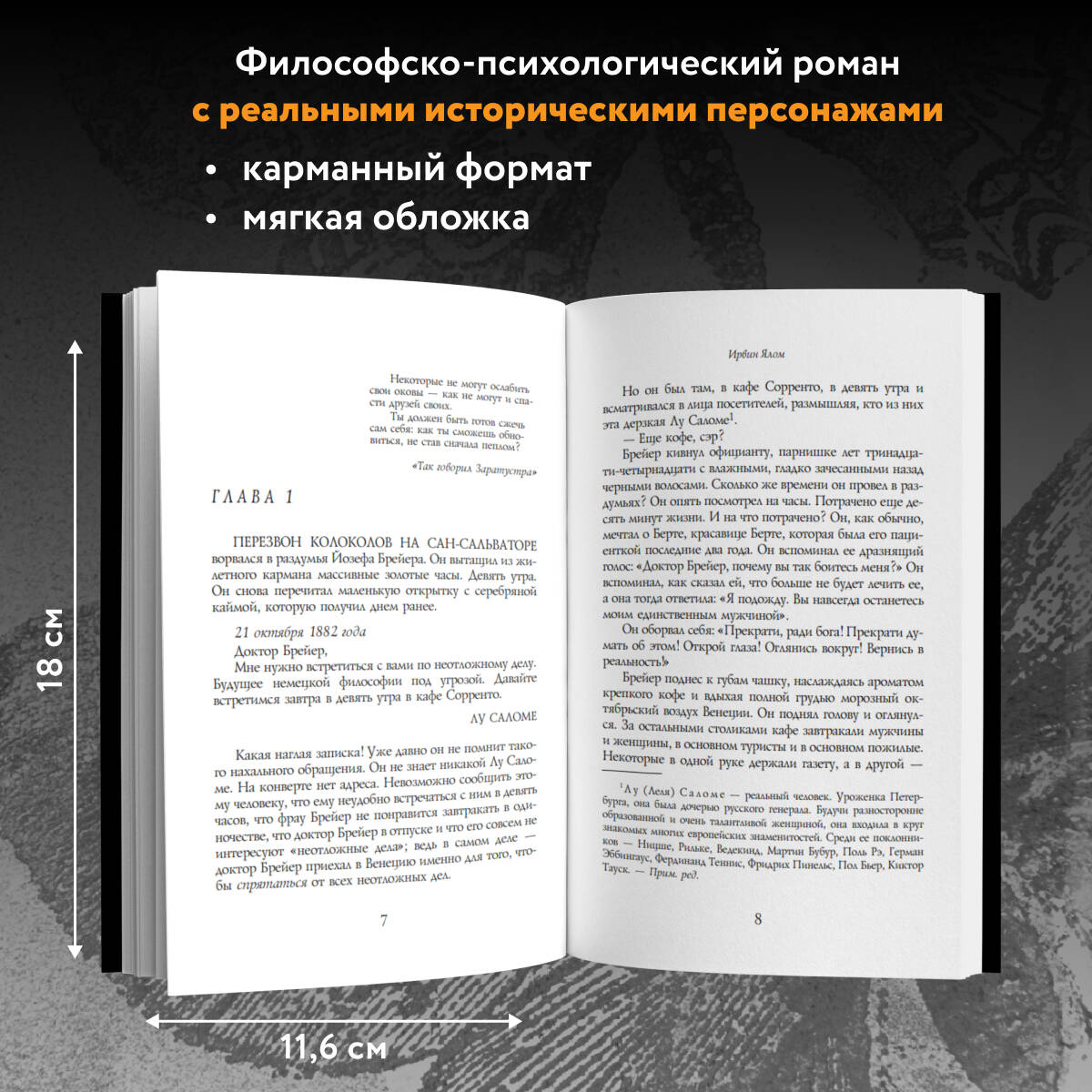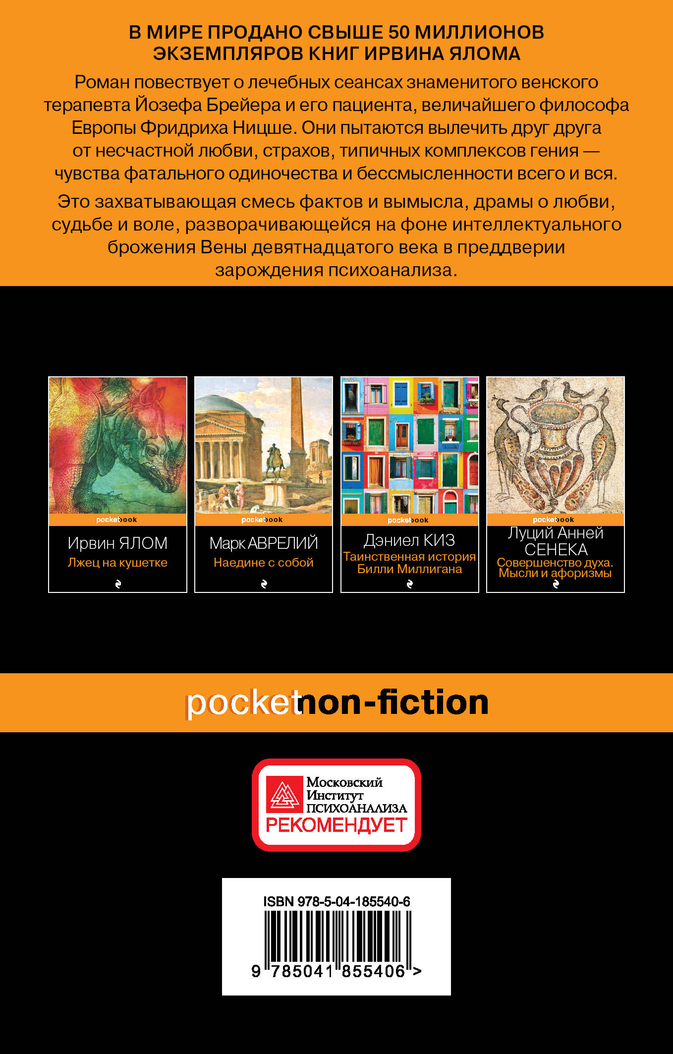 Автор многочисленных бестселлеров Ирвин Ялом представляет вашему вниманию захватывающую смесь фактов и вымысла, драму о любви, судьбе и воле, разворачивающуюся на фоне интеллектуального брожения Вены девятнадцатого века, в преддверии зарождения психоанализа. Незаурядный пациент... Талантливый лекарь, терзаемый мучениями... Тайный договор. Соединение этих элементов порождает незабываемую сагу будто бы имевших место взаимоотношений величайшего философа Европы (Ф. Ницше) и одного из отцов-основателей психоанализа (Й. Брейера). Ялом втягивает в действие не только Ницше и Брейера, но и Лу Саломе, «Анну О.» и молодого медика-интерна Зигмунда Фрейда.