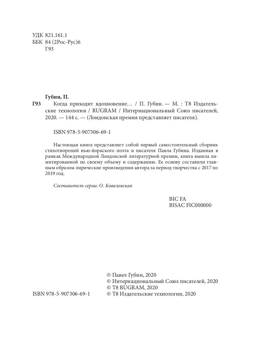 Настоящая книга представляет собой первый самостоятельный сборник стихотворений нью-йоркского поэта и писателя Павла Губина. Изданная в рамках Международной Лондонской литературной премии, книга вышла лимитированной по своему объему и содержанию. Ее основу составили главным образом лирические произведения автора за период творчества с 2017 по 2019 год.