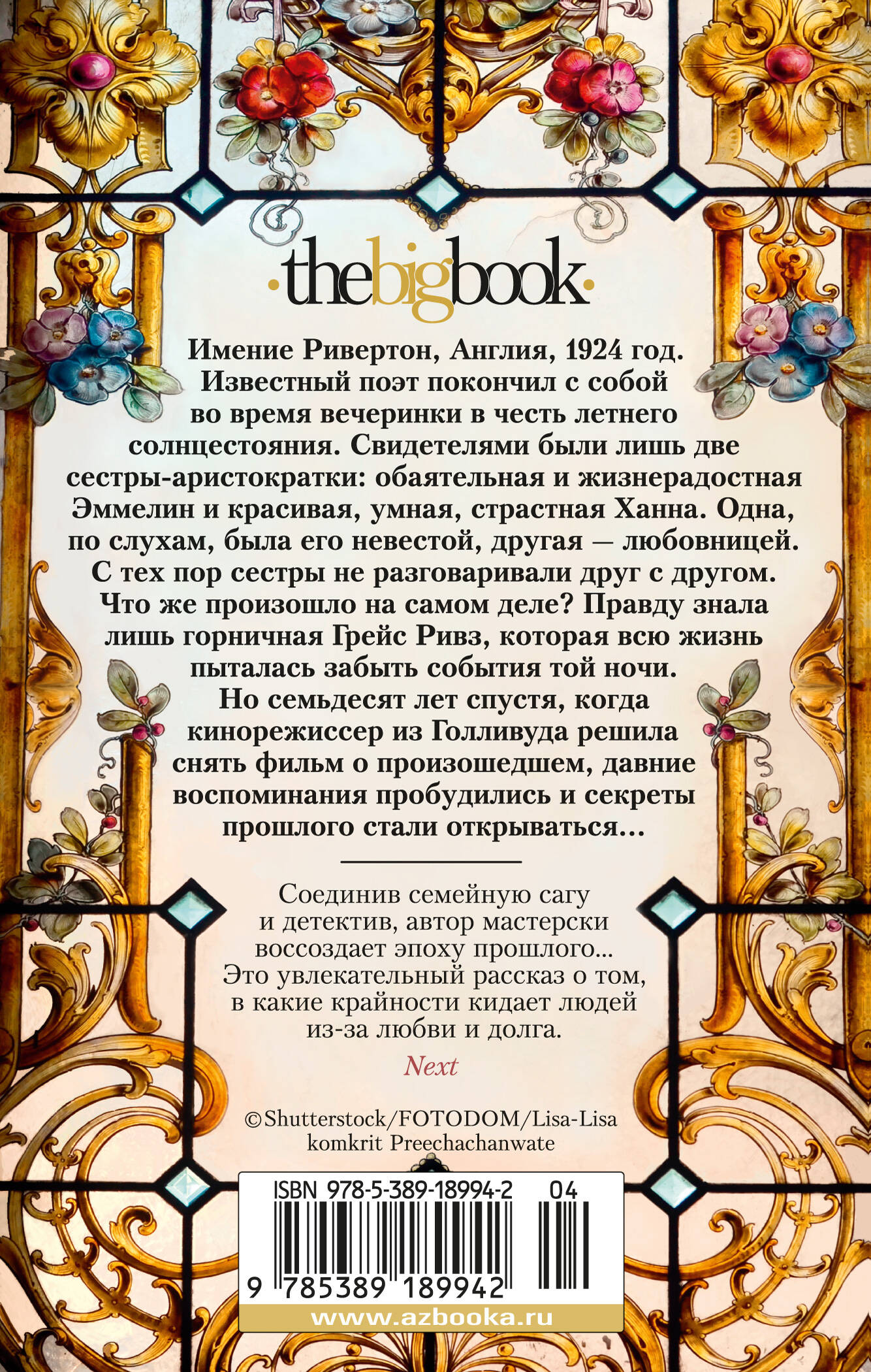 Имение Ривертон, Англия, 1924 год. Известный поэт покончил с собой во время вечеринки в честь летнего солнцестояния. Свидетелями были лишь две сестры-аристократки: обаятельная и жизнерадостная Эммелин, и красивая, умная, страстная Ханна. Одна - по слухам, была его невестой, другая - любовницей. С тех пор сестры не разговаривали друг с другом. Что же произошло на самом деле? Правду знала лишь горничная Грейс Ривз, которая всю жизнь пыталась забыть события той ночи. Но семьдесят лет спустя, когда кинорежиссер из Голливуда решила снять фильм о произошедшем, давние воспоминания пробудились и секреты прошлого стали открываться...| Издательство | Азбука-Аттикус Издат.группа ООО |
