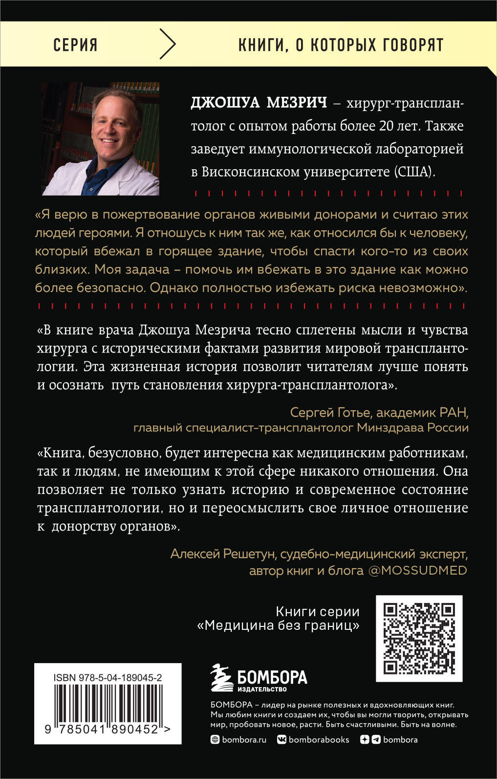Об авторе Джошуа Мезрич - хирург-трансплантолог с опытом работы более 20 лет. Также заведует иммунологической лабораторией в Висконсинском университете (США). Живет в Мэдисоне с женой и двумя дочками. О чем книга Эта книга проливает свет на одно из самых важных и значимых достижений современной медицины: пересадку органов от человека к человеку, позволившее миллионам людей обрести шансы на достойное существование и даже на жизнь. Автор обращается к захватывающей истории трансплантологии и проводит параллель с вдохновляющими, а иногда и душераздирающими историями своих пациентов. Большинство врачей борются со смертью, но трансплантологи благодаря невероятному обмену между живыми и мертвыми, как это ни парадоксально, получают от нее выгоду. Особенности книги Джошуа Мезрич поднимает интересные этические и философские вопросы: - На какой риск допустимо пойти здоровому человеку, чтобы спасти того, кто ему дорог? - Может ли алкоголик рассчитывать на донорскую печень? - Что такое смерть и какую роль пересадка органов сыграла в ее определении? «Книга безусловно будет интересна как медицинским работникам, так и людям, не имеющим к этой сфере никакого отношения. Она позволяет не только узнать историю и современное состояние трансплантологии, но и переосмыслить свое личное отношение к донорству органов». - Алексей Решетун, судебно-медицинский эксперт Бюро СМЭ Москвы, автор книги «Вскрытие покажет: Записки увлеченного судмедэксперта» и блога mossudmed. livejournal. com| Издательство | ООО "Издательство "Эксмо" |