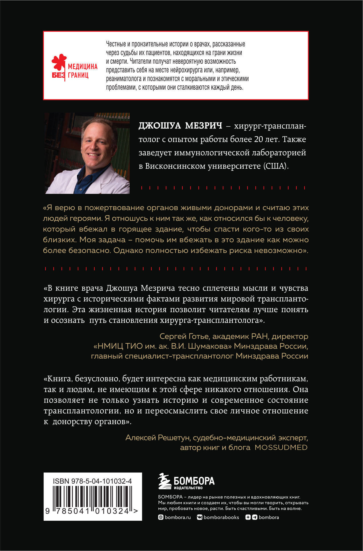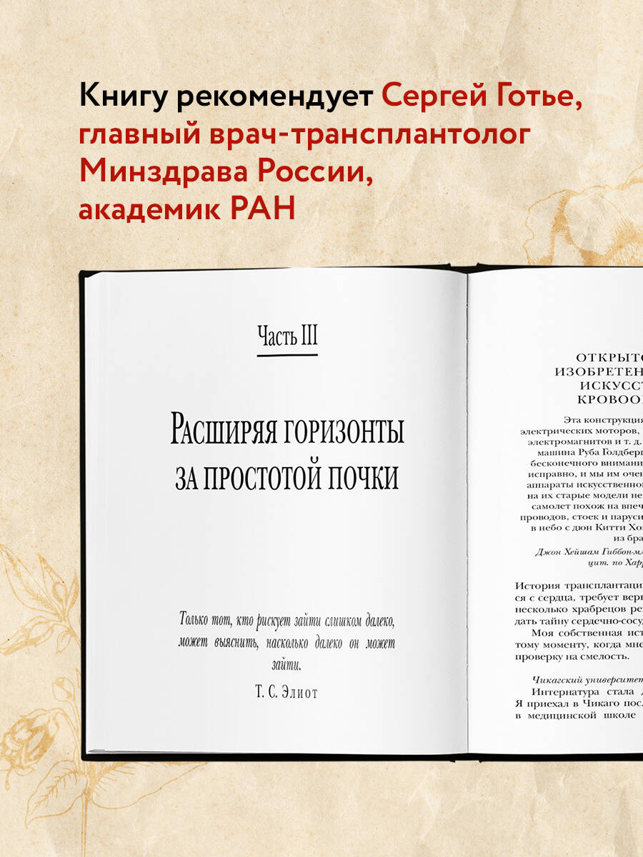 Об авторе: Джошуа Мезрич - хирург-трансплантолог с опытом работы более 20 лет. Также заведует иммунологической лабораторией в Висконсинском университете (США). Живет в Мэдисоне с женой и двумя дочками. О чем книга: Эта книга проливает свет на одно из самых важных и значимых достижений современной медицины: пересадку органов от человека к человеку, позволившее миллионам людей обрести шансы на достойное существование и даже на жизнь. Автор обращается к захватывающей истории трансплантологии и проводит параллель с вдохновляющими, а иногда и душераздирающими историями своих пациентов. Большинство врачей борются со смертью, но трансплантологи благодаря невероятному обмену между живыми и мертвыми, как это ни парадоксально, получают от нее выгоду. Особенности книги: Джошуа Мезрич поднимает интересные этические и философские вопросы: - На какой риск допустимо пойти здоровому человеку, чтобы спасти того, кто ему дорог? - Может ли алкоголик рассчитывать на донорскую печень? - Что такое смерть и какую роль пересадка органов сыграла в ее определении? Интересные факты: - Трансплантология - это раздел медицины, основанный на умении сшивать кровеносные сосуды, по которым кровь поступает в новый орган. - Каждый донорский орган упаковывается в три стерильных пакета для защиты. - При трансплантации почки обычно не удаляют больной орган, а помещают новую почку ниже, подключая ее к кровеносным сосудам, идущим по ноге. - Только что пересаженная почка розовеет и начинает брызгать мочой на операционное поле и руки хирургов. И это норма! - Пересадка кожи всегда заканчивается отторжением, это временная мера, для стабилизации пациента. - По неизвестным еще причинам, легкие подвержены уникальному типу хронического отторжения, который ограничивает продолжительность жизни. Люди живут от года до пяти лет после пересадки. - Пересадка поджелудочной железы, в отличие от других органов, отвечает не за саму жизнь, а за ее качество! Пациентам больше не надо следить за уровнем сахара в крови, так они избавляются от диабета. - Органы от пожилых доноров могут работать исправно, но они капризны и не любят холод: их нужно как можно быстрее пересадить. - Остановка сердца до его удаления приводит к необратимым повреждениям органа. Отзывы: «В книге врача Джошуа Мезрича тесно сплетены мысли и чувства хирурга с историческими фактами развития мировой трансплантологии. Эта жизненная история позволяет лучше понять и осознать читателям путь становления хирурга-трансплантолога». - Сергей Готье, академик РАН, директор «НМИЦ ТИО им. ак. В. И. Шумакова» Минздрава России, главный специалист-трансплантолог Минздрава России «Книга безусловно будет интересна как медицинским работникам, так и людям, не имеющим к этой сфере никакого отношения. Она позволяет не только узнать историю и современное состояние трансплантологии, но и переосмыслить свое личное отношение к донорству органов». - Алексей Решетун, судебно-медицинский эксперт Бюро СМЭ Москвы, автор книги «Вскрытие покажет: Записки увлеченного судмедэксперта» и блога mossudmed. livejournal. com «Книга известного американского хирурга читается на одном дыхании, как детективный роман. Джошуа Мезрич не только в занимательной форме изложил историю мировой трансплантологии, но и взглядом изнутри этой сложнейшей медицинской отрасли осветил