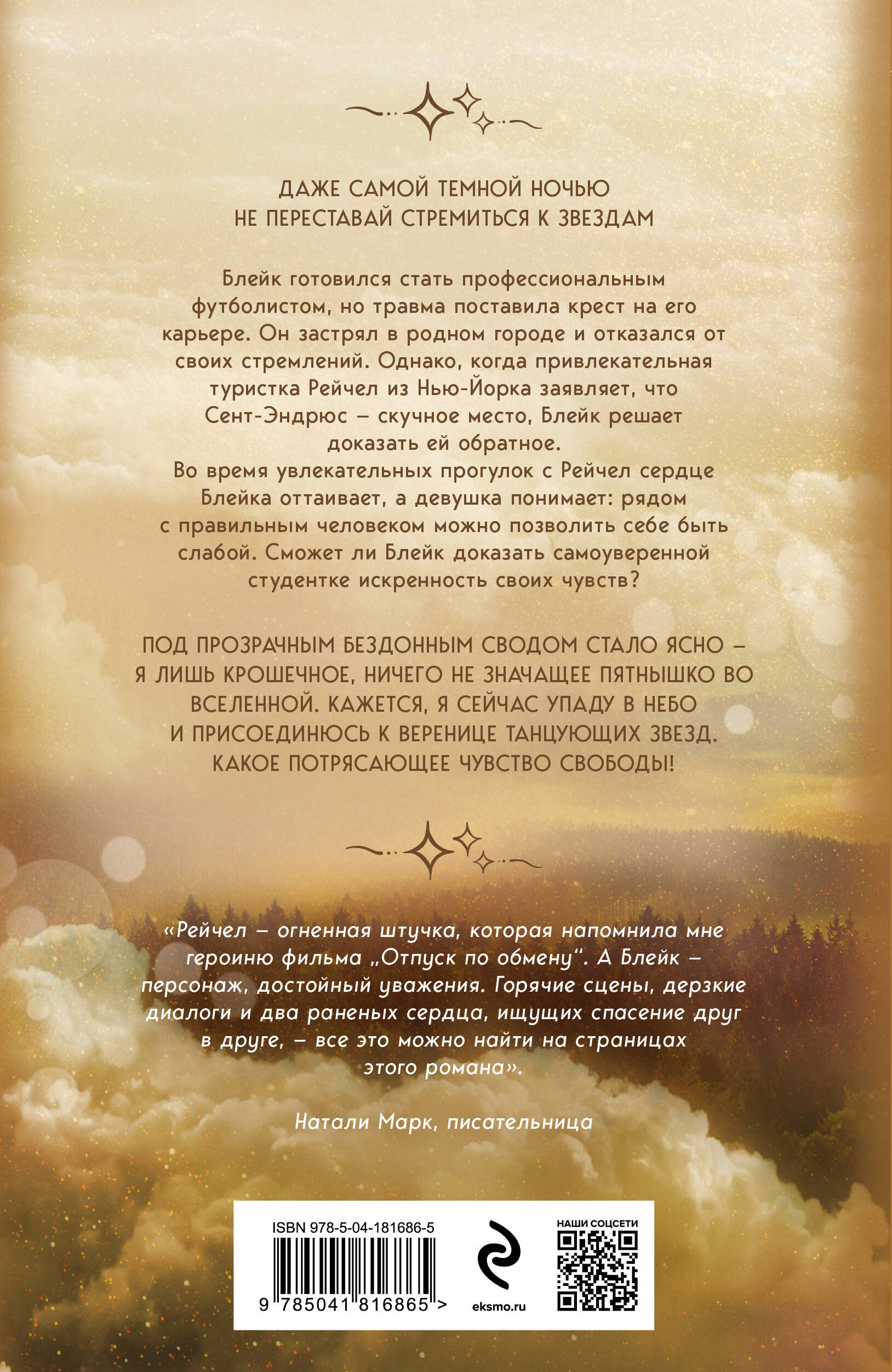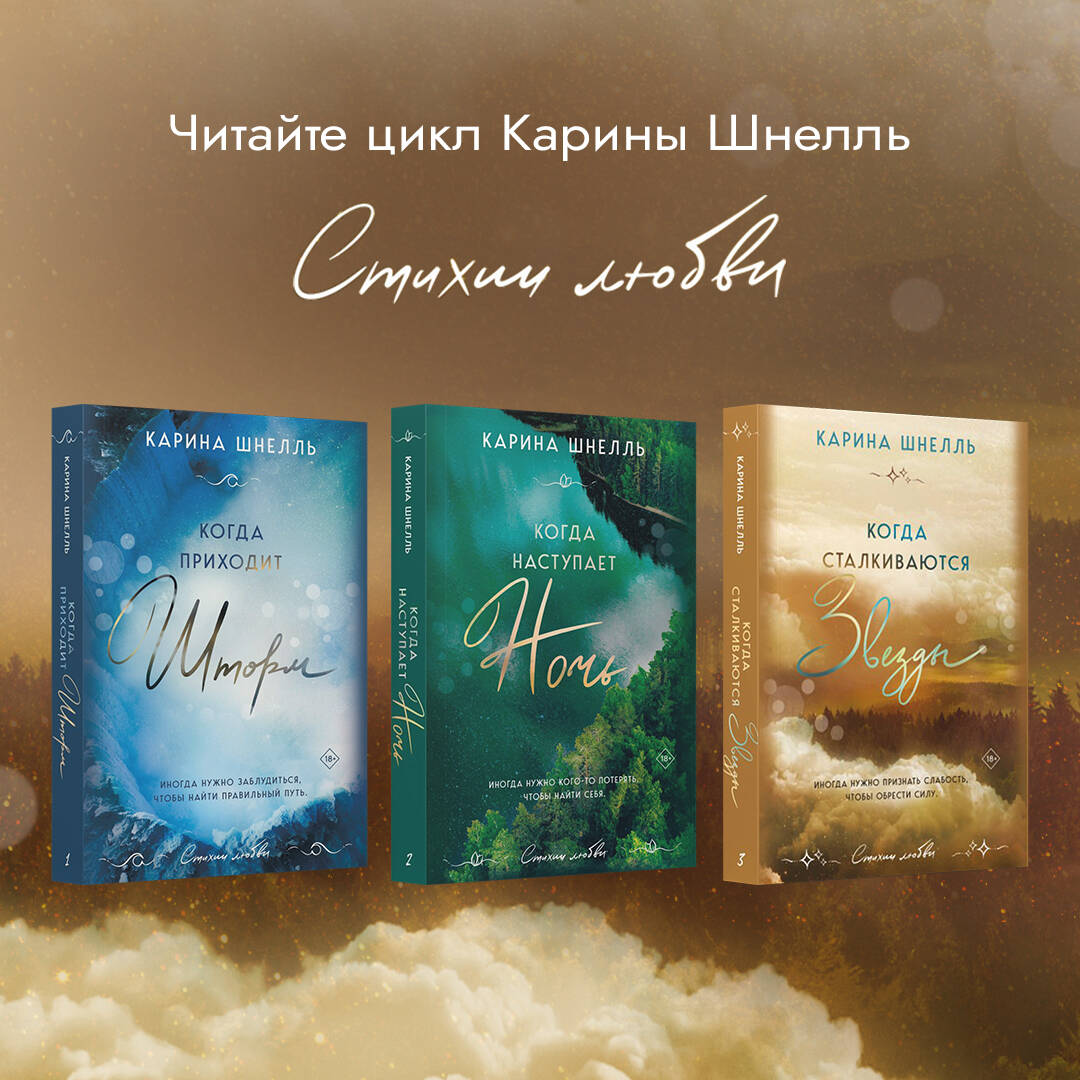Долгожданный немецкий цикл Карины Шнелль «Лето в Канаде» состоит из трех книг: «Когда приходит шторм», «Когда наступает ночь», «Когда сталкиваются звезды». Эти истории любви на фоне невероятной природы не только увлекательны, но и полезны, потому что многие читатели увидят в главных героях себя. Покет большого формата с запечатанными клапанами, дополнительным контентом к книге, закрашенным обрезом и сияющей фольгой. Идеальный подарок для любителей качественных современных романов, которые хочется поставить в свой книжный шкаф на самое видное место. Даже самой темной ночью не переставай стремиться к звездам... Блейк готовился стать профессиональным футболистом, но травма поставила крест на его карьере. Он застрял в родном городе и отказался от своих стремлений. Но когда привлекательная туристка Рейчел из Нью-Йорка заявляет, что Сент-Эндрюс - скучное место, Блейк решает доказать ей обратное. Во время увлекательных прогулок с Рейчел сердце Блейка оттаивает, а девушка понимает: рядом с правильным человеком можно позволить себе быть слабой. Но сможет ли Блейк доказать самоуверенной студентке искренность своих чувств? «Под прозрачным бездонным сводом стало ясно - я лишь крошечное, ничего не значащее пятнышко во Вселенной. Кажется, я сейчас упаду в небо и присоединюсь к веренице танцующих звезд. Какое потрясающее чувство свободы!» «Рейчел - огненная штучка, которая напомнила мне героиню фильма "Отпуск по обмену". А Блейк - персонаж, достойный уважения. Горячие сцены, дерзкие диалоги и два раненых сердца, ищущих спасение друг в друге, - все это можно найти на страницах этого романа». - Натали Марк, писательница| Издательство | ООО "Издательство "Эксмо" |