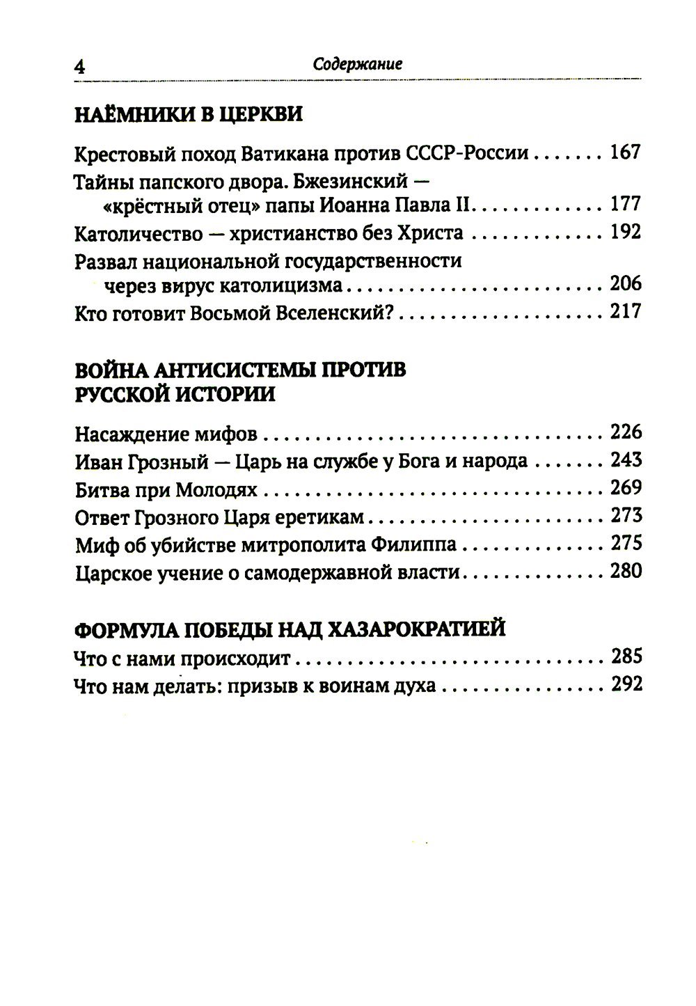 Кому нужна новая мировая валюта? Какие эксперименты с биологическим оружием проводились на Украине в начале 2000-х годов? К чему привели преступные реформы в отечественной армии и на флоте? Кому принадлежат российские леса и водоёмы? Почему католичество - религия дьявола, и чем грозит всеобщая цифровизация? Сегодня на русский народ возложена великая миссия: пресечь дезинформационные потоки, выработать механизм противостояния западной олигархии, уничтожить воцарившуюся хазарократию и не потерять национальную идентичность. Каждому из нас нужно очнуться и осознать масштаб чудовищного плана, разработанного Глобальным каганатом для уничтожения не только нашей страны, но и всего человечества. Книга Татьяны Грачёвой будет интересна всем, кто неравнодушен к происходящим мировым событиям, не желает ограничиваться общедоступной информацией и хочет знать честные ответы на многие вопросы, которые усердно обходят своим вниманием СМИ.| Издательство | Концептуал |