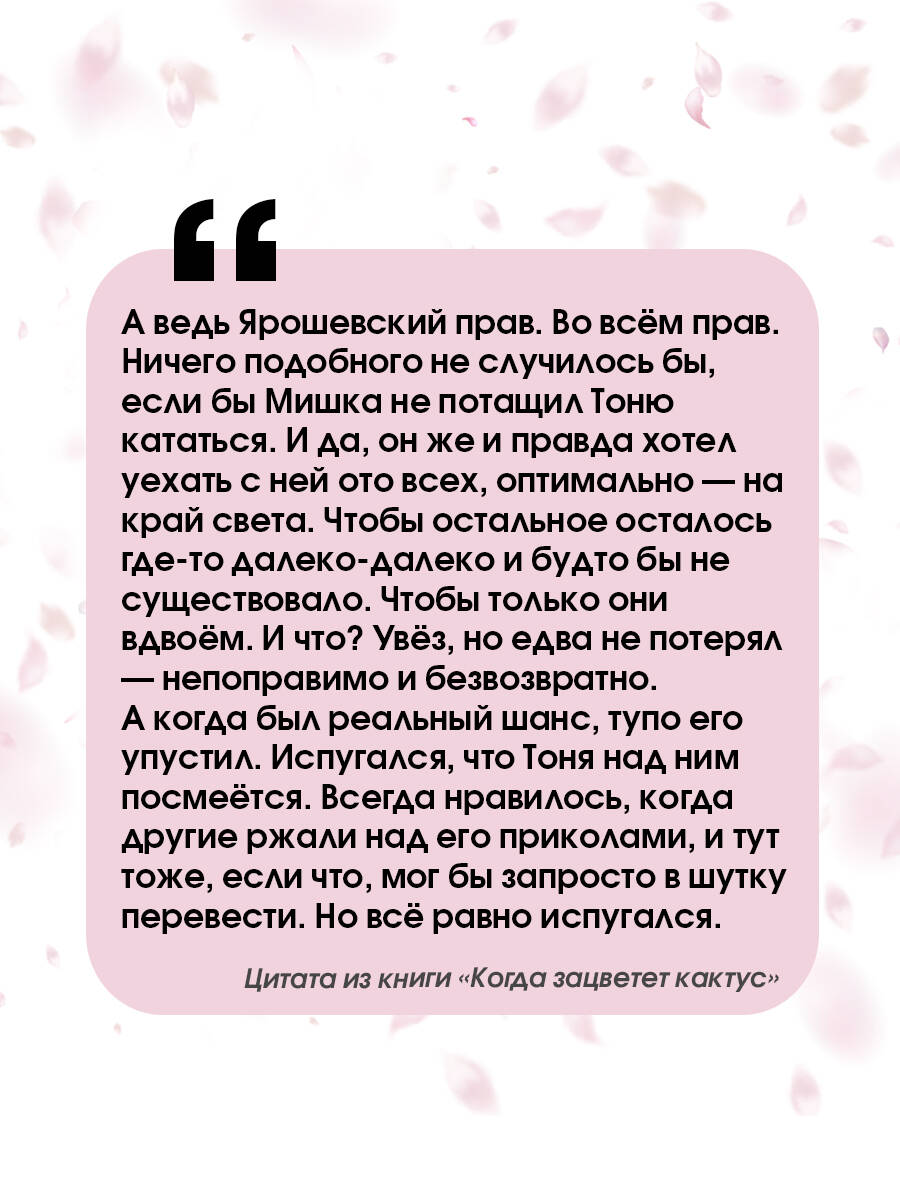 Эта трогательная зимняя история началась довольно своеобразно - с вранья. Тоня ляпнула самой крутой девчонке во дворе, что встречается с парнем. Да таким, о котором можно только мечтать! Но никакого парня, даже самого заурядного, на Тонином горизонте не было… Хорошо ещё, что Мишка, одноклассник и вечный клоун, выручил - пообещал сыграть роль крутого Тониного бойфренда. Чем обернётся этот розыгрыш, узнаете из книги Эльвиры Смелик «Когда зацветёт кактус».| Издательство | Издательство "АСТ" |