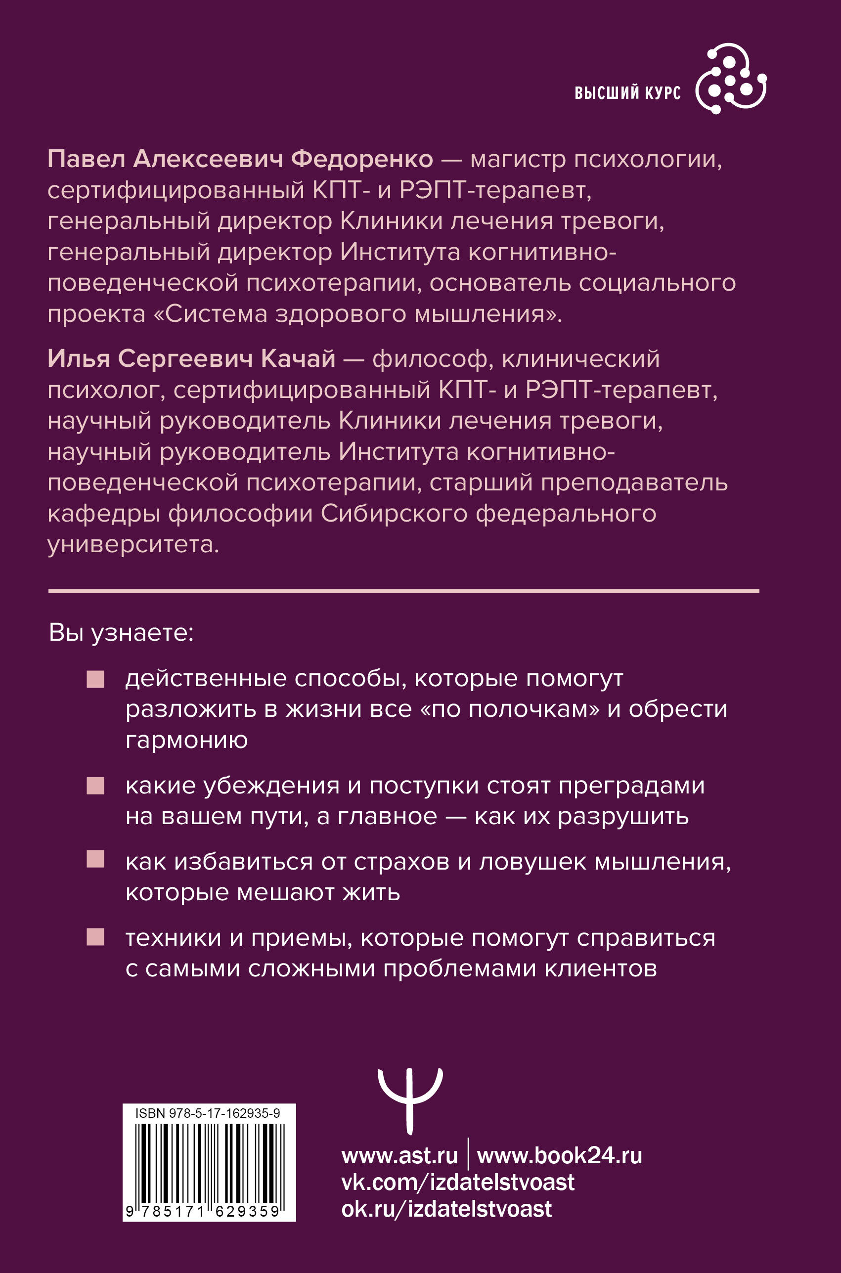 Авторы бестселлеров по психологии и специалисты в области когнитивно-поведенческой терапии, психологи Павел Федоренко и Илья Качай предлагают изменить жизнь с помощью проверенной действенной методики. Устали жить "на автомате" и плыть по течению? На душе постоянная тревога, грусть и неудовлетворенность? А, может, вы психолог, который стремится увеличить поток клиентов и ищет действенные способы помочь людям изменить себя и мышление? Книга станет другом и для человека, желающего разложить все "по полочкам" в своей жизни, и для практикующего специалиста. Вы избавитесь от страхов и ловушек мышления, которые мешают жить, научитесь "читать" мысли, выявлять скрытые эмоции и ложные убеждения, справитесь со стрессом, неуверенностью, депрессией и выйдете из жизненного кризиса. А специалисты углубят знания в области психотерапии, узнают техники и приемы, которые помогут справиться со сложными проблемами клиентов, настроят на продуктивную работу и расширят клиентскую базу. Осторожно, после прочтения книги жизнь неизбежно изменится к лучшему!| Издательство | Издательство "АСТ" |