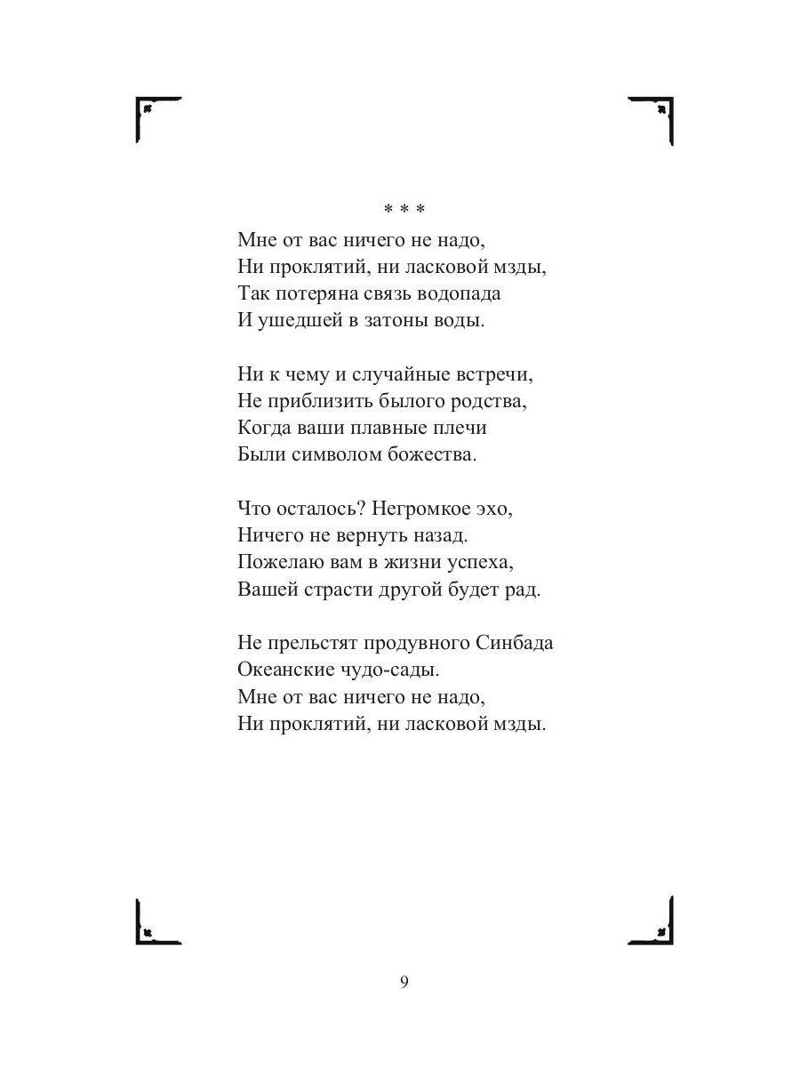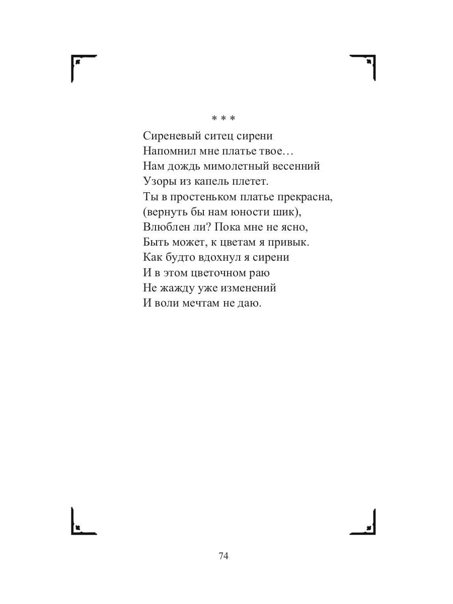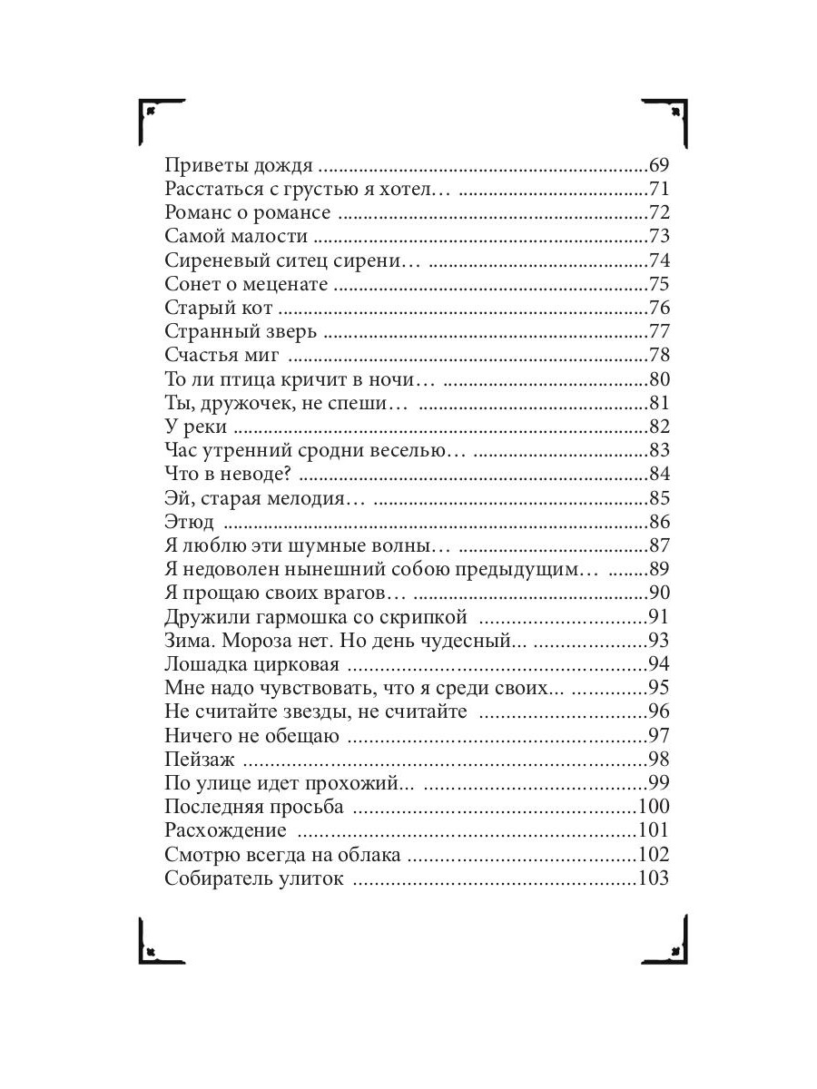 В этой небольшой книге много новых стихотворений. Как и в предыдущих, это - философские размышления, любовная лирика, мысли о связи человека с природой, о творчестве, о месте каждого из нас на Земле. Стихи автора отличают искренность и напевность. Недаром на них написано десятки песен и романсов, которые исполняются профессиональными певцами и самодеятельными коллективами.