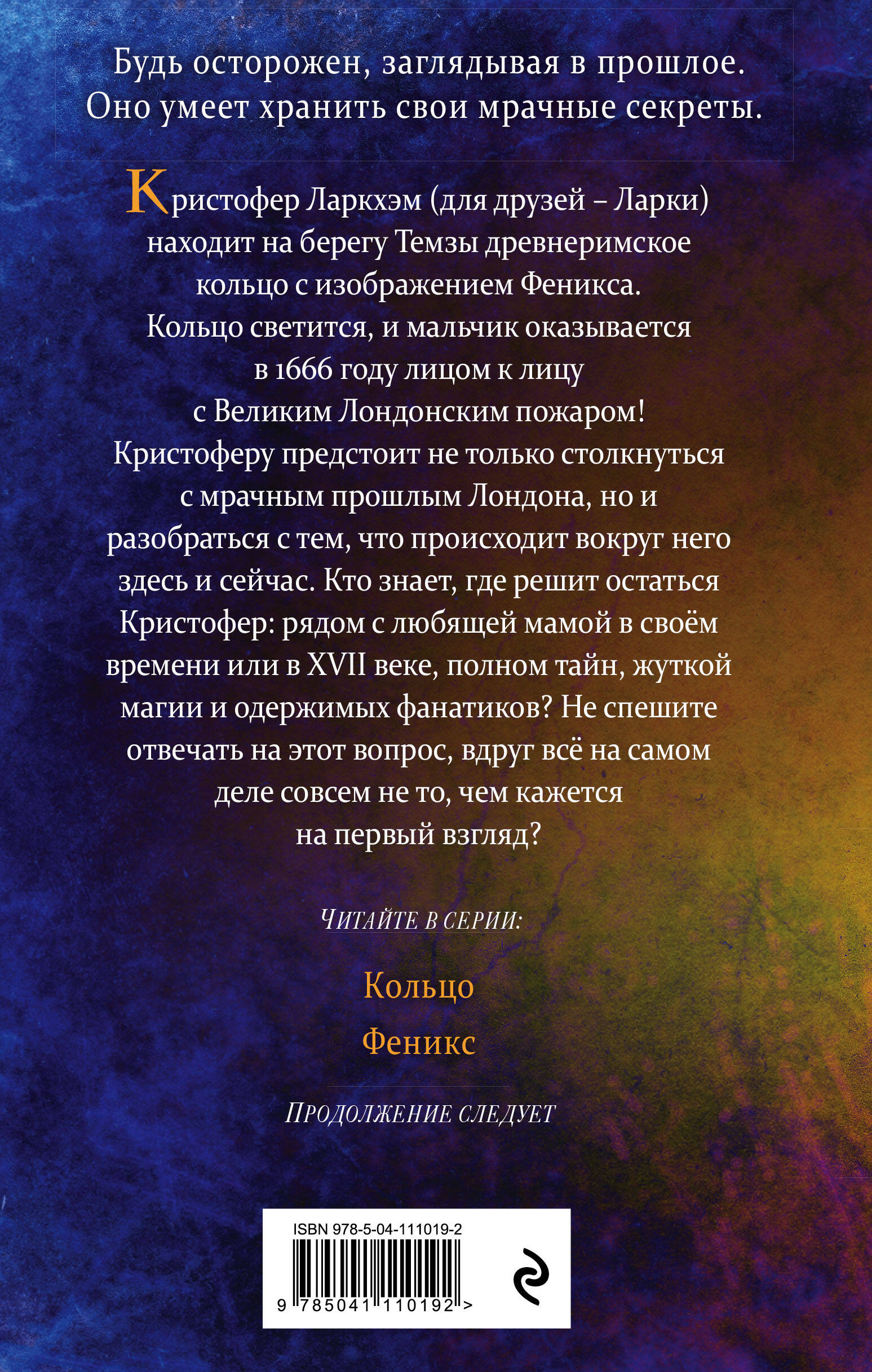 Кристофер находит на берегу Темзы древнеримское кольцо с изображением феникса. Кольцо светится, и мальчик оказывается в 1666 году лицом к лицу с Великим Лондонским пожаром! Кристоферу предстоит не только столкнуться с мрачным прошлым Лондона, но и разобраться с тем, что происходит вокруг него здесь и сейчас. Кто знает, где решит остаться Кристофер: рядом с любящей мамой в своём времени или в XVII веке, полном тайн, жуткой магии и одержимых фанатиков? Эффектное оформление, стильная обложка. А как бы поступил ты, оказавшись на месте Кристофера? Фанатики, пожары и антисанитария с одной стороны, и бомбы и вечно занятые чем-то родители - с другой! И, в конце концов, что это за таинственное кольцо, способное переносить в другую эпоху? И почему именно Кристофер нашёл его?!| Издательство | ООО "Издательство "Эксмо" |