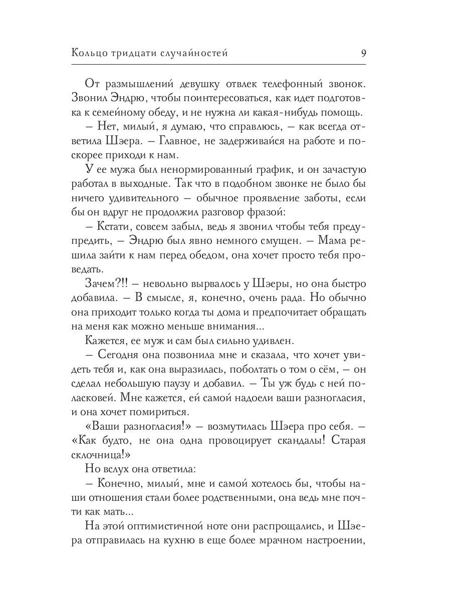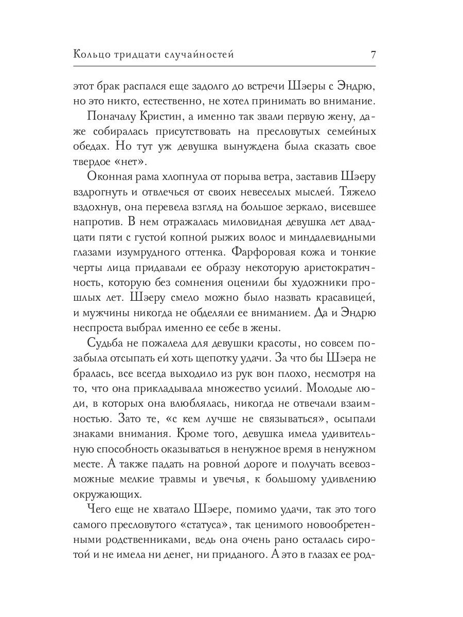 Кольцо тридцати случайностей - современный роман-сказка о любви, выполненный в стиле тёмного фэнтези. Судьба главной героини изменилась в одночасье! И всё лишь из-за одного неудачного подарка, который оказался вредоносным артефактом - кольца, способного привнести в её жизнь смертельно опасные случайности! Девушка поняла, что мрачные тайны из прошлого иногда могут полностью изменить настоящее. А что если это ещё и окажутся интриги из прежней жизни? Как со всем этим разобраться, когда и в нынешней хватает проблем?! В сюжете книги нашлось место элементам мистики и необычным загадкам, и мрачным приключениям, и, конечно же, настоящей любви, перед которой пасует даже смерть! А попутно главной героине ещё и предстоит разобраться в сложных аристократических интригах параллельного мира…| Издательство | Т8 RUGRAM |