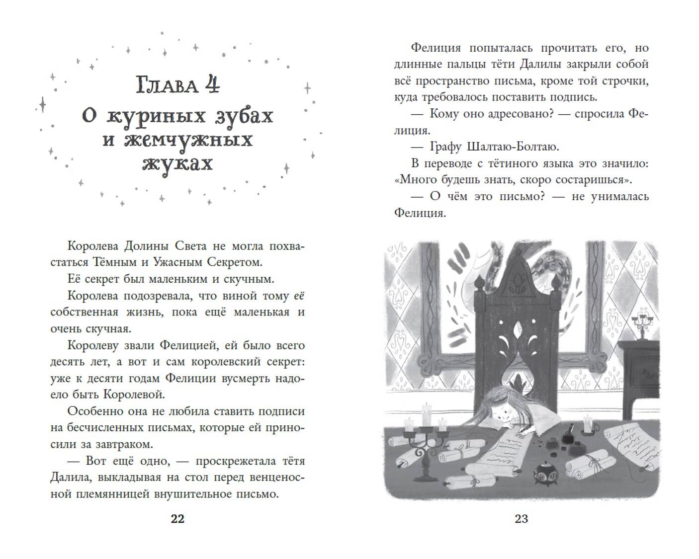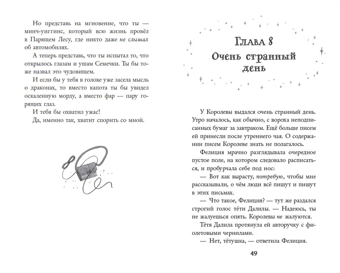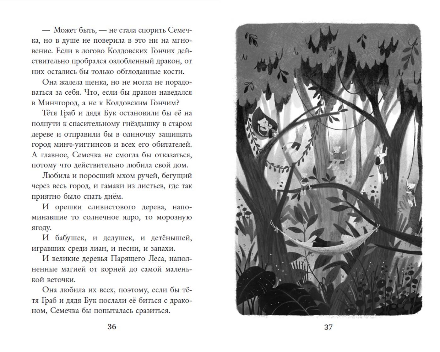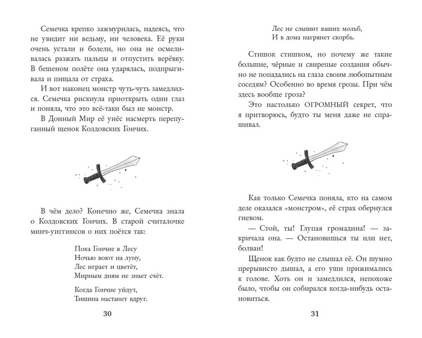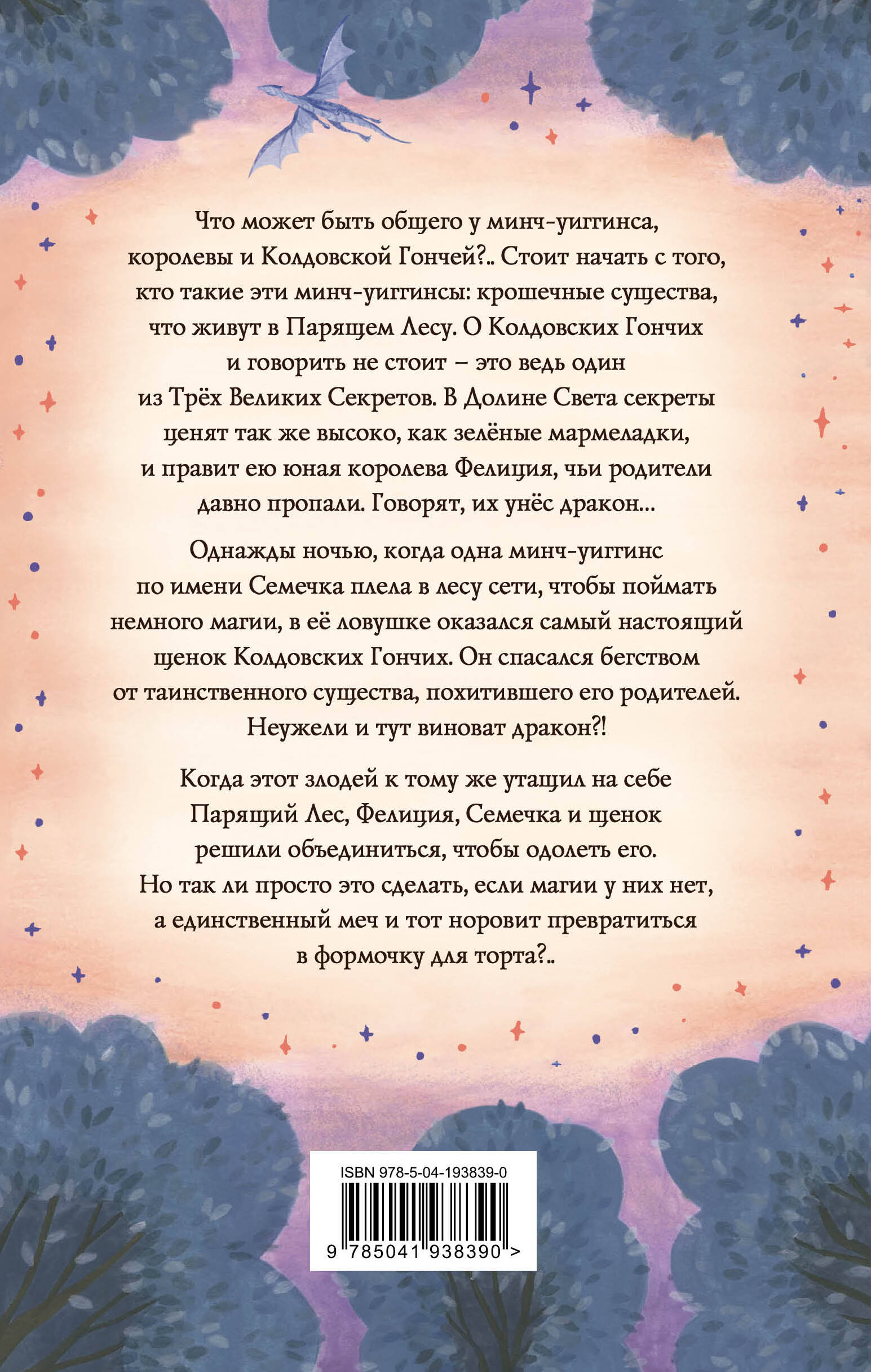 Что может быть общего у минч-уиггинса, королевы и Колдовской Гончей?.. Стоит начать с того, кто такие эти минч-уиггинсы: крошечные существа с острыми ушками, усами и хвостом, что живут в Парящем Лесу. О Колдовских Гончих и говорить не стоит - это ведь один из Трёх Великих Секретов Долины Света. В этой стране секреты ценят так же высоко, как зелёные мармеладки, и правит ею юная королева Фелиция, чьи родители пропали, когда она была совсем маленькая. Говорят, их унёс дракон… Однажды ночью, когда одна минч-уиггинс по имени Семечка плела в лесу сети, чтобы поймать немного магии, в её ловушке оказался самый настоящий щенок Колдовских Гончих. Он спасался бегством от таинственного существа, похитившего его родителей. Неужели и тут виноват дракон?! Когда этот злодей к тому же утащил на себе Парящий Лес, Фелиция, Семечка и щенок решили объединиться, чтобы одолеть его. Но так ли просто это сделать, если магии у них нет, а единственный меч и тот норовит превратится в формочку для торта?.. Здесь и начинается удивительное приключение, полное волшебства, загадок и встреч с причудливыми созданиями!| Издательство | ООО "Издательство "Эксмо" |