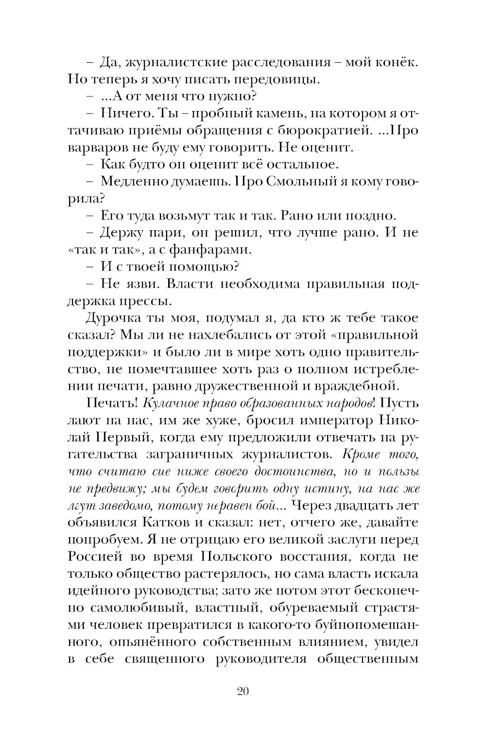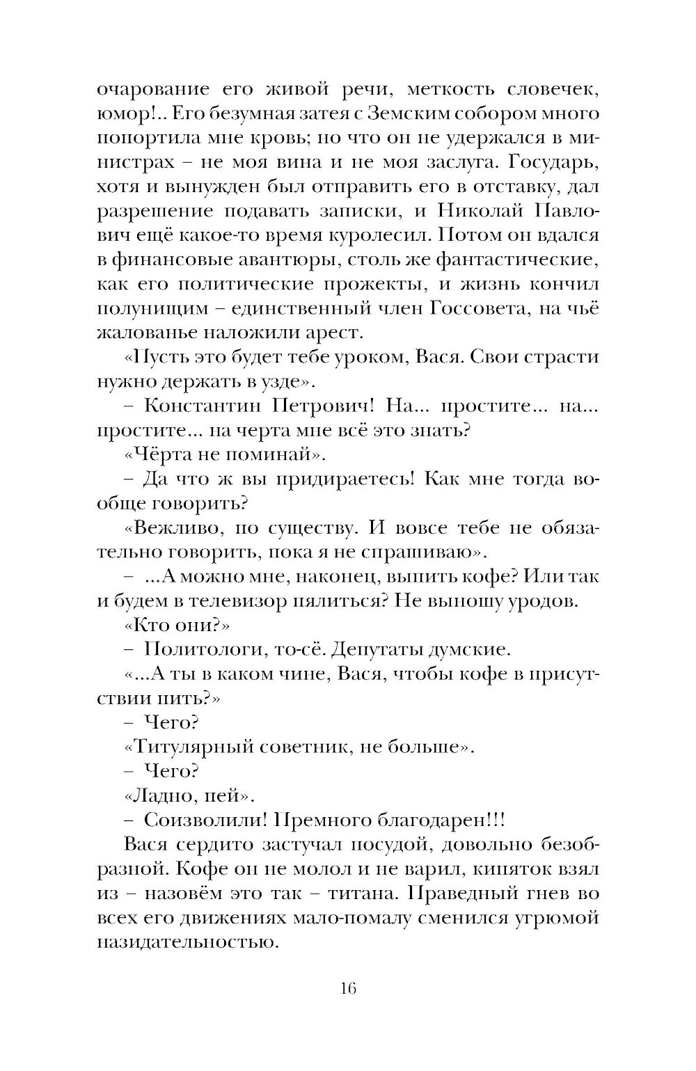 Представьте, что однажды утром вы проснулись и вдруг поняли: в своей голове вы не один. Там неведомым образом появился сосед - человек, умерший сто с лишним лет назад и ничего не знающий о современной действительности. При этом всё абсолютно реально и не имеет ничего общего с психическим расстройством. Такая история случилась с мелким муниципальным чиновником Васей Васнецовым, в голове которого нежданно появился член Государственного совета и обер-прокурор Святейшего синода Константин Петрович Победоносцев. Что из этого вышло - читать здесь.| Издательство | Литературная матрица |
