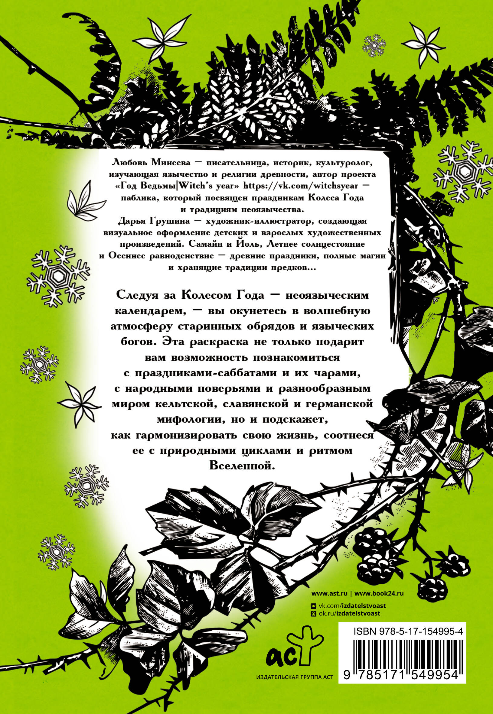 Самайн и Йоль, Летнее солнцестояние и Осеннее равноденствие - древние праздники, полные магии и хранящие традиции предков… Следуя за Колесом Года - неоязыческим календарем - вы окунетесь в волшебную атмосферу старинных обрядов и языческих богов. Эта раскраска подарит вам возможность не только познакомиться с праздниками-саббатами и их чарами, с народными поверьями и разнообразным миром кельтской, славянской и германской мифологий, но и подскажет, как гармонизировать свою жизнь, соотнеся ее с природными циклами и ритмом Вселенной.| Издательство | ИЗДАТЕЛЬСТВО "АСТ" |