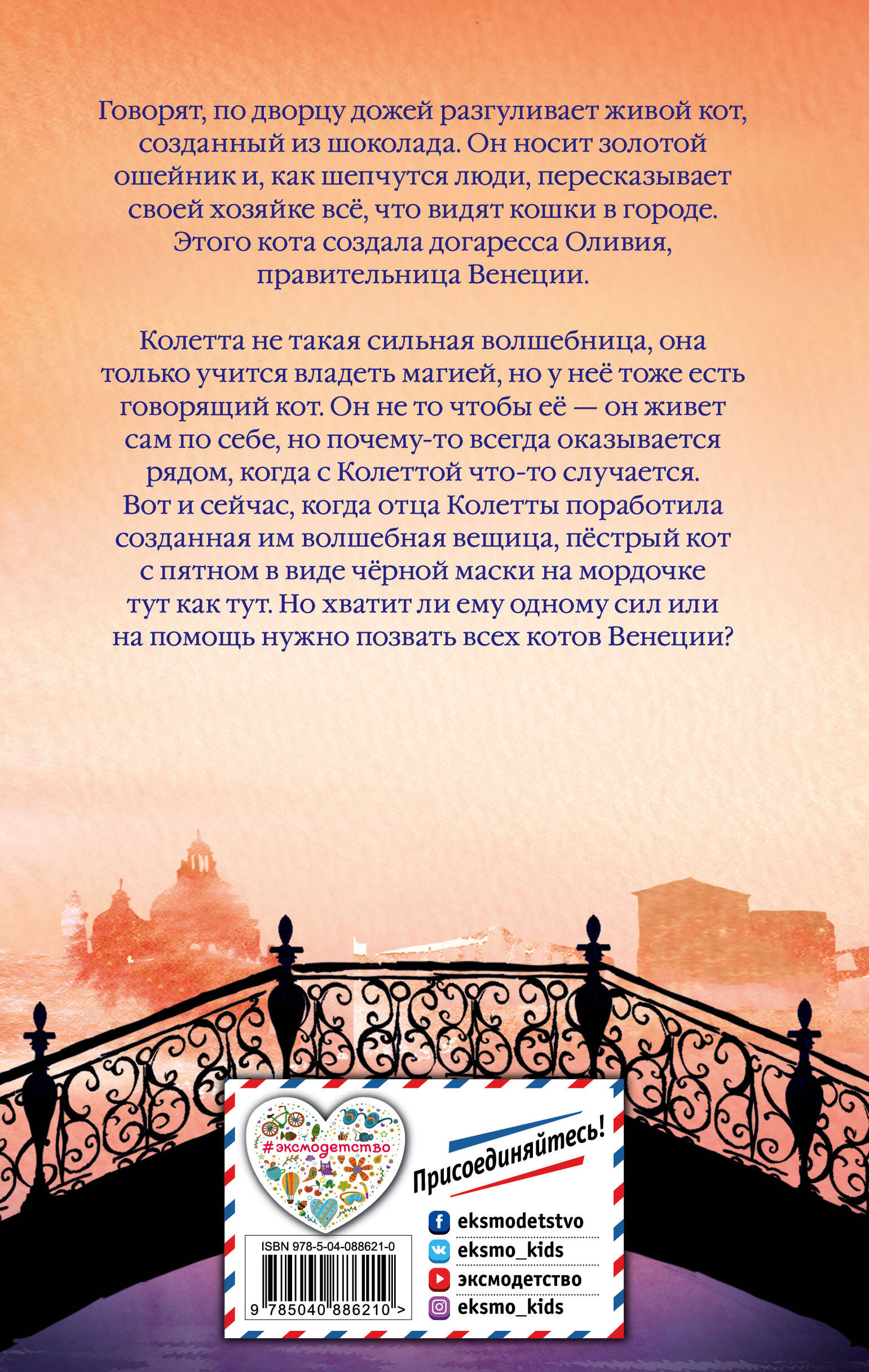 Говорят, по дворцу дожей разгуливает живой кот, созданный из шоколада. Он носит золотой ошейник и, как шепчутся люди, пересказывает своей хозяйке все, что видят кошки в городе. Этого кота создала догаресса Оливия, правительница Венеции. Колетта не такая сильная волшебница, она только учится владеть магией, но у нее тоже есть говорящий кот. Он не то, чтобы ее - он живет сам по себе, но почему-то всегда оказывается рядом, когда с Колеттой что-то случается. Вот и сейчас, когда отца Колетты поработила созданная им волшебная вещица, пестрый кот с пятном в виде черной маски на мордочке тут как тут. Но хватит ли ему одному сил или на помощь нужно позвать всех котов Венеции?| Издательство | ООО "Издательство "Эксмо" |
