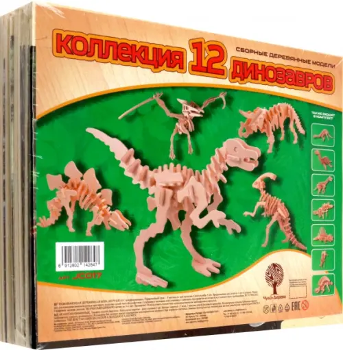 Коллекция из 12 сборных деревянных моделей динозавров.
