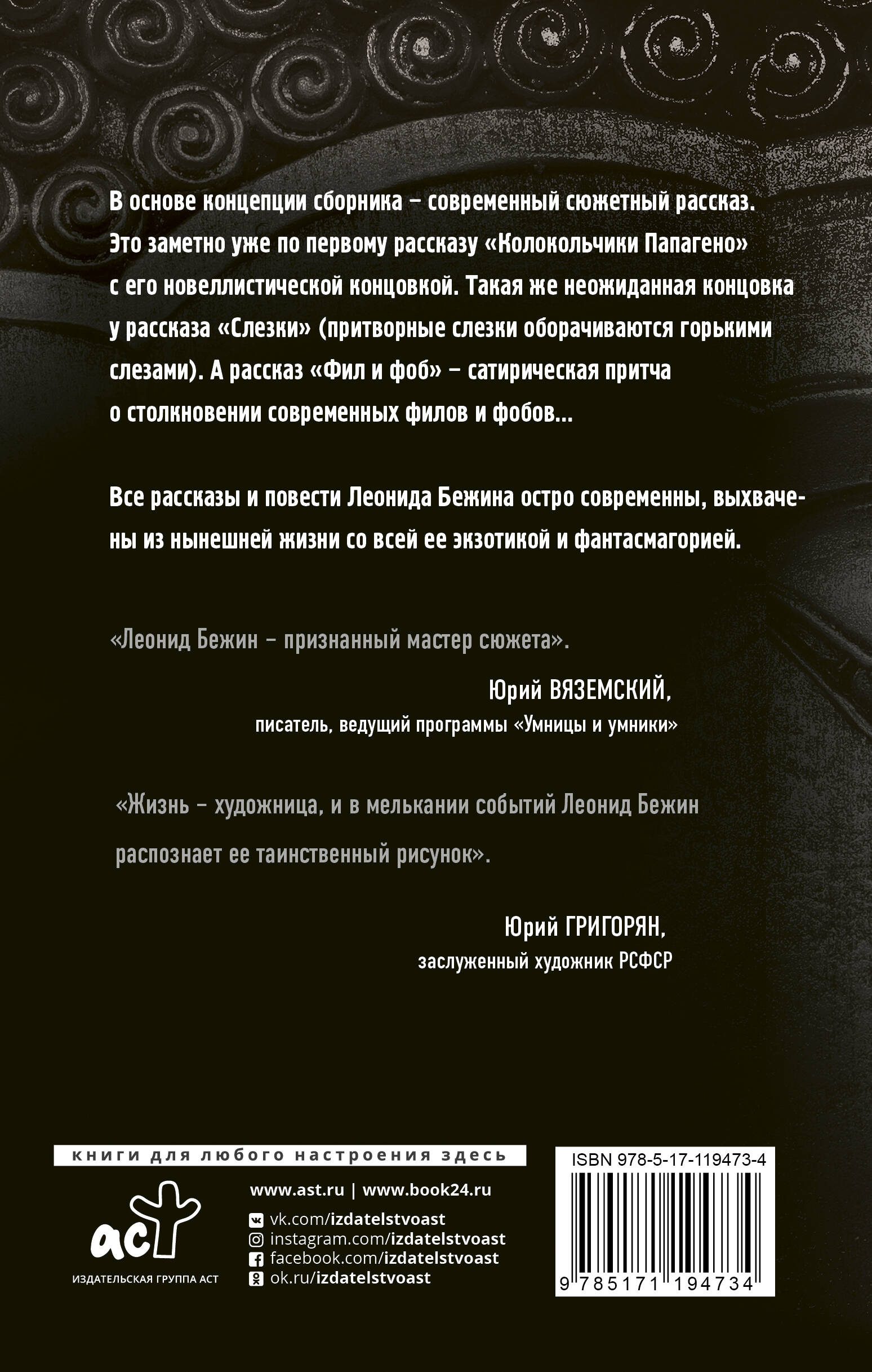 Все рассказы и повести Леонида Бежина остро современны, выхвачены из нынешней жизни со всей ее экзотикой и фантасмагорией.В основе концепции сборника - современный сюжетный рассказ. Это заметно уже по первому рассказу «Колокольчики Папагено» с его новеллистической концовкой. Такая же неожиданная концовка у рассказов «Слезки» (притворные слезки оборачиваются горькими слезами). А рассказ «Фил и фоб» - сатирическая притча о столкновении современных филов и фобов…