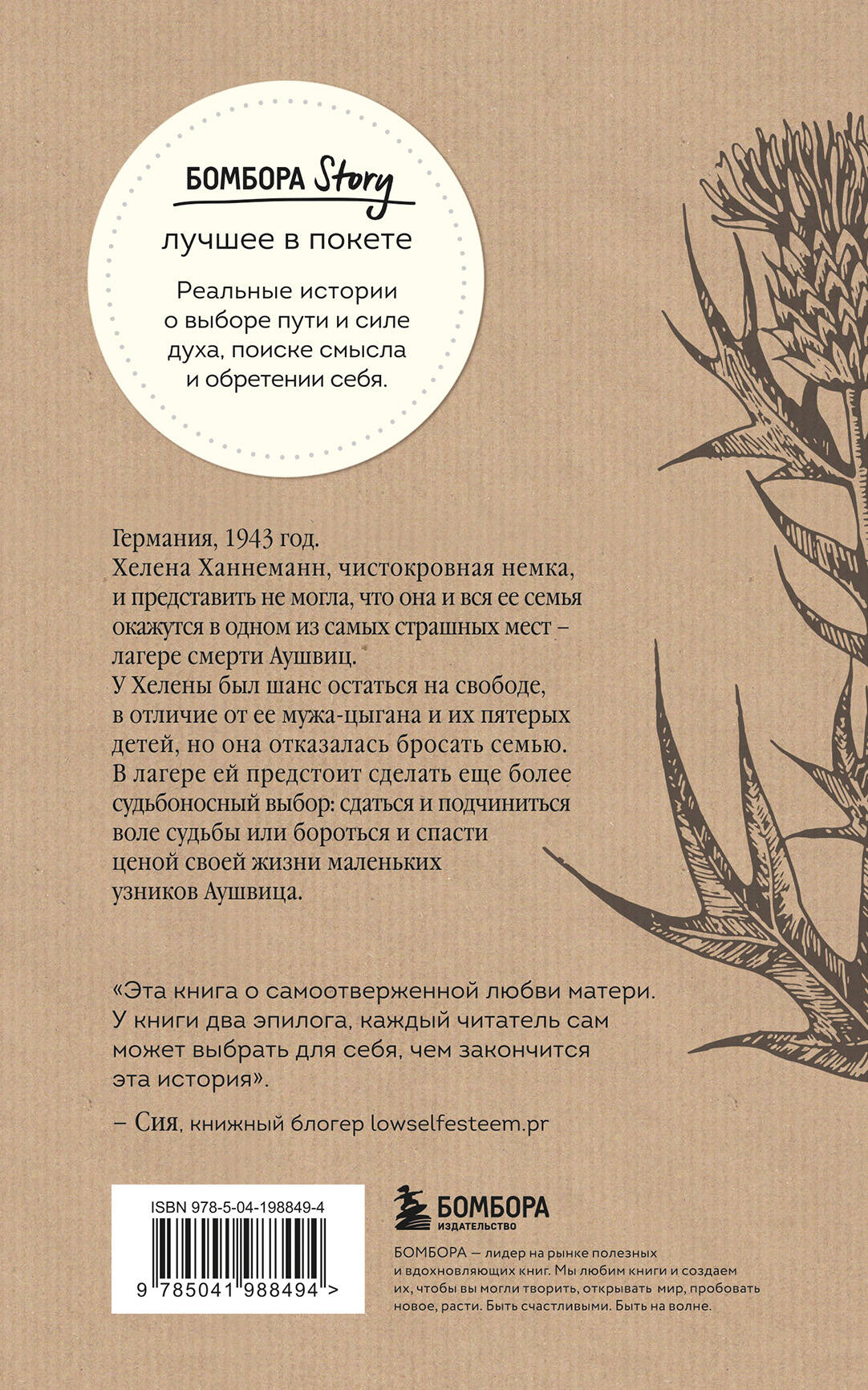 Книга для поклонников книги «Выбор» Эдит Ева Эгер. Бестселлер Amazon и финалист книжной премии Empik. История отважной немецкой медсестры, которая пожертвовала всем ради семьи и яростно боролась за детей, которые стали узниками Аушвица (Освенцима). Хелена Ханнеманн, ее муж Иоганн и их пятеро детей переезжают в Берлин в поисках лучшей жизни. В большом городе можно раствориться, а это лучший способ выжить в новой Германии - превратиться в невидимку. Но худшие опасения Хелены сбываются, когда ее мужа, виртуоза-скрипача, сначала увольняют из Берлинской консерватории, а после по приказу СС арестовывают вместе с детьми. Потому что все они имеют цыганские корни. Хотя Хелена немка и на нее не распространяется этот арест, она отказывается бросать семью. В лагере ей предстоит сделать еще более судьбоносный выбор: сдаться и подчиниться воле судьбы или бороться и спасти, ценой своей жизни, маленьких узников Аушвица (Освенцима). В книге две концовки: художественная и реальная, каждый читатель сам решает, чем кончится история Хелены и ее семьи.| Издательство | ООО "Издательство "Эксмо" |