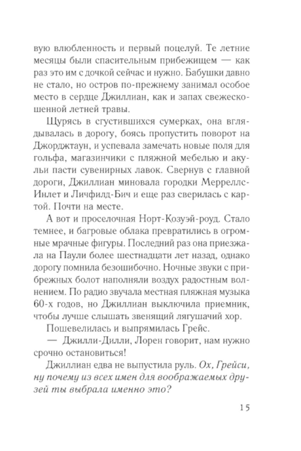 Джиллиан Париш развелась с мужем после того, как ее брак зашел в тупик, как, впрочем, и отношения с родителями. С ней осталась лишь семилетняя дочь Грейс и малыш, который появится на свет только через несколько месяцев. Собрав свои немногочисленные вещи и усадив в машину дочь и кота, Джиллиан отправляется в Полис-Айленд в Южной Каролине, в дом своей бабушки - единственного человека, воспоминания о котором даруют Джиллиан покой и радость. Вместе с маленьким пляжным домиком к Джиллиан возвращаются и воспоминания о давно прошедших днях юности. Она вспоминает историю своей подруги Лорен, которая бесследно исчезла много лет назад. Многие тогда заподозрили в преступлении их общего друга Линка Ризинга. Джиллиан никогда не верила в это, и теперь ей выпал шанс разобраться с этими слухами. По удивительному стечению обстоятельств Линк в это время тоже приезжает в Полис-Айленд. Но далее история приобретает странный оборот. Маленькая Грейс заводит себе воображаемого друга - призрачную девочку по имени Лорен...