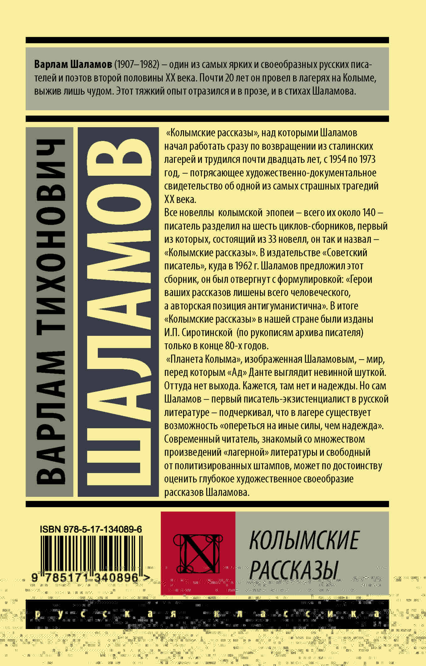 "Колымские рассказы", над которыми Шаламов начал работать сразу по возвращении из сталинских лагерей и трудился почти двадцать лет, с 1954 по 1973 год, - потрясающее художественно-документальное свидетельство об одной из самых страшных трагедий ХХ века. Все новеллы колымской эпопеи - всего их около 140 - писатель разделил на шесть циклов-сборников, первый из которых, состоящий из 33 новелл, он так и назвал - "Колымские рассказы". В издательстве "Советский писатель", куда в 1962 г. Шаламов предложил этот сборник, он был отвергнут с формулировкой: "Герои ваших рассказов лишены всего человеческого, а авторская позиция антигуманистична". В итоге "Колымские рассказы" в нашей стране были изданы И.П. Сиротинской (по рукописям архива писателя) только в конце 80-х годов. "Планета Колыма", изображенная Шаламовым, - мир, перед которым "Ад" Данте выглядит невинной шуткой. Оттуда нет выхода. Кажется, там нет и надежды. Но сам Шаламов - первый писатель-экзистенциалист в русской литературе - подчеркивал, что в лагере существует возможность "опереться на иные силы, чем надежда". Современный читатель, знакомый со множеством произведений "лагерной" литературы и свободный от политизированных штампов, может по достоинству оценить глубокое художественное своеобразие рассказов Шаламова.| Издательство | ИЗДАТЕЛЬСТВО "АСТ" |