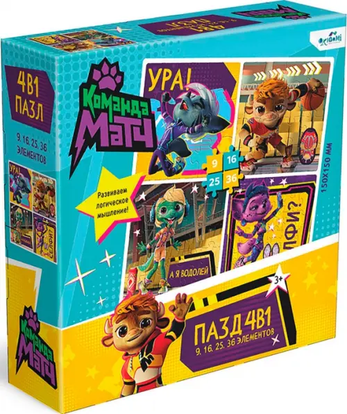 Набор пазлов 4в1 - это комплект пазлов с разной элементностью, включающий в себя головоломки из 9, 16, 25 и 36 элементов, объединенных общей тематикой. Набор пазлов с любимыми персонажами мультфильма Команда Матч понравится любому ребенку! Постепенно усложняя сборку пазла от 9 элементов до 36 элементов, ребенок научится внимательности, концентрации, а также сможет развить мелкую моторику.