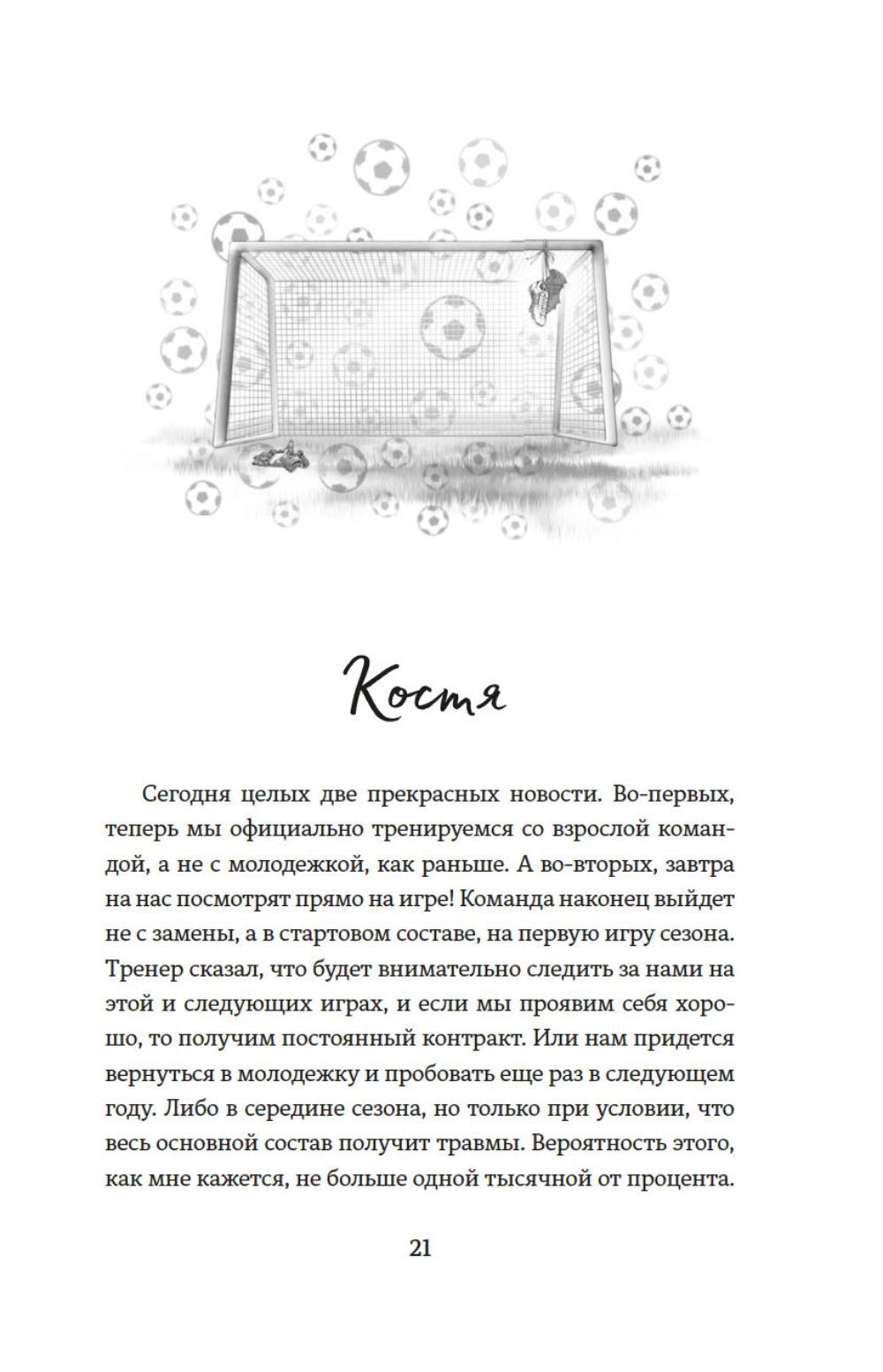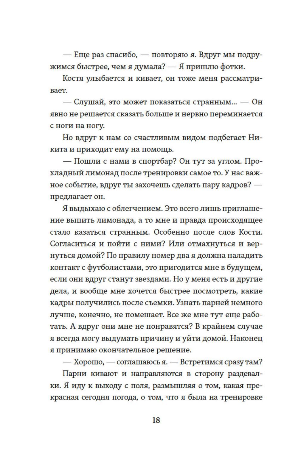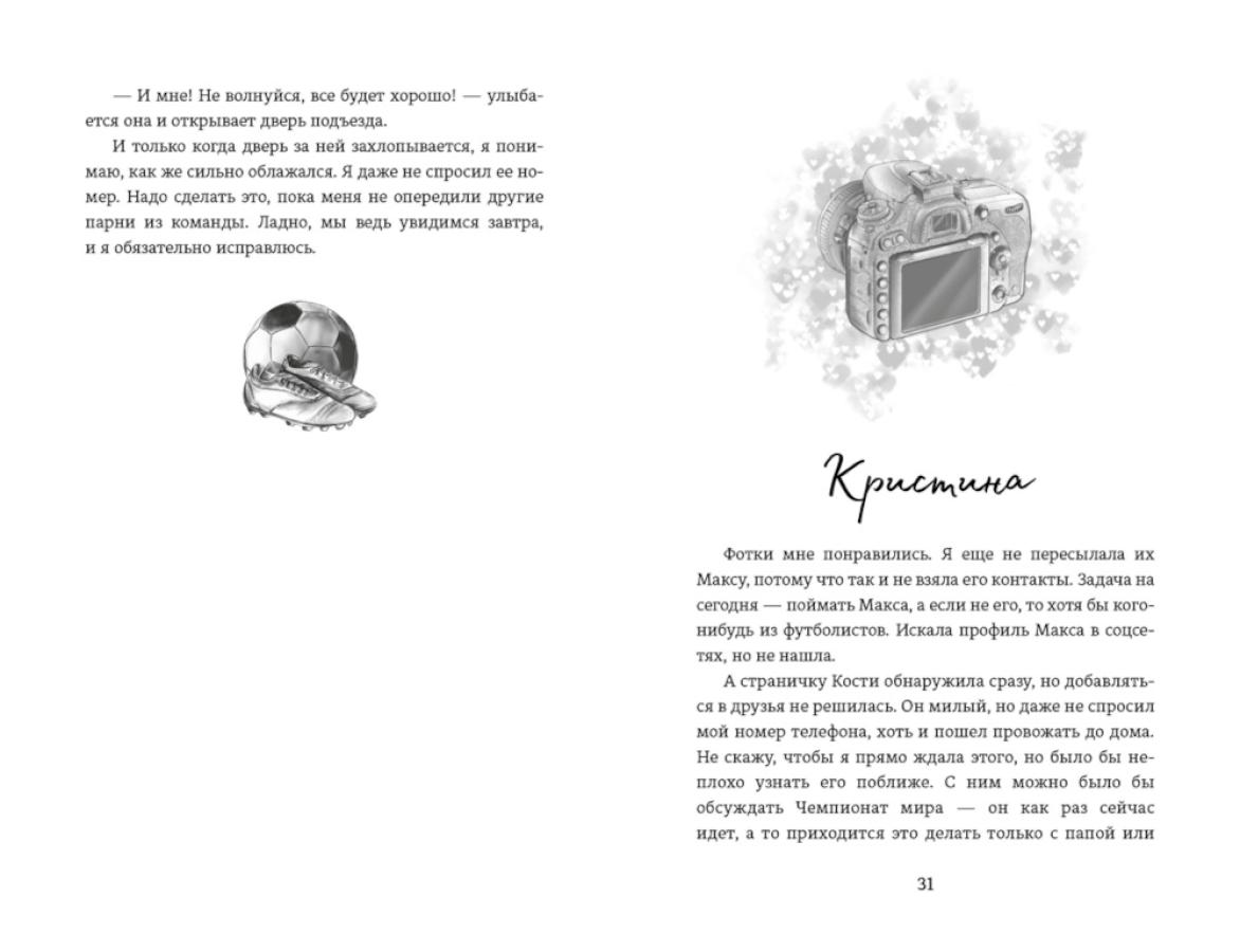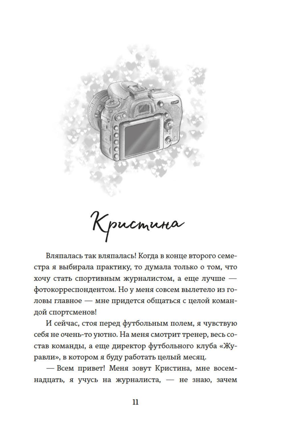 Кристина Вляпалась так вляпалась! Практика фотокорра в футбольной команде - моя мечта! И теперь я оказалась единственной девчонкой среди... одних только парней-футболистов. И все такие разные - серьезные, наглые, веселые, обаятельные. Вот только все чаще и чаще меня тянет к одному из них. Чувствует ли Костя ко мне то же самое? Или же я открою ему свое сердце и это станет моей самой большой ошибкой? Костя Бесконечные игры и тренировки с утра до ночи. Я всегда хотел стать лучшим вратарем в молодежке. Но когда к команде присоединилась Крис, новый фотокорр, все пошло наперекосяк. Каждую игру я смотрю только на нее, упускаю мячи и вместе с ними - высокий рейтинг в турнирной таблице. Только как быть, если единственное, о чем я мечтаю перед сном, ощутить аромат клубники со сливками - ее запах?..| Издательство | Махаон |