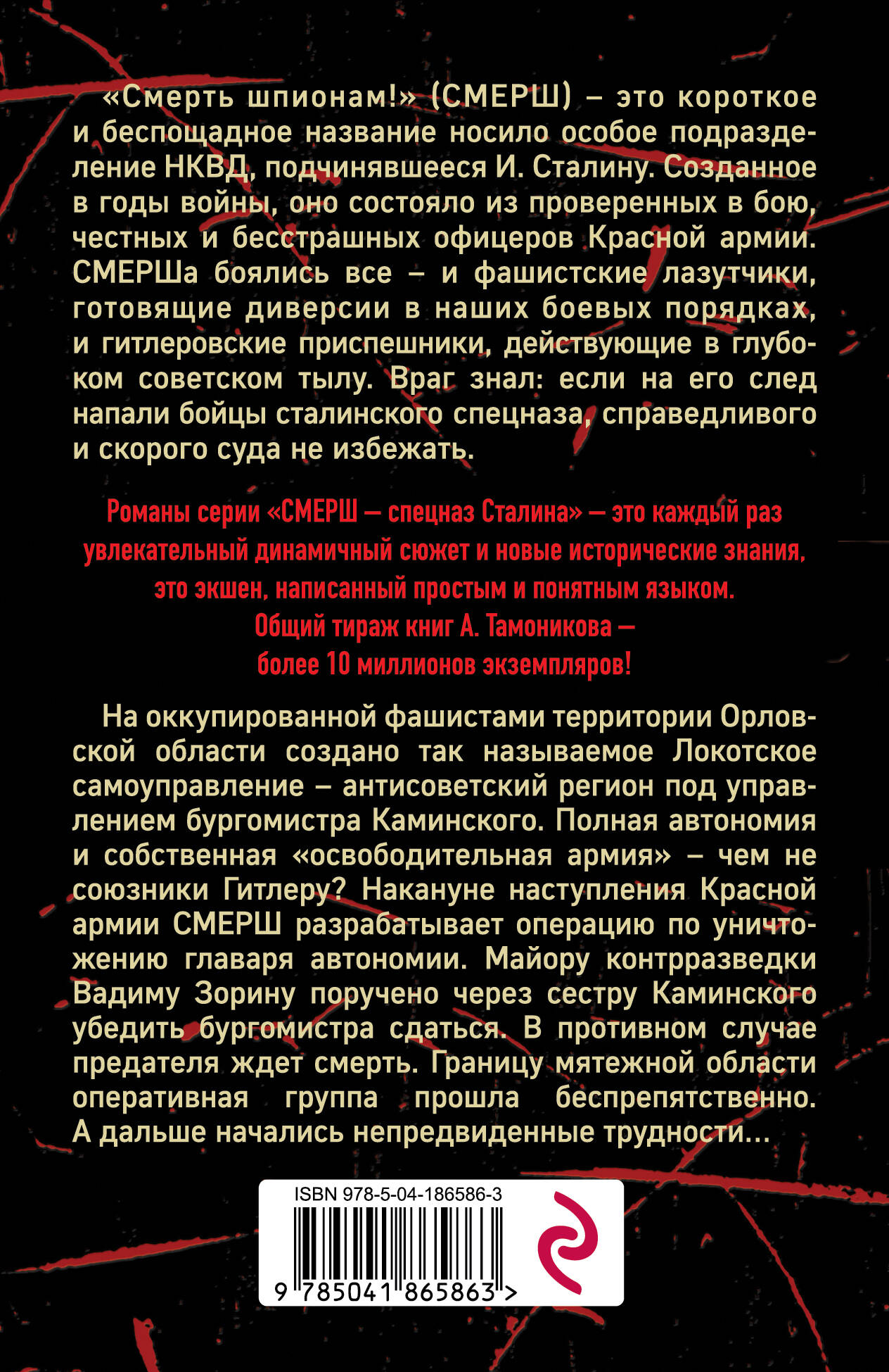 «Смерть шпионам!» (СМЕРШ) - это короткое и беспощадное название носило особое подразделение НКВД, подчинявшееся И. Сталину. Созданное в годы войны, оно состояло из проверенных в бою, честных и бесстрашных офицеров Красной Армии. СМЕРШа боялись все - и фашистские лазутчики, готовящие диверсии в наших боевых порядках, и гитлеровские приспешники, действующие в глубоком советском тылу. Враг знал: если на его след напали бойцы сталинского спецназа, справедливого и скорого суда не избежать. Романы серии «СМЕРШ - спецназ Сталина» - это каждый раз увлекательный динамичный сюжет и новые исторические знания, это экшен, написанный простым и понятным языком. Общий тираж книг А. Тамоникова - более 10 миллионов экземпляров! На оккупированной фашистами территории Орловской области создано так называемое Локотское самоуправление - антисоветский регион под управлением бургомистра Каминского. Полная автономия и собственная «освободительная армия» - чем не союзники Гитлеру? Накануне наступления Красной Армии СМЕРШ разрабатывает операцию по уничтожению главаря автономии. Майору контрразведки Вадиму Зорину поручено через сестру Каминского убедить бургомистра сдаться. В противном случае предателя ждет смерть. Границу мятежной области оперативная группа прошла беспрепятственно. А дальше начались непредвиденные трудности…| Издательство | ООО "Издательство "Эксмо" |