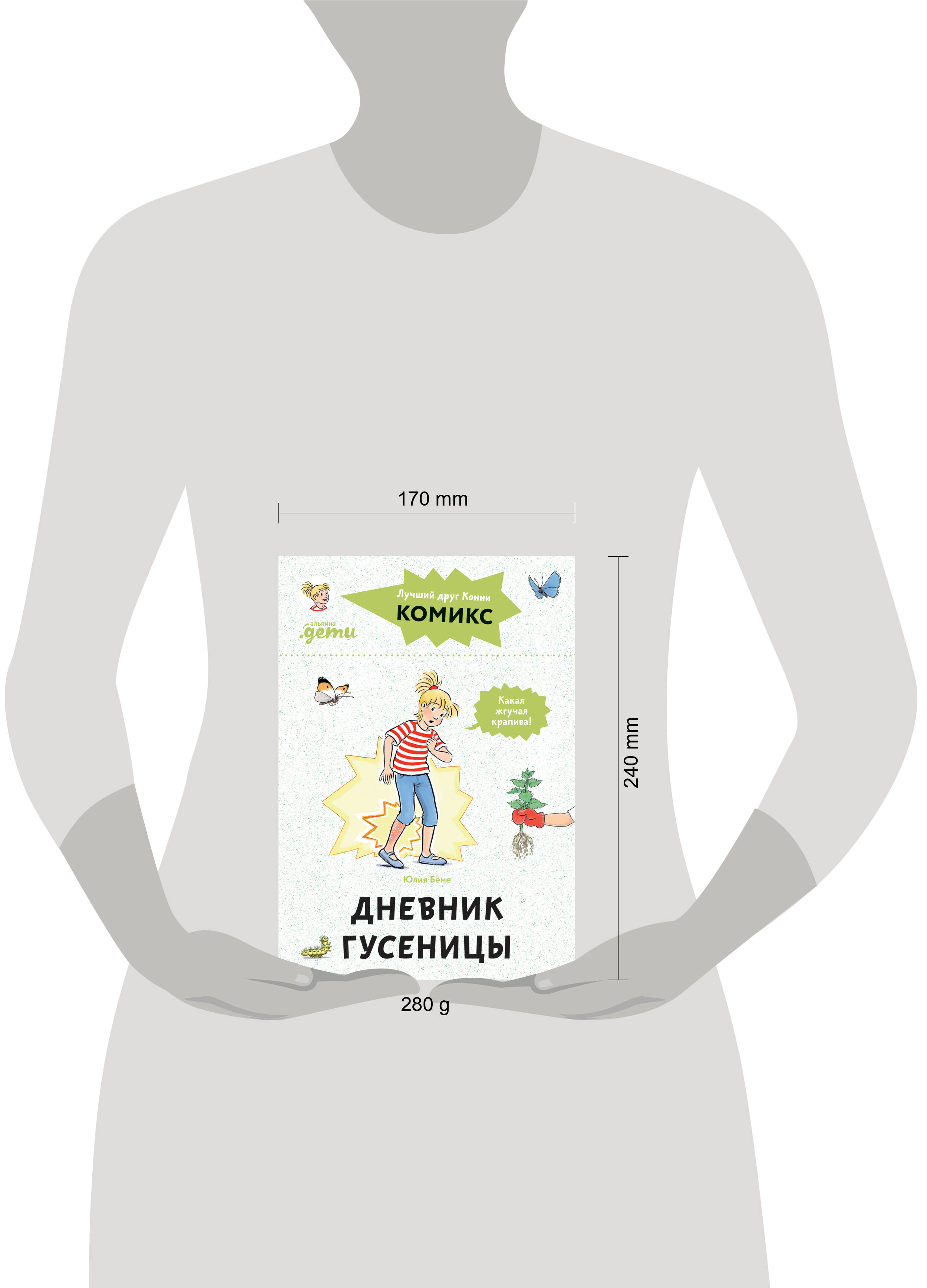 О чем Однажды учительница приносит в школу необычное растение - крапиву. Оказывается, именно ею питаются гусеницы бабочек павлиний глаз. Теперь ребята ухаживают за необычными обитателями живого уголка. Конни это так увлекает, что она начинает вести настоящий "Дневник гусеницы"! Комиксы с Конни помогут "расчитать" ребенка и привить интерес к книгам, ведь ему проще воспринимать информацию картинками. Небольшие тексты, яркие иллюстрации, простые диалоги и веселый сюжет надолго увлекут ребенка, и он захочет познакомиться с новыми приключениями героев. Особенности Страницы из плотной белой бумаги, крупный шрифт, удобный формат - книгу приятно держать в руках. Удобно открывать и закрывать даже неопытному читателю, даже если он еще не умеет обращаться с книгами. Для кого Подходит для детей от 5 лет, которые уже умеют читать, но не хотят это делать или боятся больших текстов.