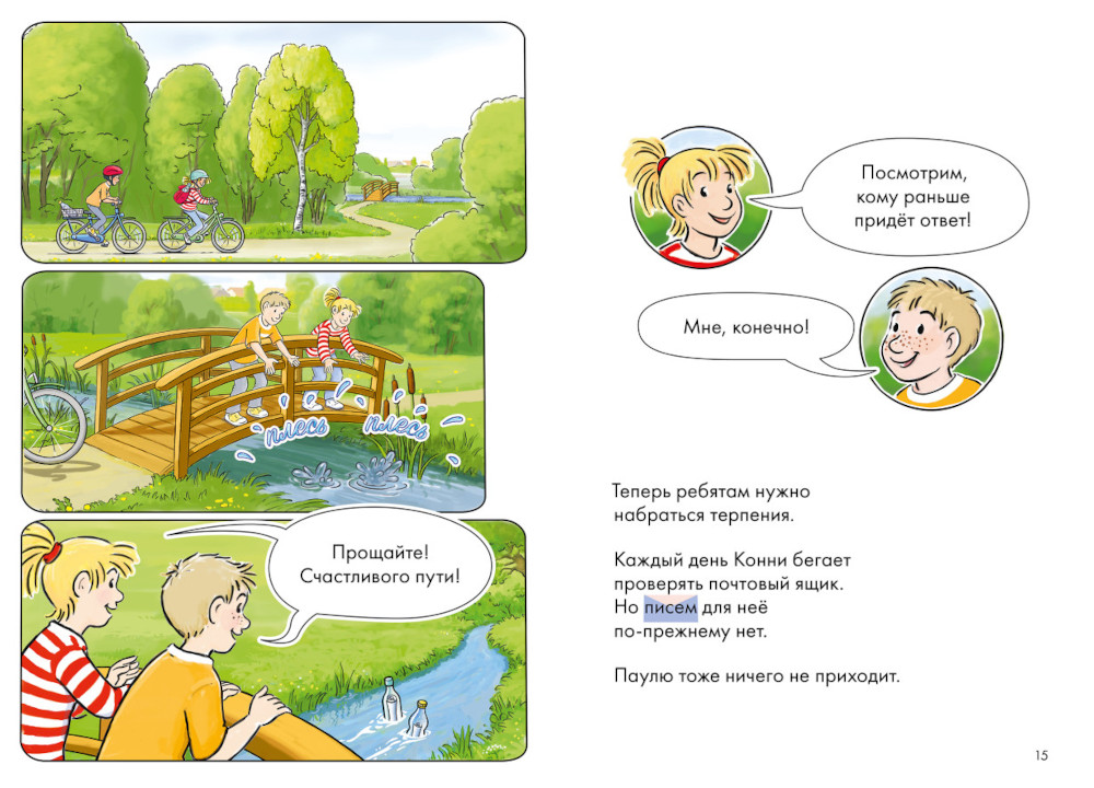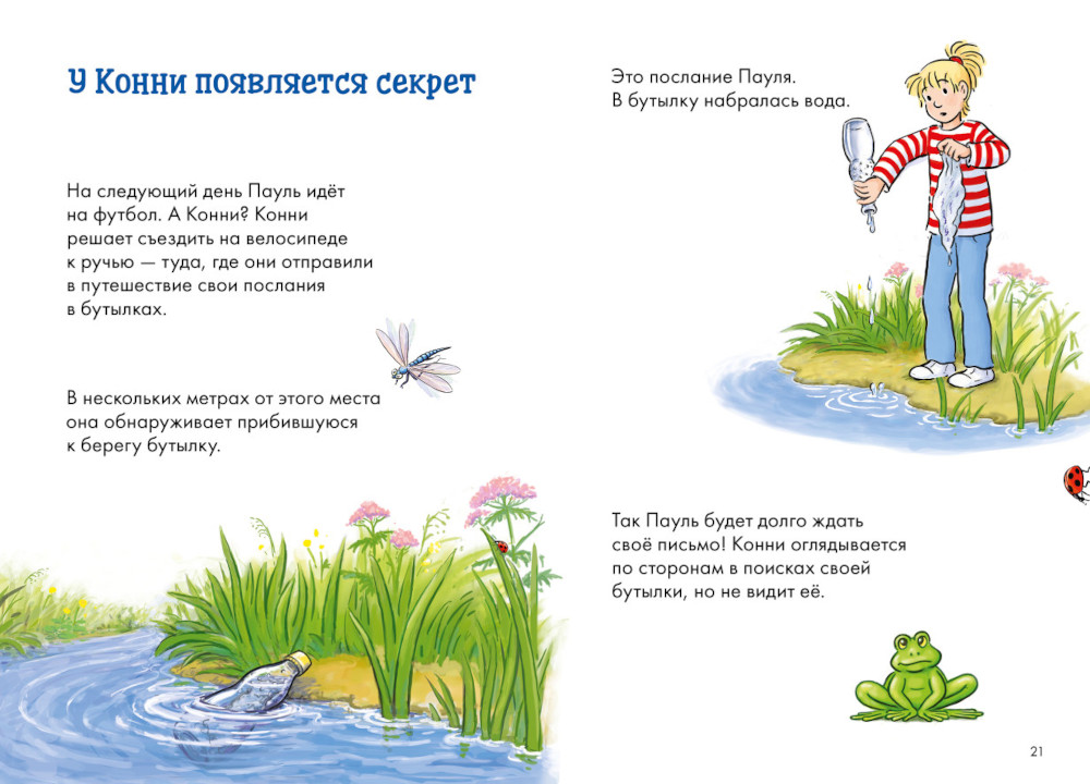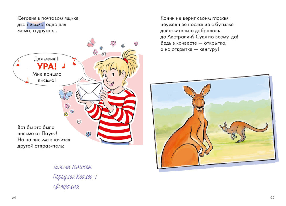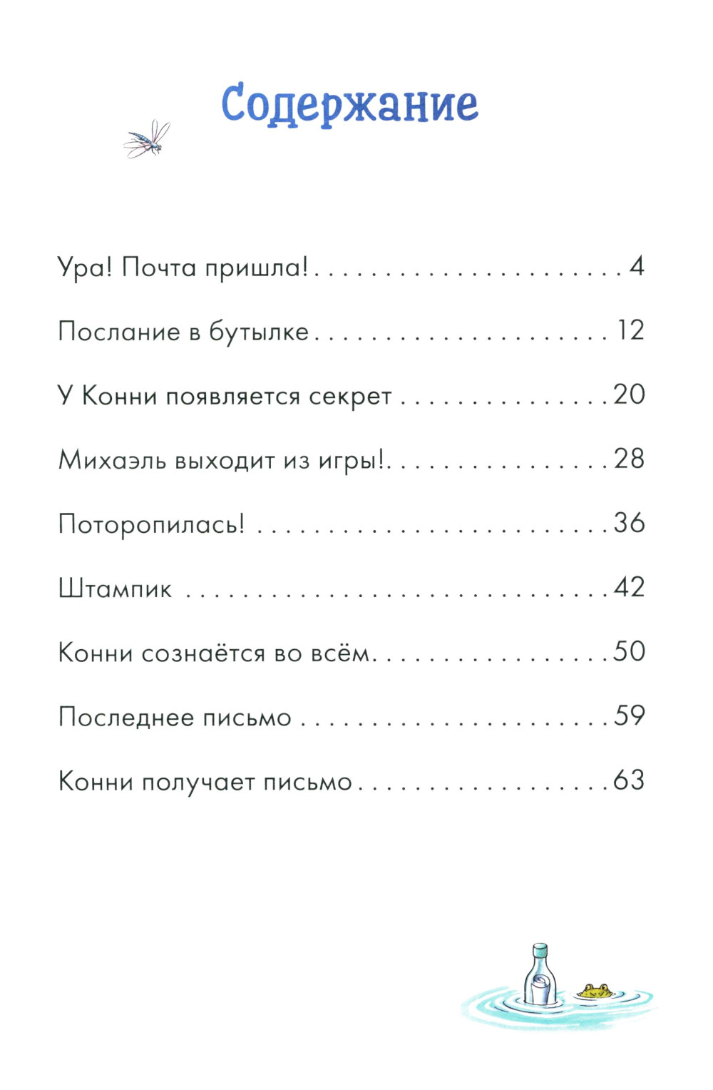 Конни всегда мечтала получить письмо, но ей никто не пишет. Вся почта приходит только её родителям. Тогда она решает взять дело в свои руки: вместе с Паулем они пишут по письму, кладут его в бутылку и кидают в воду. Осталось только набраться терпения и получить ответ! Однажды Конни находит послание Пауля рядом с берегом. Не желая расстраивать друга, Конни решает подговорить своего двоюродного брата Михаэля написать Паулю письмо. Правильно ли поступила Конни и выдержит ли их дружба такой обман?| Издательство | Альпина Паблишер |