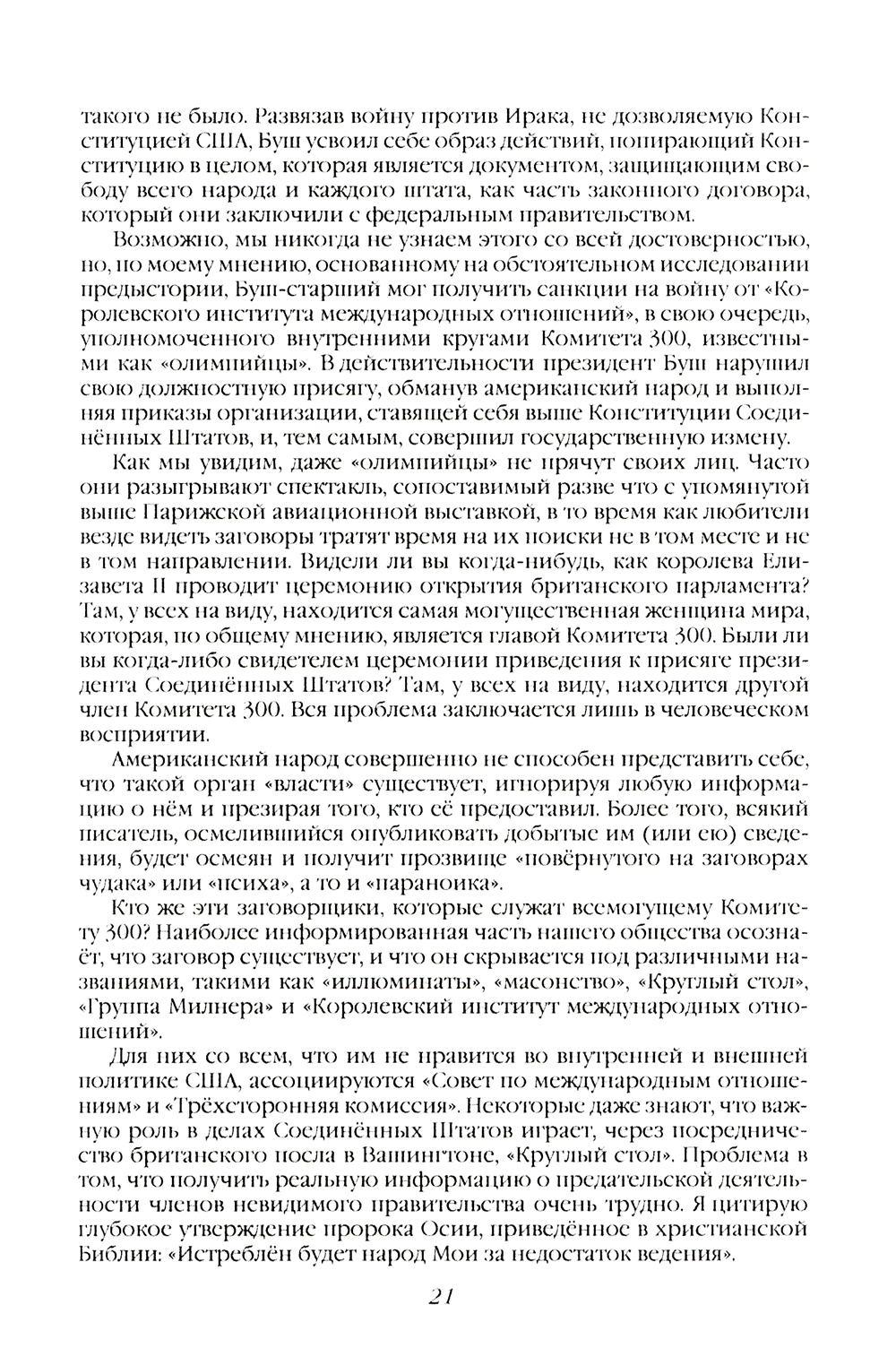 Джон Колеман - американский публицист, бывший сотрудник британских спецслужб. Автор 11 книг, самая известная из которых в России - «Комитет 300» (The Committee of 300), которую он написал после 30-летних исследований деятельности различных мировых олигархических сообществ, например, династии Ротшильдов, и закрытых для широкой публики организаций: Римского клуба, Тавистокского института и др. В этой книге Колеман утверждает, что в мире существует могущественная секретная организация, в которую входит элита Великобритании, США и некоторых других государств, объединенная общей целью - стремлением установить мировое господство. По утверждению Колемана, в планы этих не афиширующих свою деятельность людей входит радикальное сокращение населения планеты до одного миллиарда человек.| Издательство | Родина |