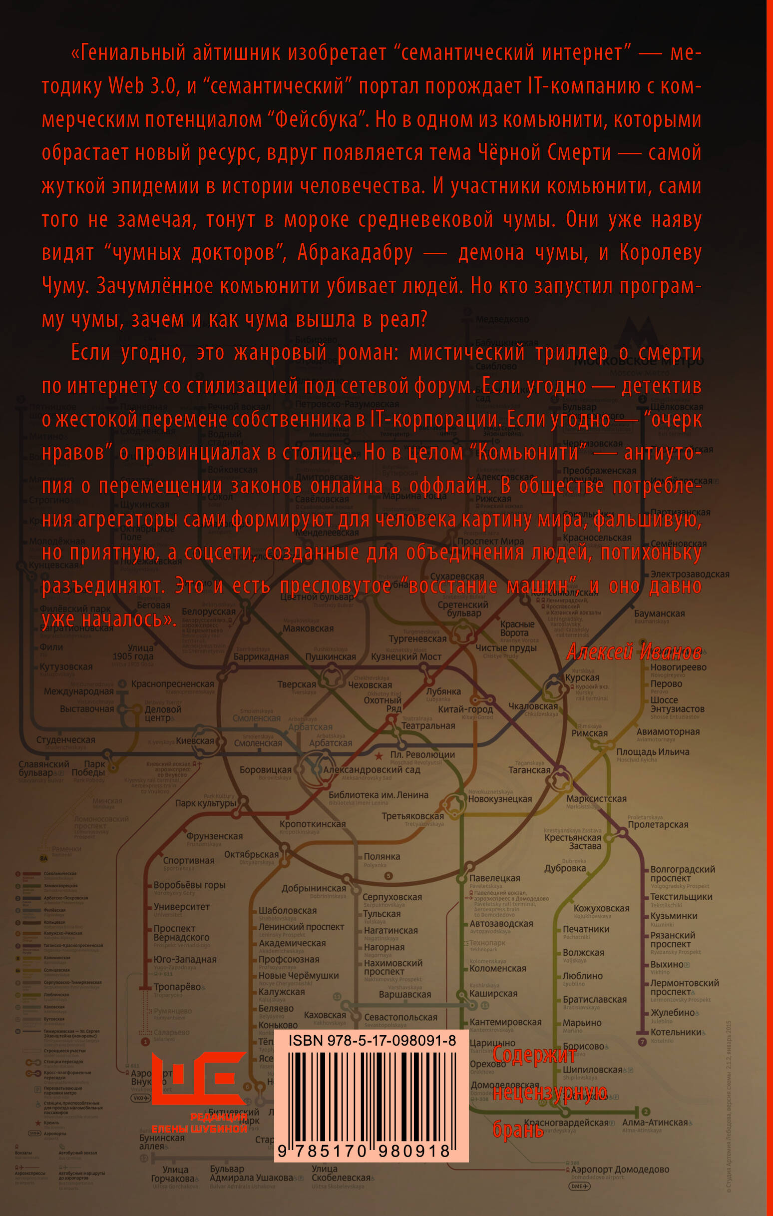 Автор бестселлеров «Географ глобус пропил», «Золото бунта», «Сердце пармы», «Тобол» Алексей Иванов рисует перед читателем картину виртуальной чумы, и нам ничего не остается, кроме как стать участниками таинственного Комьюнити, ищущего сведения о страшной Болезни. «…Роман очень кинематографичен в хорошем смысле слова, а в России так недостает качественного хоррора с острым сюжетом и глубокой содержательной составляющей». (Булат Ханов)| Издательство | Издательство "АСТ" |
