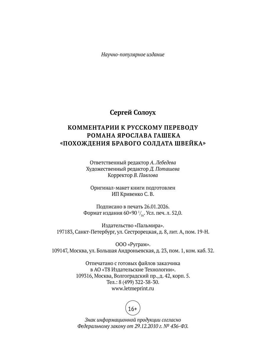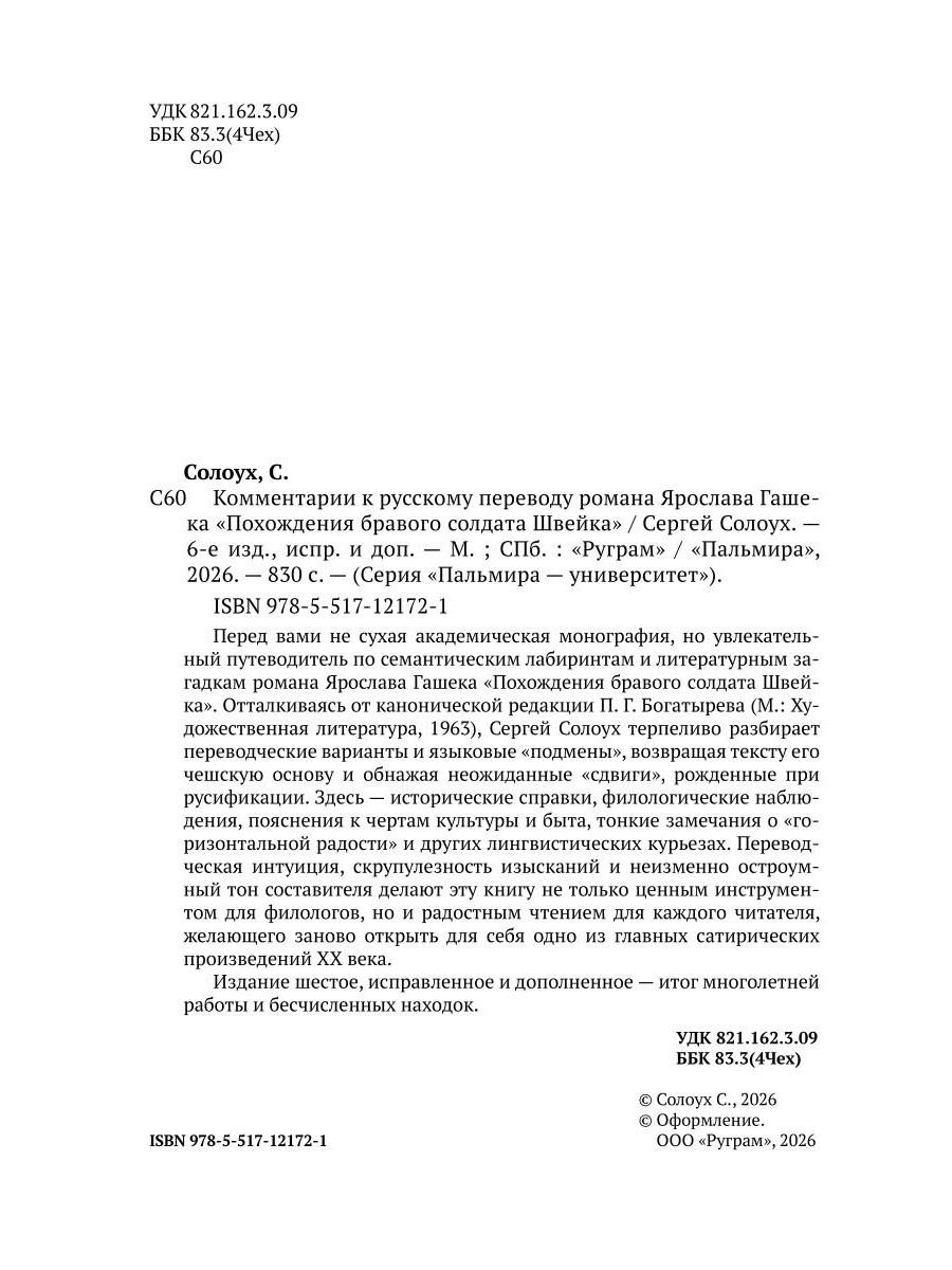Перед вами не сухая академическая монография, но увлекательный путеводитель по семантическим лабиринтам и литературным загадкам романа Ярослава Гашека «Похождения бравого солдата Швейка». Отталкиваясь от канонической редакции П. Г. Богатырева (М.: Художественная литература, 1963), Сергей Солоух терпеливо разбирает переводческие варианты и языковые «подмены», возвращая тексту его чешскую основу и обнажая неожиданные «сдвиги», рожденные при русификации. Здесь - исторические справки, филологические наблюдения, пояснения к чертам культуры и быта, тонкие замечания о «горизонтальной радости» и других лингвистических курьезах. Переводческая интуиция, скрупулезность изысканий и неизменно остроумный тон составителя делают эту книгу не только ценным инструментом для филологов, но и радостным чтением для каждого читателя, желающего заново открыть для себя одно из главных сатирических произведений XX века. Издание шестое, исправленное и дополненное - итог многолетней работы и бесчисленных находок.| Издательство | Т8 RUGRAM |