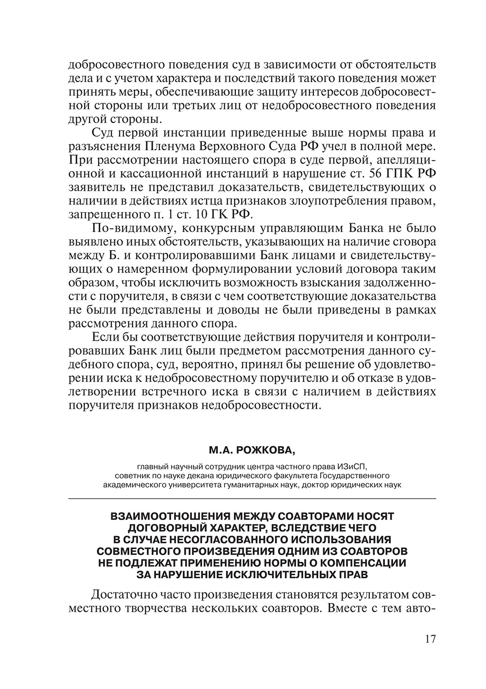 В данном выпуске ежегодного Комментария на базе обобщения отдельных категорий дел и анализа конкретных споров, разрешенных судами общей юрисдикции, рассматриваются актуальные вопросы применения гражданского и трудового законодательства, законодательства о гражданском судопроизводстве, об исполнительном производстве, о нотариате, а также уголовного и уголовно-процессуального законодательства. В частности, исследуется, каковы правовые последствия несогласованного использования совместного произведения одним из соавторов, как должны оплачиваться выходные и нерабочие праздничные дни и сверхурочная работа, каким образом следует применять новое правило об исчислении срока исполнительной давности в случае предъявления исполнительного документа к исполнению после его отзыва. Освещены отличия оснований для возврата заявления о выдаче судебного приказа и отказа в принятии такого заявления, процедура установления личности гражданина, обратившегося к нотариусу для совершения нотариального действия. Показаны подходы к решению вопроса об определении органа, компетентного открывать и вести наследственное дело в случае трансграничного наследования. Рассмотрены проблемы применения категорий «беспомощное лицо» и «беззащитное лицо» к потерпевшим преклонного возраста. Для судей, нотариусов, адвокатов и других практикующих юристов, а также для научных работников, преподавателей, аспирантов, студентов юридических вузов и всех тех, кто интересуется правом, законодательством и практикой его применения.| Издательство | Инфотропик Медиа |