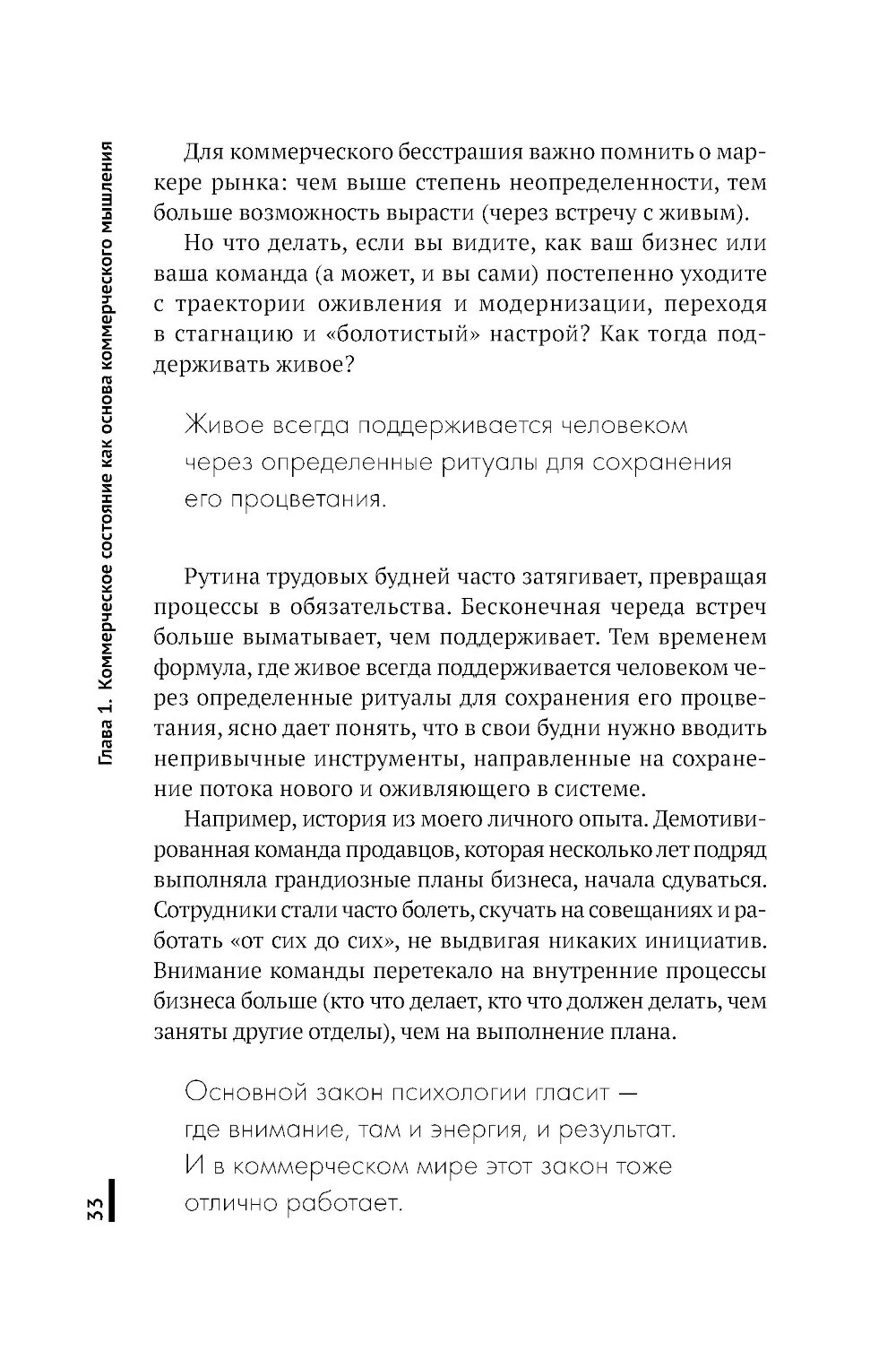 Развивать бизнес без коммерческого мышления все равно что готовить сложное блюдо без рецепта. Можно иметь отличные ингредиенты и навыки, но результат будет непредсказуемым. Проблема в том, что предпринимателей и сотрудников не обучают пониманию и развитию коммерческого мышления. Обычно под ним подразумевают лишь навыки поиска новых рынков сбыта, работы с клиентами и оперирования финансовыми показателями. На деле же коммерческое мышление включает эффективный анализ рынка и поиски новых возможностей для роста, взвешенные финансовые решения и выстраивание долгосрочных отношений с клиентами, быструю адаптацию к меняющимся условиям рынка и умение замотивировать сотрудников. Но главный компонент мышления в бизнесе - коммерческое бесстрашие, готовность действовать даже в условиях неопределенности и принимать амбициозные решения, несмотря на страх неудачи или внешние барьеры. Анастасия Мозер, имея за плечами 20 лет опыта в коммерческой сфере, регулярно сталкивается с ситуациями, когда талантливые предприниматели и сотрудники упираются в «потолок» собственных ограничивающих убеждений, что отражается на результатах бизнеса. В своей книге она предлагает практические инструменты и стратегии, которые помогают преодолеть эти ограничения и научиться коммерческому бесстрашию, чтобы видеть возможности там, где другие видят препятствия.