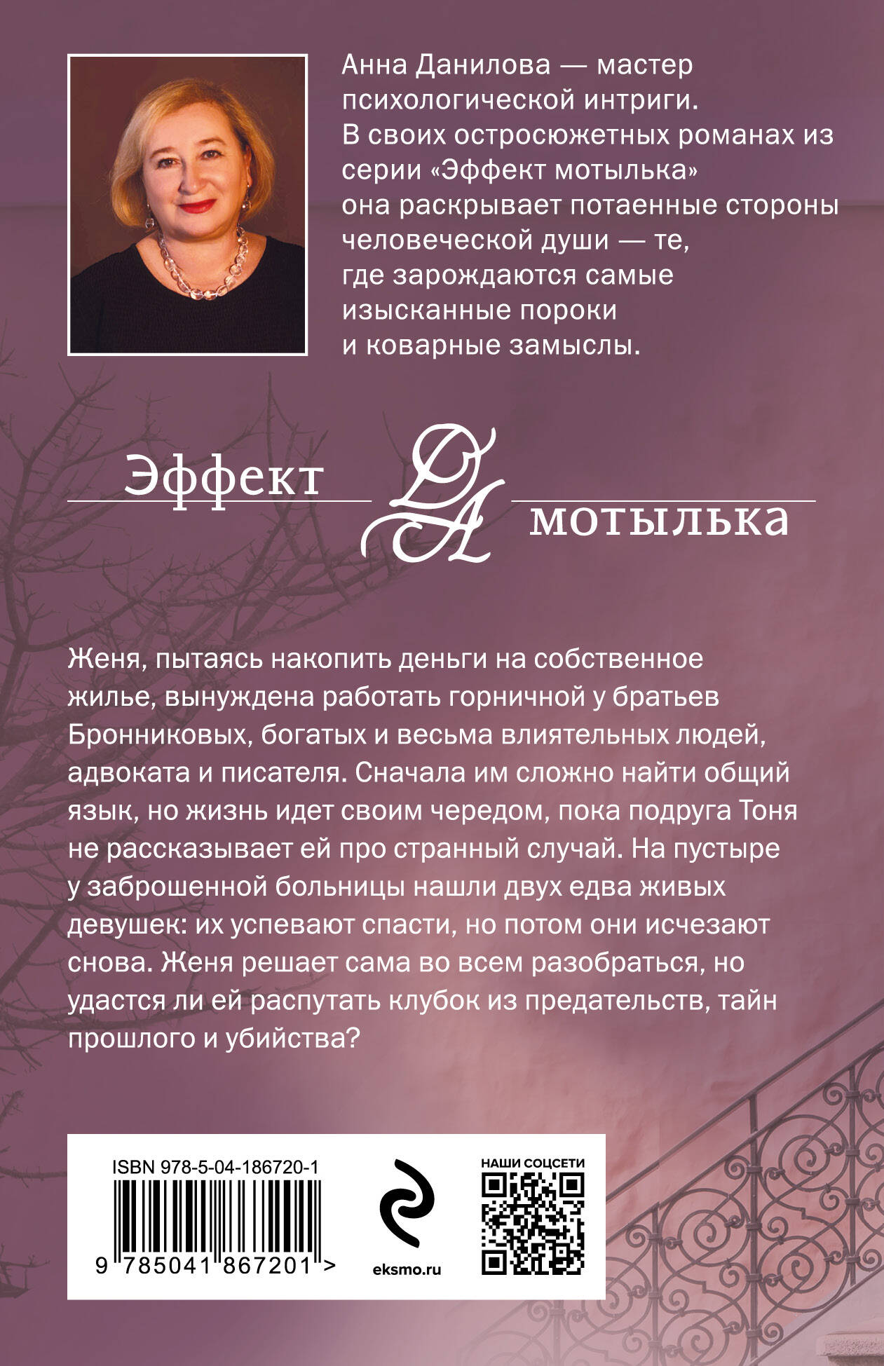 Женя, обычная девушка, пытается накопить деньги на собственное жилье и поэтому вынуждена работать горничной у братьев Бронниковых - богатых и весьма влиятельных людей. Ее жизнь идет своим чередом, пока она не впутывается в странное дело, связанное со страшными секретами, предательствами и убийствами. Сможет ли она разгадать тайну и обрести долгожданную свободу? Анна Данилова - профессиональный писатель, работает в разных жанрах (сюрреализм, реалистическая проза, детские повести, драматургия), на ее счету несколько пьес, сценариев. Но большая часть произведений написана в жанре психологического детектива. Книги автора были изданы во многих российских издательствах, а также переведены на болгарский и турецкие языки и изданы в Софии и Стамбуле. С 1998 года детективы Анны Даниловой выходят в издательстве «Эксмо» в таких сериях, как «Детектив глазами женщины», «Детектив по Фрейду», «Русский бестселлер», «Crime & private», «Эффект мотылька» и др. Всего издано более 120 книг автора.| Издательство | ООО "Издательство "Эксмо" |