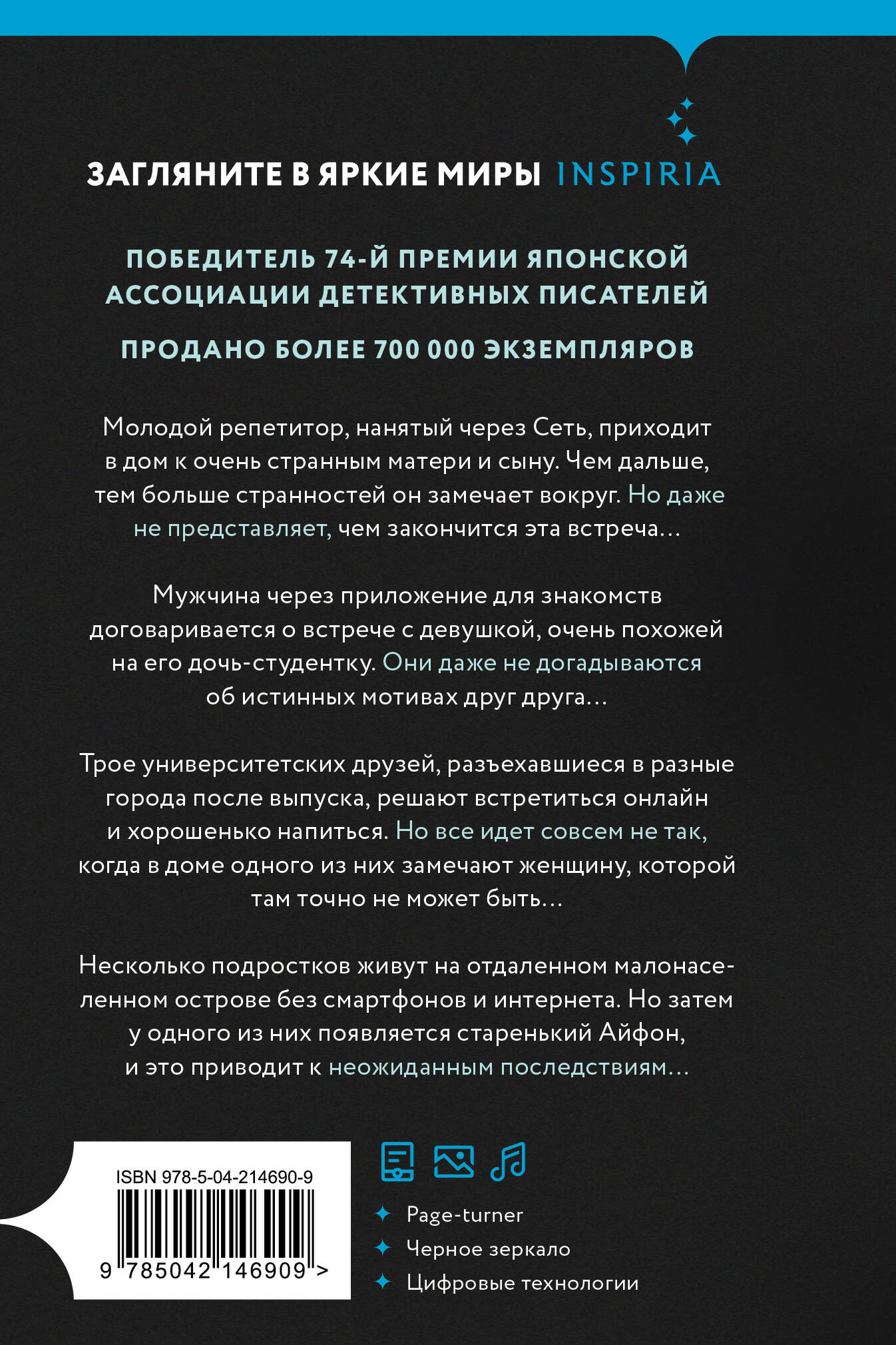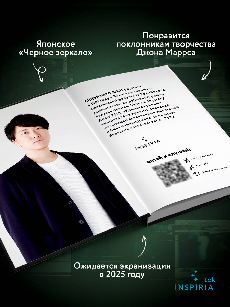 №1 бестселлер японского Amazon в жанре. №6 среди всех бестселлеров японского Amazon! ПОБЕДИТЕЛЬ 74-Й ПРЕМИИ ЯПОНСКОЙ АССОЦИАЦИИ ДЕТЕКТИВНЫХ ПИСАТЕЛЕЙ. НОМИНАНТ НА ПРЕМИЮ ЯПОНСКИХ КНИГОТОРГОВЦЕВ 2023. САМЫЙ ПРОДАВАЕМЫЙ ЯПОНСКИЙ ДЕТЕКТИВ 2023 ГОДА. Идеальное чтение для поклонников сериалов «Черное зеркало» и «Сумеречная зона». По книге готовится экранизация со звездами j-pop. Если очень долго вглядываться в Интернет, он начнет вглядываться в тебя. Молодой репетитор, нанятый через Сеть, приходит в дом к очень странным матери и сыну. Чем дальше, тем больше странностей он замечает вокруг. Но даже не представляет, чем закончится эта встреча… Мужчина через приложение для знакомств договаривается о встрече с девушкой, очень похожей на его дочь-студентку. Они даже не догадываются об истинных мотивах друг друга… Трое университетских друзей, разъехавшиеся в разные города после выпуска, решают встретиться онлайн и хорошенько напиться. Но все идет совсем не так, когда в доме одного из них замечают женщину, которой там точно не может быть… Несколько подростков живут на отдаленном малонаселенном острове без смартфонов и интернета. Но затем у одного из них появляется старенький «Айфон», и это приводит к неожиданным последствиям… _________________________________________________________ СИНЪИТИРО ЮКИ родился в 1991 году в Канагаве, окончил юридический факультет Токийского университета. За дебютный роман получил премию Shincho Mystery Award 2018. «Комната правды» выиграла 74-ю премию Японской ассоциации детективных писателей и была номинирована на премию Японских книготорговцев 2023. «События развиваются максимально непредвиденно, и удивление не пропадает. Мир этих историй буквально сбивает с ног. В этом настоящая крутизна Синъитиро Юки!» - Мисима Масаюки, "Keibunsha Saijoten" «Талантливая личность, за которой стоит следить! Взлет Синъитиро Юки не остановить! Автор мастерски использует магию тайны, сплетает воедино и внезапность, и ужас, и эмоции, и все вместе они вырисовывают, проявляют очертания неконтролируемого современного мира. Раскрытые тайны, с жестокостью демонстрирующие время и людей, как в отполированном до совершенства зеркале, - доказательство того, что это мастерски написанный шедевр». - Удагава Такуя, "Tokiwa Shobō" «Чувствуешь, что непременно произойдет что-то нехорошее, даже тело стремится к такому исходу». - Сайто Кадзуя, "Kinokuniya"| Издательство | ООО "Издательство "Эксмо" |