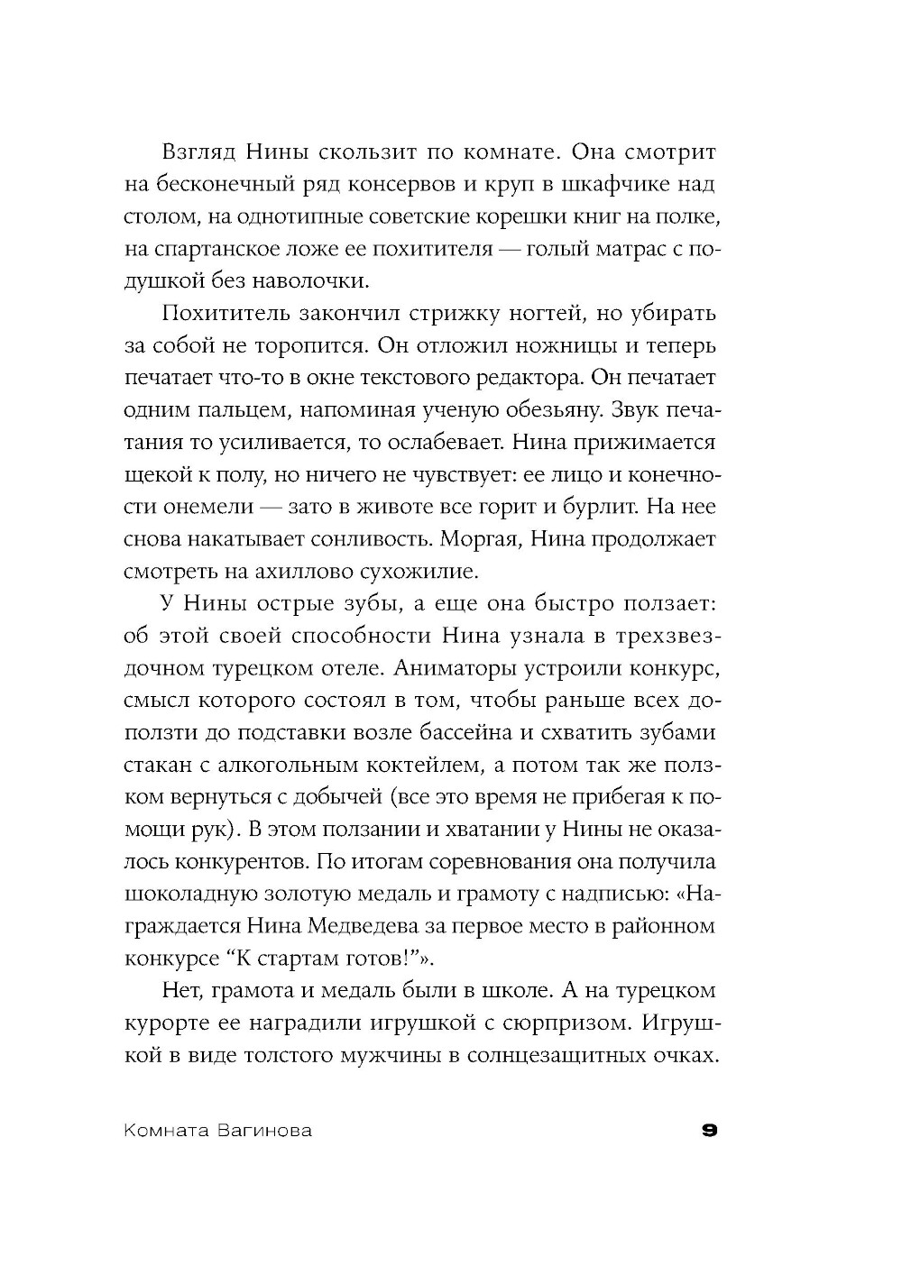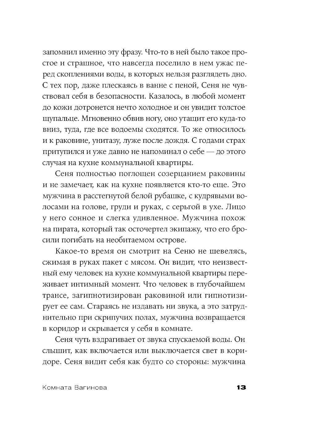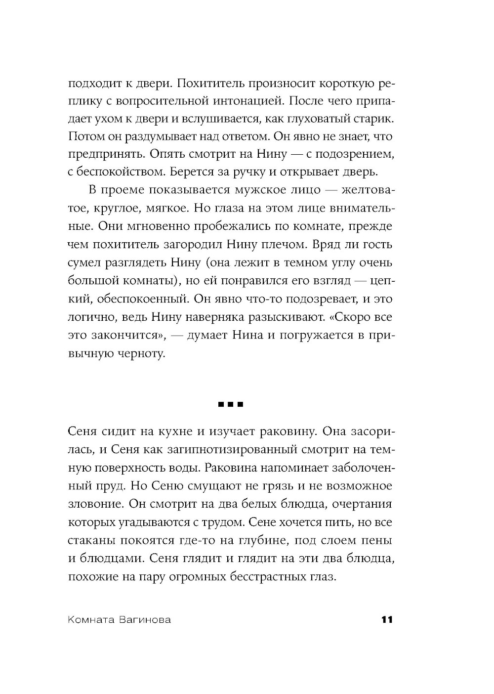 «Комната Вагинова» сочетает в себе мистический триллер и черную комедию, действие ее разворачивается в петербургской коммуналке. Молодой филолог Сеня решает заселиться в квартиру на набережной канала Грибоедова, ту самую, где жил писатель Константин Вагинов, чтобы написать его биографию. Соседями его оказываются весьма странные персонажи: полубезумный одинокий поэт, девушка, ведущая блог про своего енота, итальянец-алкоголик и отрешенный любитель античной философии. А за дверью одной из комнат кто-то насильно удерживает девушку. Удастся ли ей освободиться?| Издательство | Альпина Паблишер |
