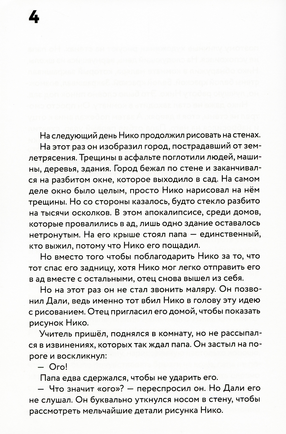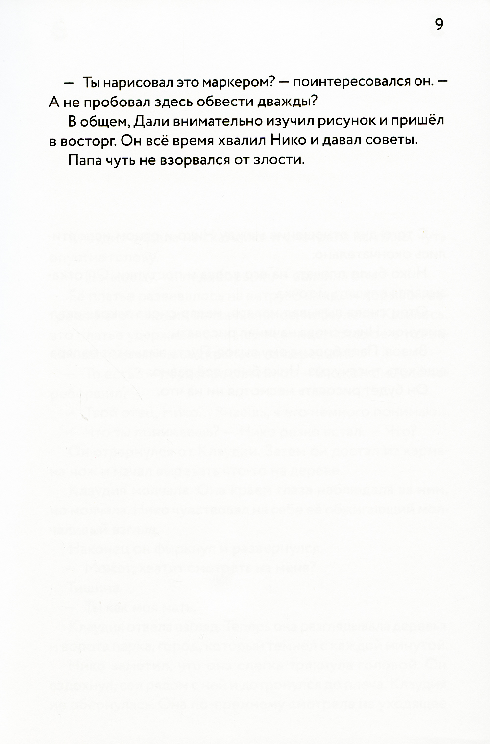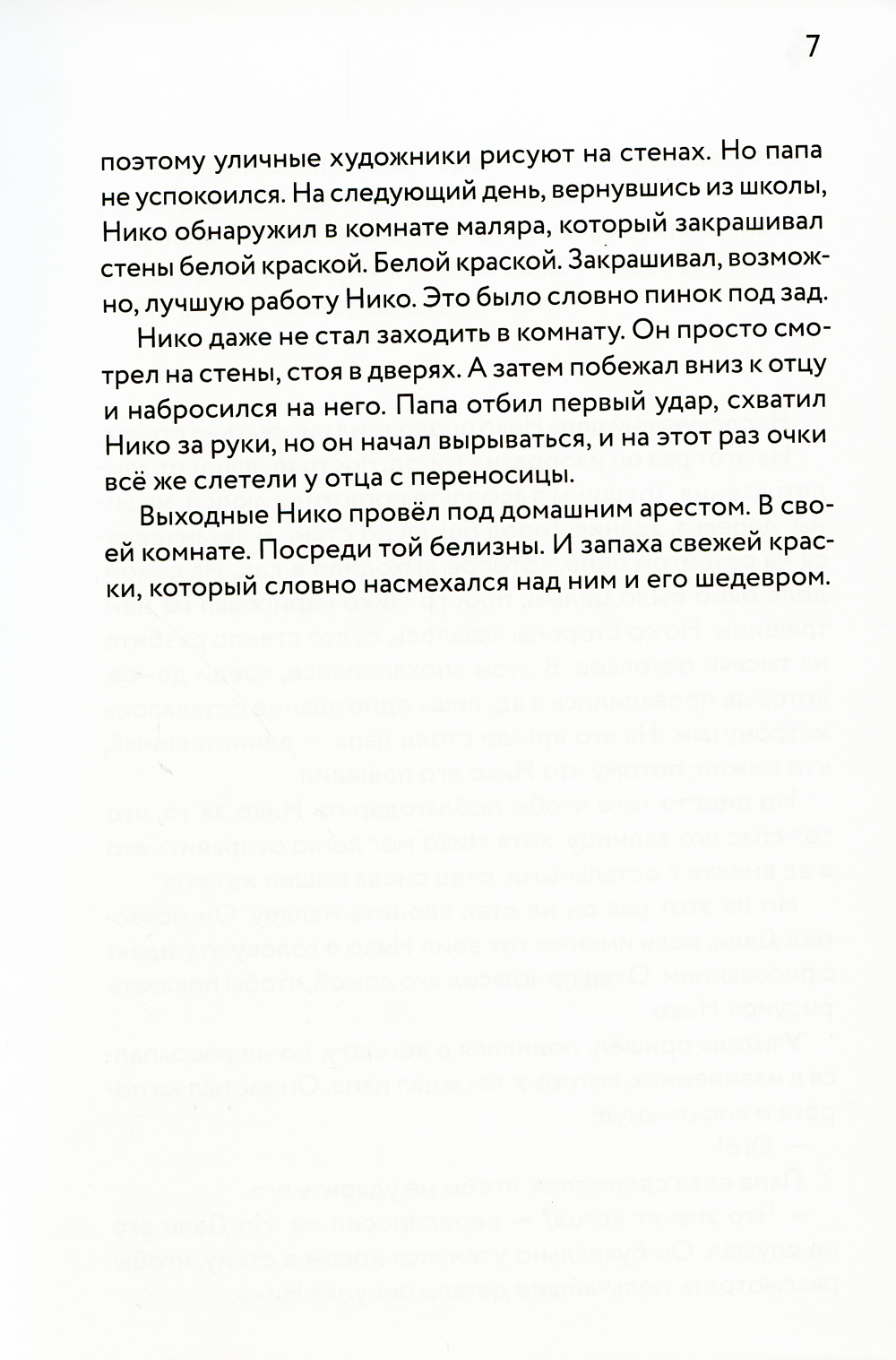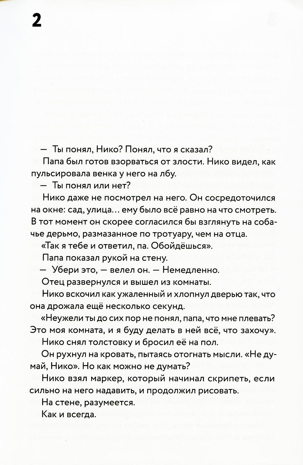 Каждые выходные, уже который месяц, маляр приходит в этот дом с ведром белой краски и поднимается в одну и ту же комнату - закрашивать рисунки на стенах. И чем этому парню, Нико, не угодила бумага? Конечно, в шестнадцать многие бунтуют против родителей, но стены-то зачем портить? Маляр заканчивает работу и спускается по лестнице, чувствуя спиной тяжелый взгляд подростка - тот смотрит не то ему вслед, не то на мрачного отца, ждущего у дверей. «До встречи», - говорит маляр. Он знает, что через неделю вернется. Только три человека способны понять Нико: лучший друг Лео, любимая девушка Клаудия и учитель рисования Дали. Только маркер на стене способен выразить его чувства. Но скоро в черно-белый мир Нико ворвется красная краска. Скоро станет ясно, что опасные игры - это не проявление силы. Что просьба о помощи - не признак слабости. И герою придется заглянуть внутрь себя - будто в глаза волку. Итальянский писатель Габриэле Клима (родился в 1967 году) уже известен российскому читателю по книге «Солнце сквозь пальцы». Он часто поднимает в своих произведениях, адресованных подросткам, социальные проблемы и на равных беседует с молодыми читателями о социальной интеграции, психическом здоровье, ограниченных физических возможностях, миграции - и делает это мастерски. Роман «Комната волка» стал финалистом премии ORBIL в категории «young adult». Серия «YA» (young adults) объединяет книги, которые могли быть написаны только в наши дни, - острые, дерзкие, злободневные романы-вызовы для читателей от 16 и старше. Оформил серию известный дизайнер, сооснователь фестиваля Typomania Александр Васин.| Издательство | ИД КомпасГид |