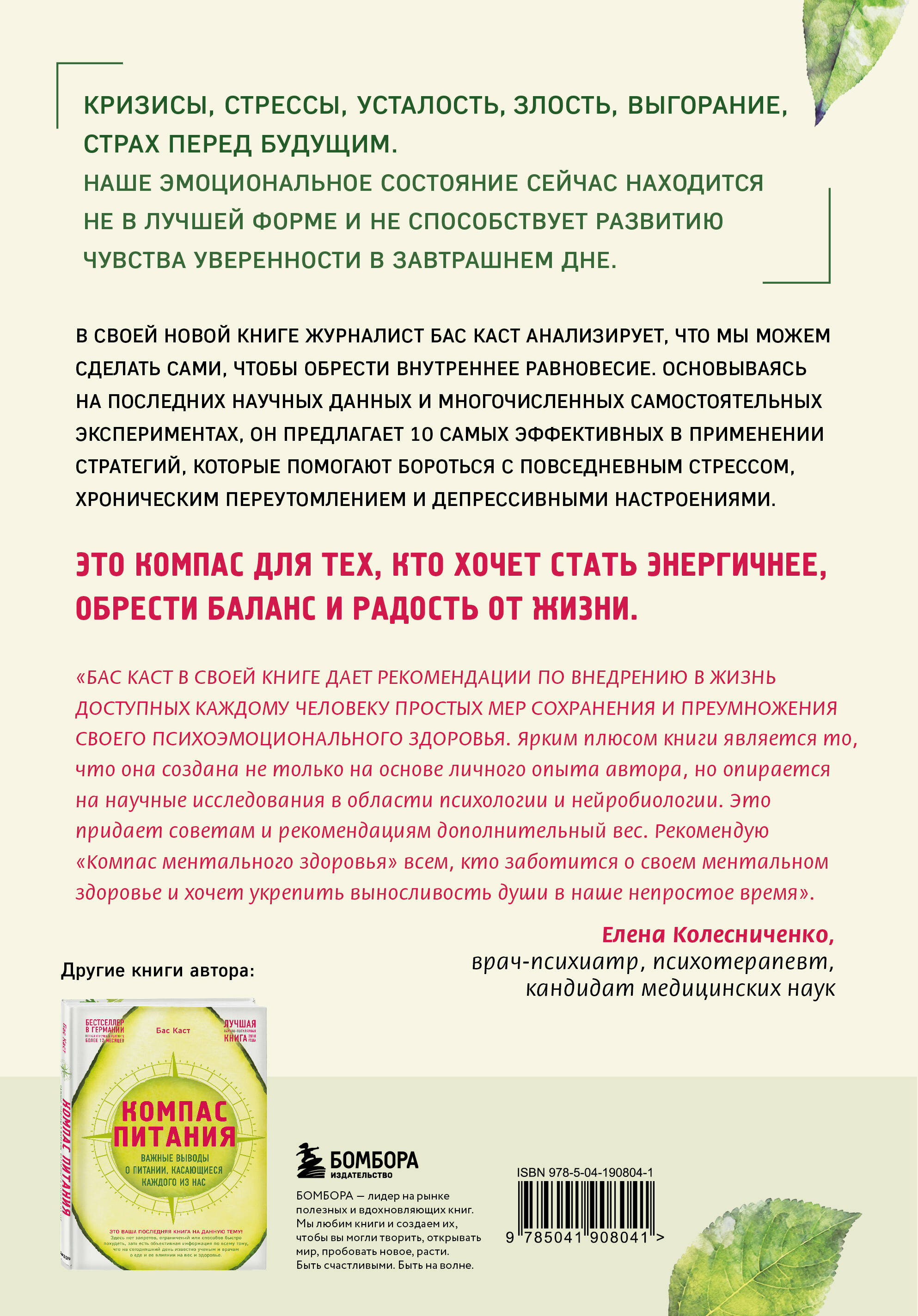 «Когда человек сталкивается с депрессией и находит силы обратиться к психиатру или психотерапевту, он редко получает рекомендации по изменению образа жизни. Да, здоровый тип питания и физические нагрузки неспособны заменить современные лекарственные препараты и психотерапию в вопросах лечения депрессии, но изменения образа жизни тоже важны для поддержания эмоциональной стабильности. Бас Каст в своей книге даёт рекомендации по внедрению в жизнь доступных каждому человеку простых мер сохранения и преумножения своего психоэмоционального здоровья. Ярким плюсом книги является то, что она опирается не только на личный опыт автора, но и на научные исследования в области психологии и нейробиологии. Это придает советам и рекомендациям дополнительный вес. Рекомендую "Компас для души" всем, кто заботится о своем ментальном здоровье и хочет укрепить выносливость души в наше непростое время». - ЕЛЕНА КОЛЕСНИЧЕНКО, врач-психиатр, психотерапевт, кандидат медицинских наук| Издательство | ООО "Издательство "Эксмо" |