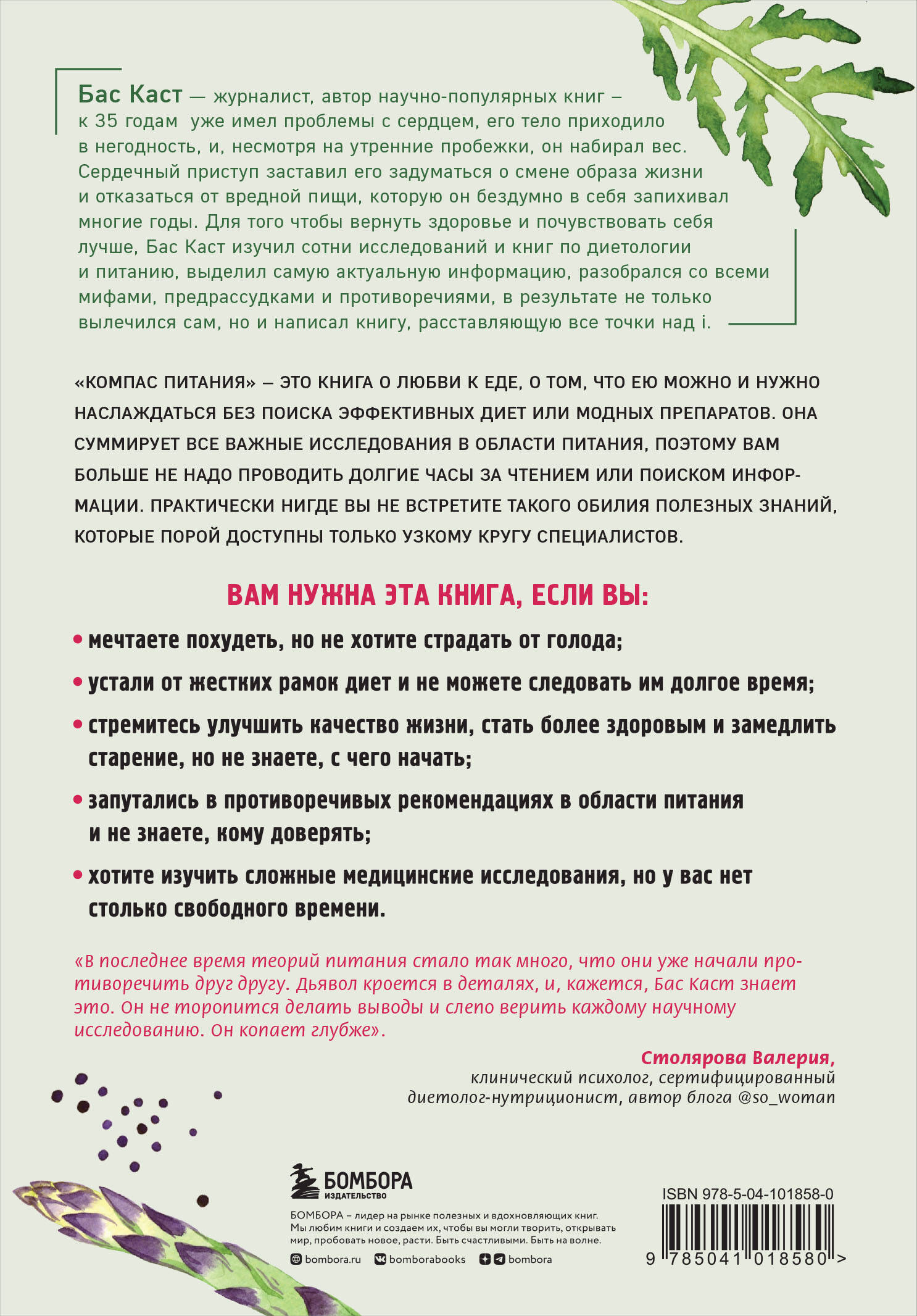 Об авторе: Бас Каст - журналист, автор научно-популярных книг. Из-за вредного питания и образа жизни в 35 лет перенес сердечный приступ, более того, несмотря на утренние пробежки, он активно набирал вес. Для того, чтобы вернуть свое здоровье, автор потратил несколько лет своей жизни на изучение сотен исследований и книг по диетологии и питанию, а затем структурировал все полученные знания в книге «Компас питания». Вопросы, на которые даст ответ книга: - В чем причина того, что в повседневной жизни мы съедаем больше, чем сжигаем? И как остановить и обратить этот процесс? - Неужели, чтобы сбросить пару лишних килограммов, нужно обязательно страдать от голода? - Как можно ни в чем себе не отказывать и предупредить появление лишнего веса? - Каковы секреты эффективной диеты с продолжительным действием? - Существуют ли такие продукты питания, которые заставляют нас стареть раньше времени? Награды: - Бестселлер в Германии: первая строчка в рейтинге более 12 месяцев. - Лучшая научно-популярная книга 2018 года. Особенности книги ЭТО ВАША ПОСЛЕДНЯЯ КНИГА НА ТЕМУ ПИТАНИЯ! Здесь нет запретов, ограничений или способов быстро похудеть, зато есть объективная информация по всему тому, что на сегодняшний день известно ученым и врачам о еде и влиянии на вес и здоровье.| Издательство | ООО "Издательство "Эксмо" |