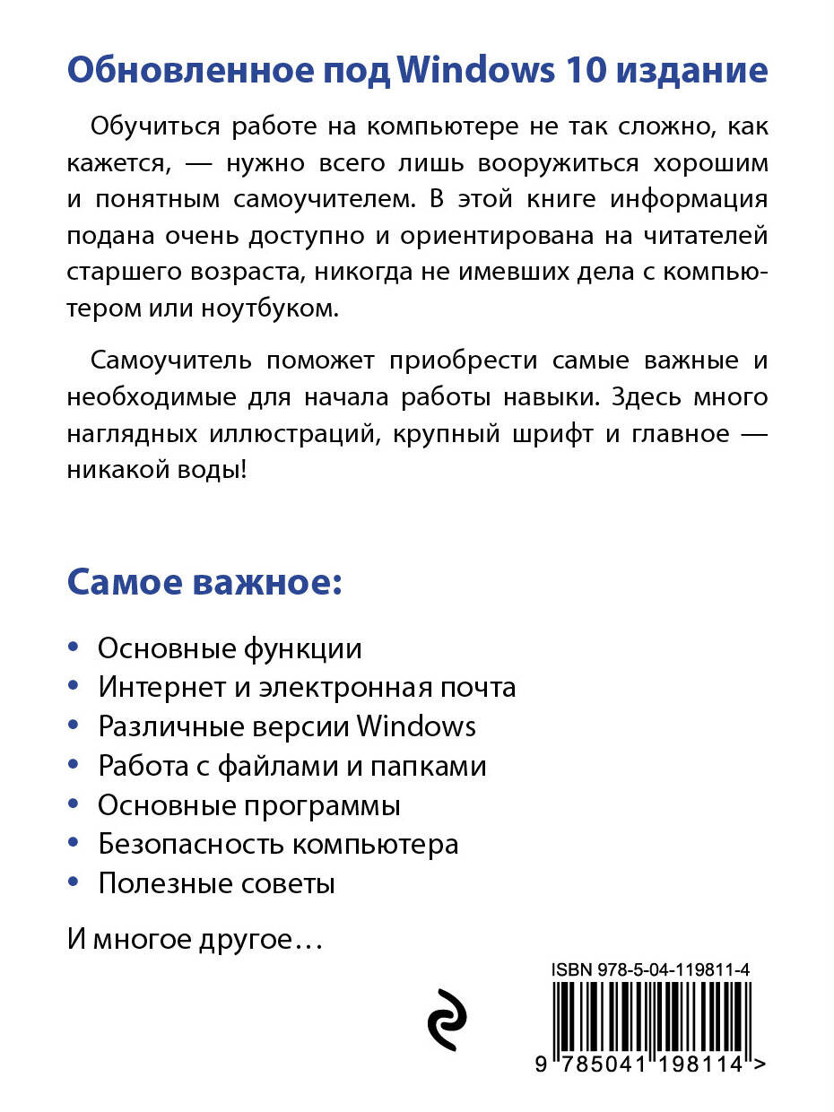 Обновленное под Windows 10 издание самого компактного и понятного карманного самоучителя по работе на компьютере и ноутбуке для пожилых людей. Крупный шрифт, хорошие наглядные иллюстрации, понятное изложение самой основной и важной для начала работы информации - ничего лишнего, но есть все самое необходимое.| Издательство | ООО "Издательство "Эксмо" |