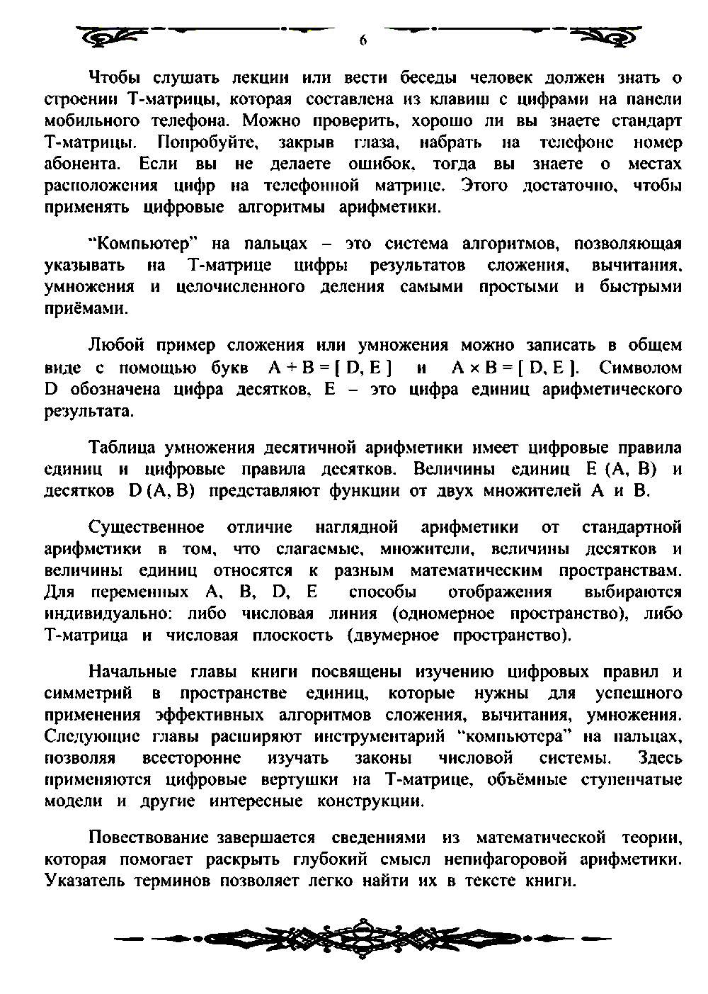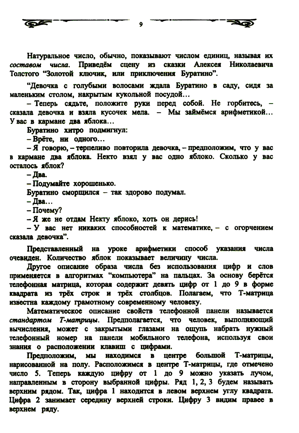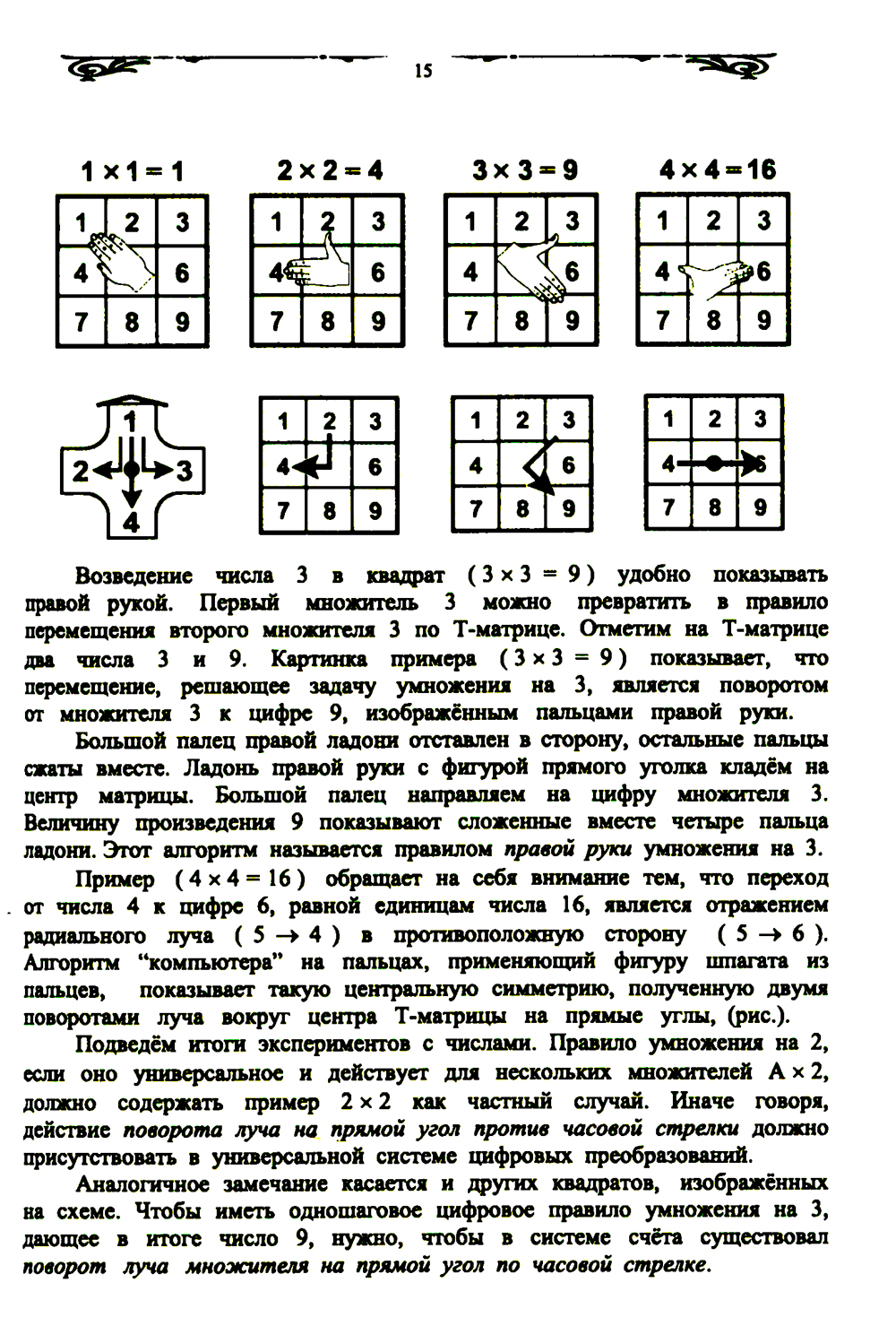 Книга посвящена описанию эффективных алгоритмов вычислений. Успех системе счёта «компьютера» на пальцах обеспечивают наглядные схемы и алгоритмы, показанные руками. Вычислительная работа из утомительного занятия превращается в захватывающую внимание игру с числами. Так, умножение на три 3 х А задаётся правилом правой руки, которое использует поворот на прямой угол радиальных лучей телефонной Т-маприцы. Кроме заученных фраз типа «дважды два - четыре», полезны цифровые правила, позволяющие мгновенно указывать цифры результатов сложения, вычитания, умножения и целочисленного деления. Сокращённые схемы вычислений позволяют увеличить скорость устного счёта в пять раз. Новый формат таблицы умножения - девятилистник - лучше таблицы Пифагора показывает симметрии поворотов чисел. Наглядные и выразительные визуальные образы в «компьютере» на пальцах сокращают время изучения таблицы умножения. Для юных математиков предлагается стихотворный арифметический букварь с цифровыми правилами умножения. Книга является основой учебного курса для школьников по технологии эффективного счёта. Наглядные иллюстрации помогут педагогам и родителям, обучающим детей арифметике. Книга будет полезна математикам, экономистам, физикам, инженерам, штурманам, психологам, философам и всем тем, кому интересны свойства чисел и предельные возможности человека в устном счёте.| Издательство | ЛЕНАНД |