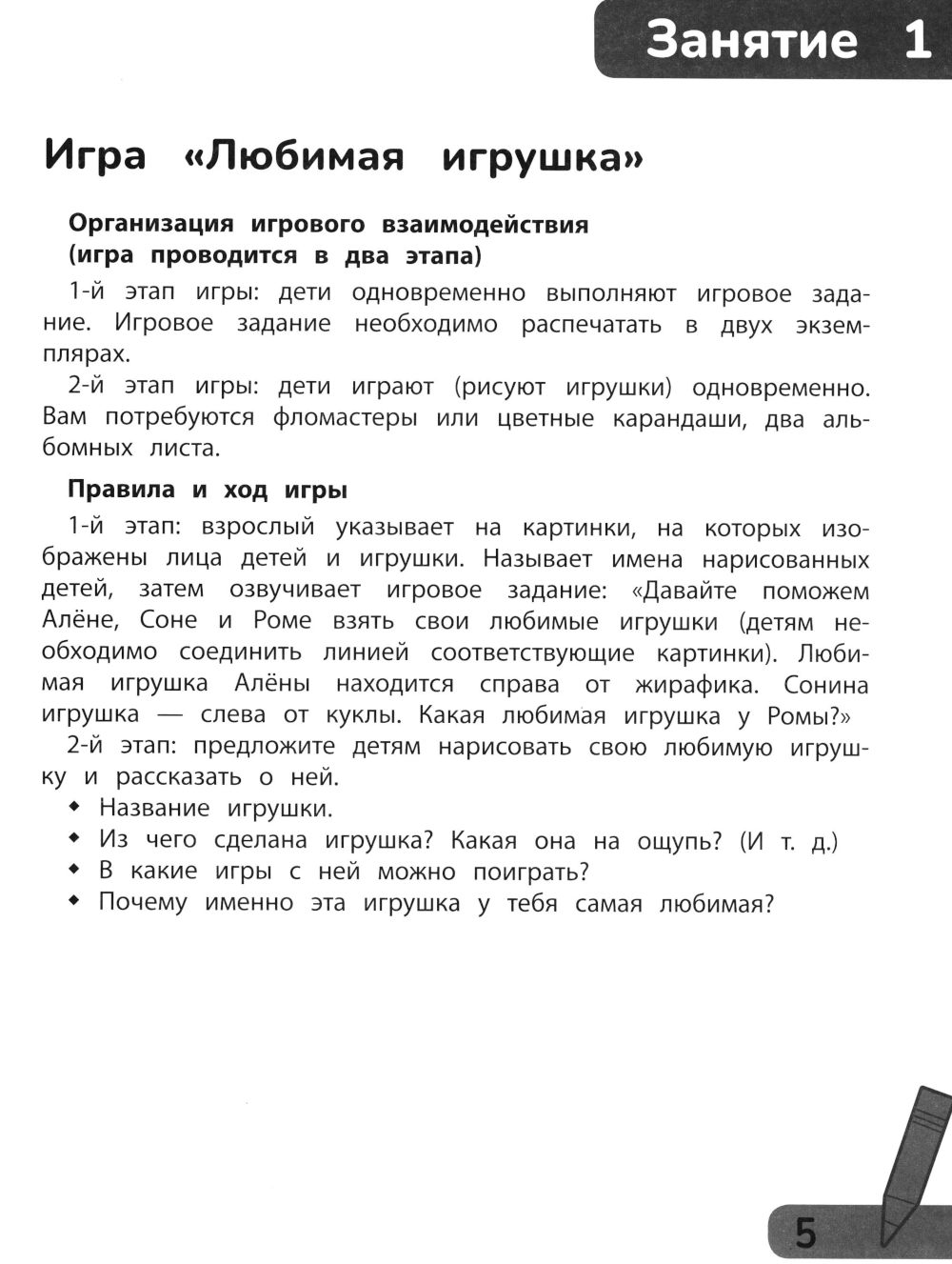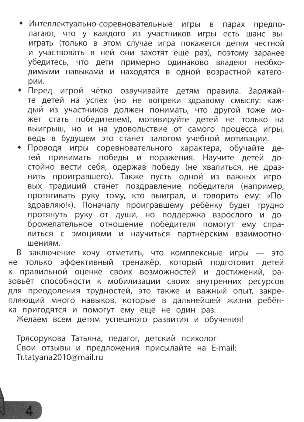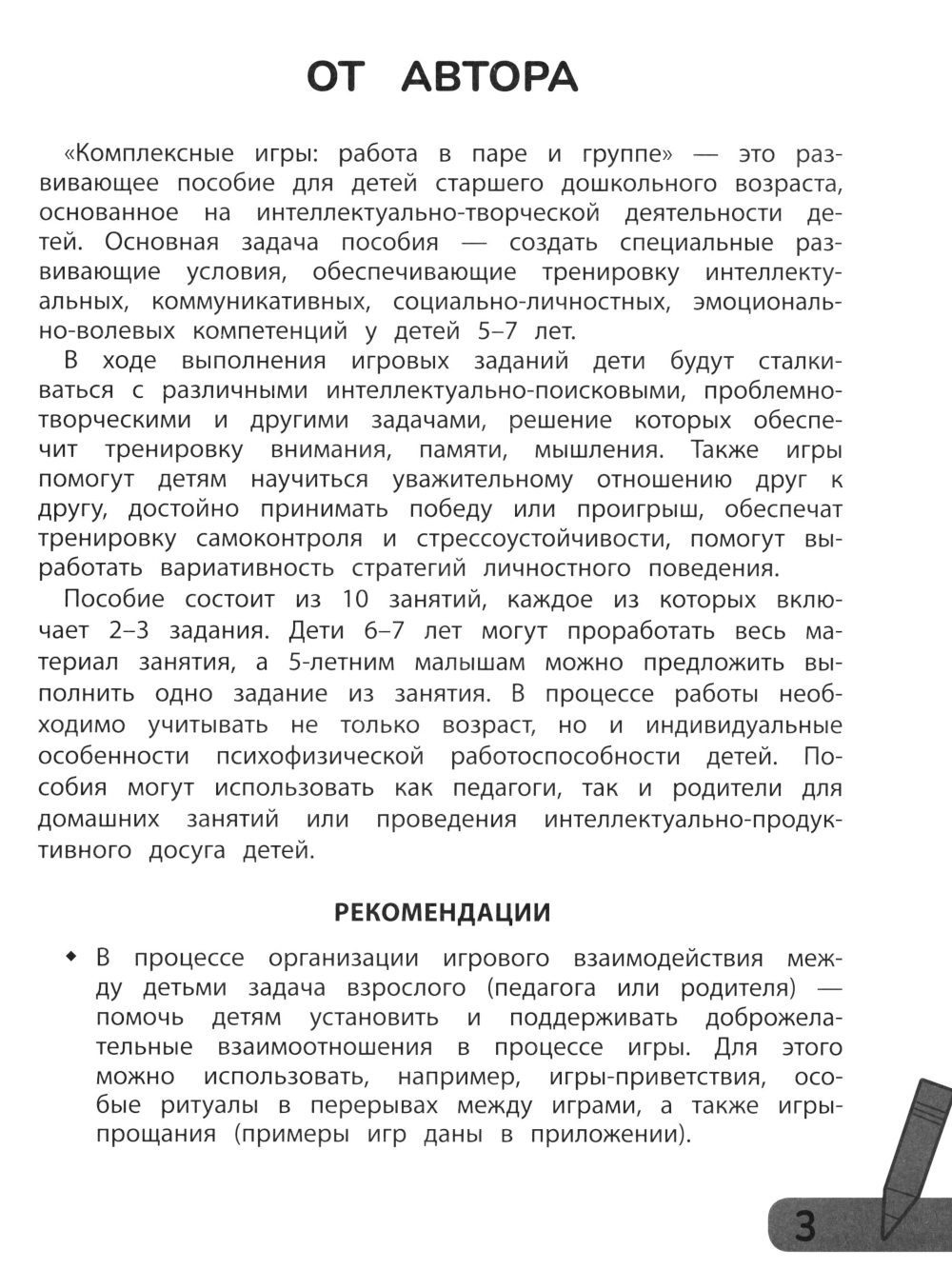 Старший дошкольный возраст - это период формирования социально-личностных компетенций у детей. Одной из важных и необходимых ребенку компетенций является умение устанавливать и поддерживать сотрудничество в ходе интеллектуальной деятельности. В пособии представлены 10 занятий, которые помогут педагогу или родителю организовать игровое взаимодействие между детьми, способствующее их интеллектуальному, личностному и социальному развитию. Благодаря комплексным играм дети научатся выслушивать и считаться с мнением друг друга, решать конфликты, поддерживать доброжелательную коммуникацию. Игры подготовят детей к правильной оценке своих возможностей и достижений, помогут стать более гибкими, терпимыми, внимательными к себе и другим людям. Пособие рекомендовано для педагогов дошкольных учреждений и родителей для домашних занятий с ребенком.